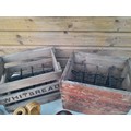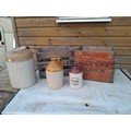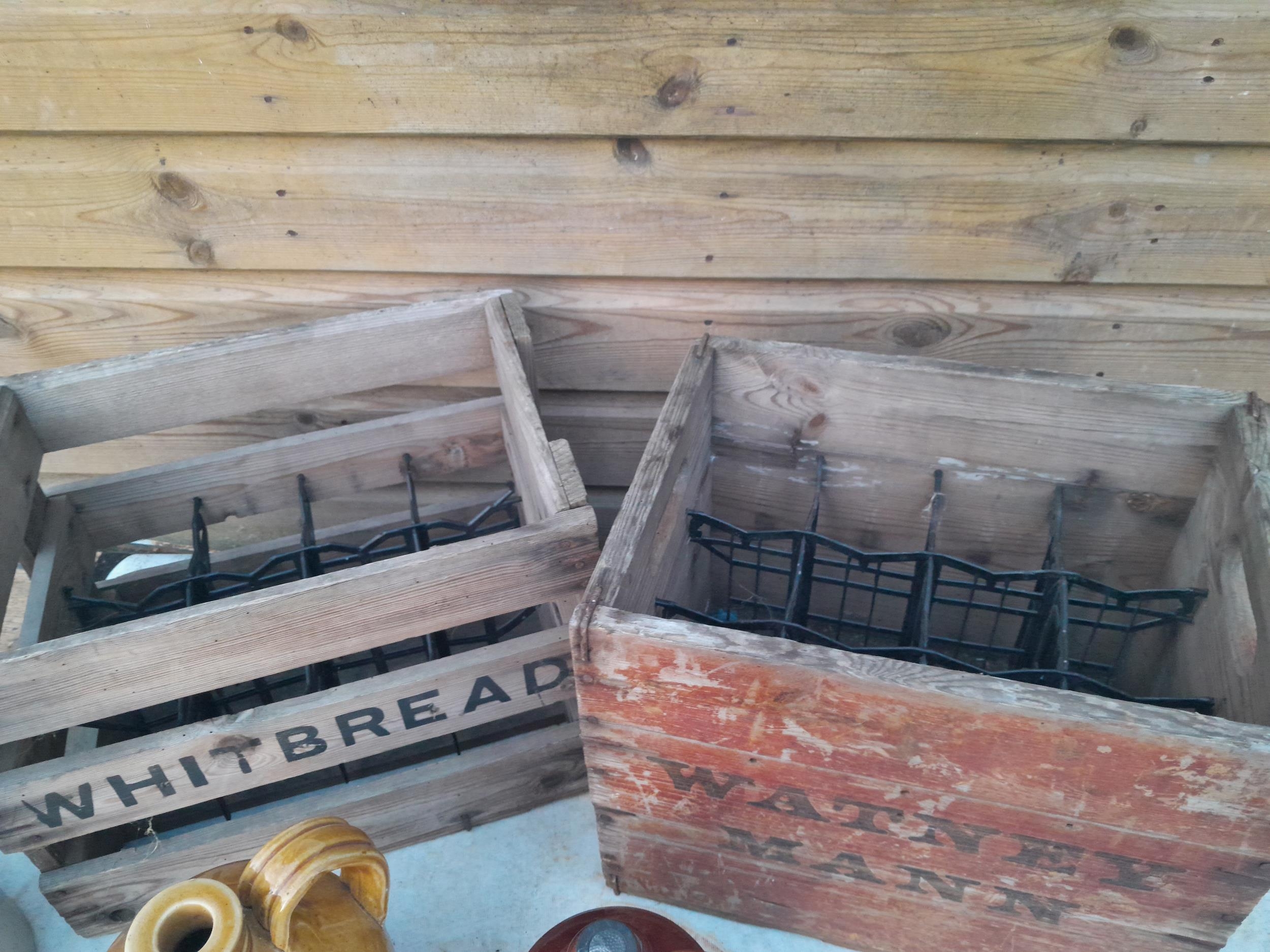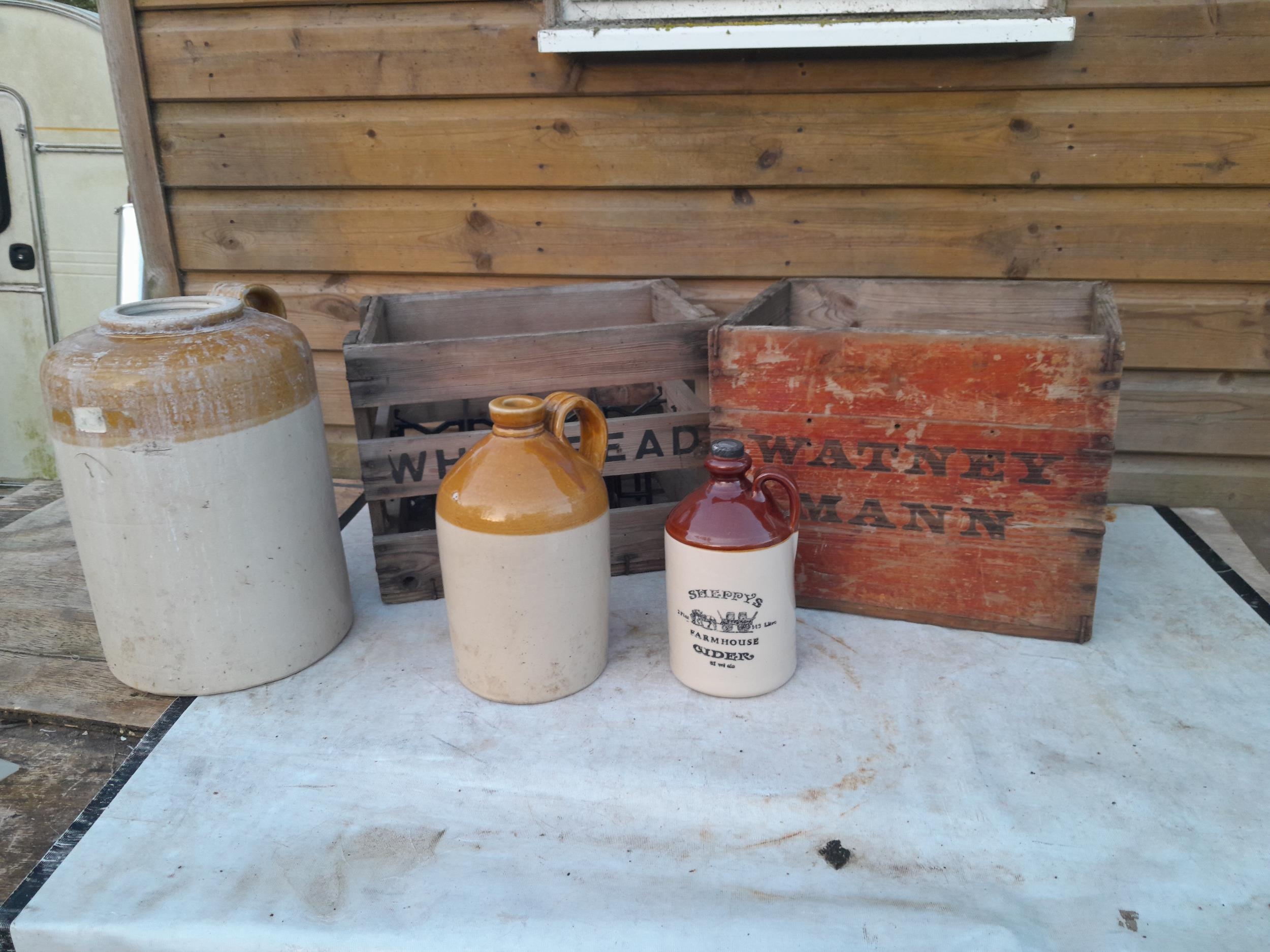 Vintage wooden beer crates x 2, advertising modern and vintage non advertising stoneware flagons and storage jar, etc.
