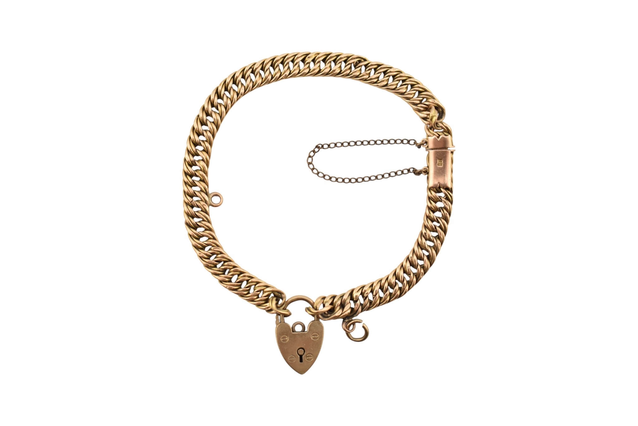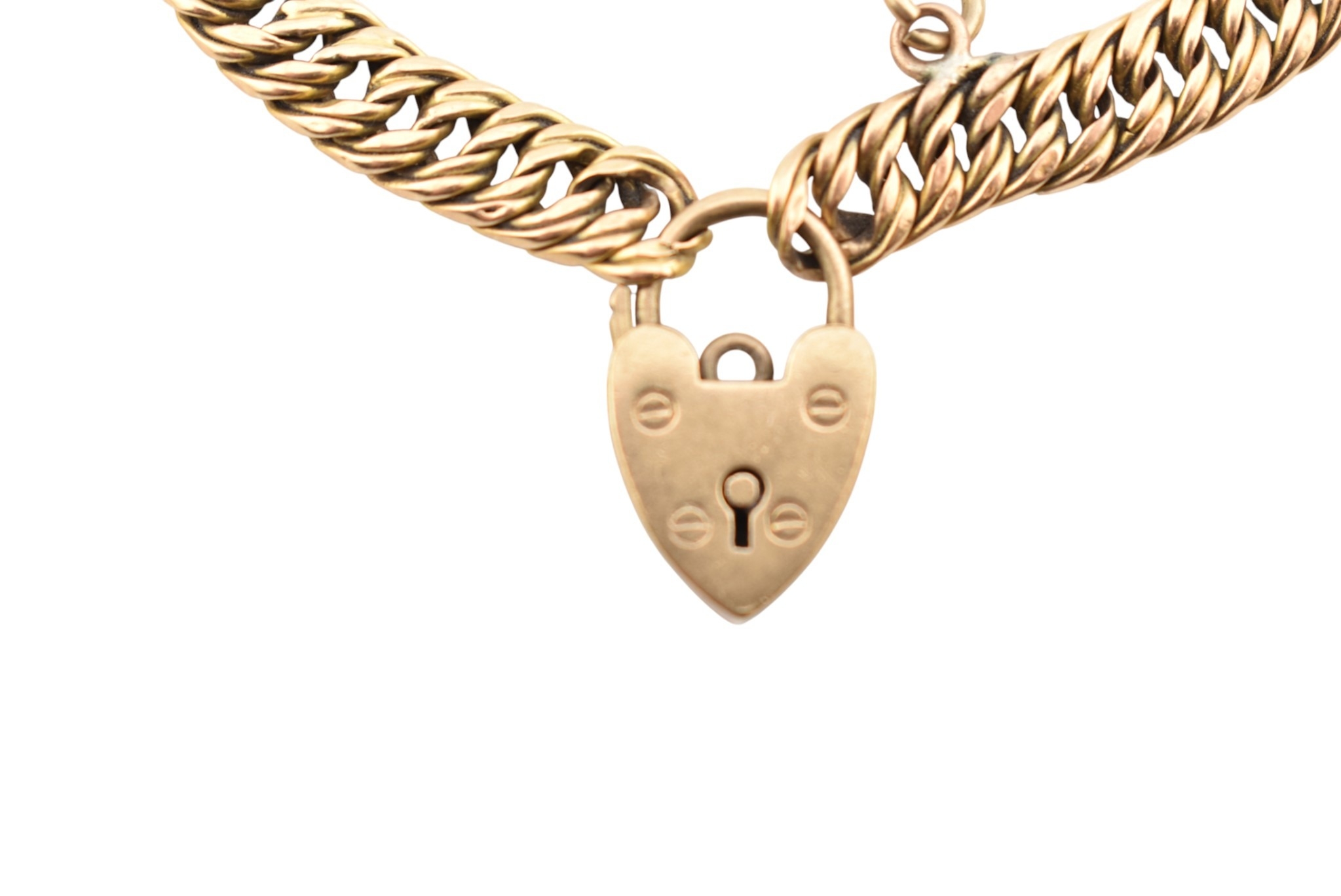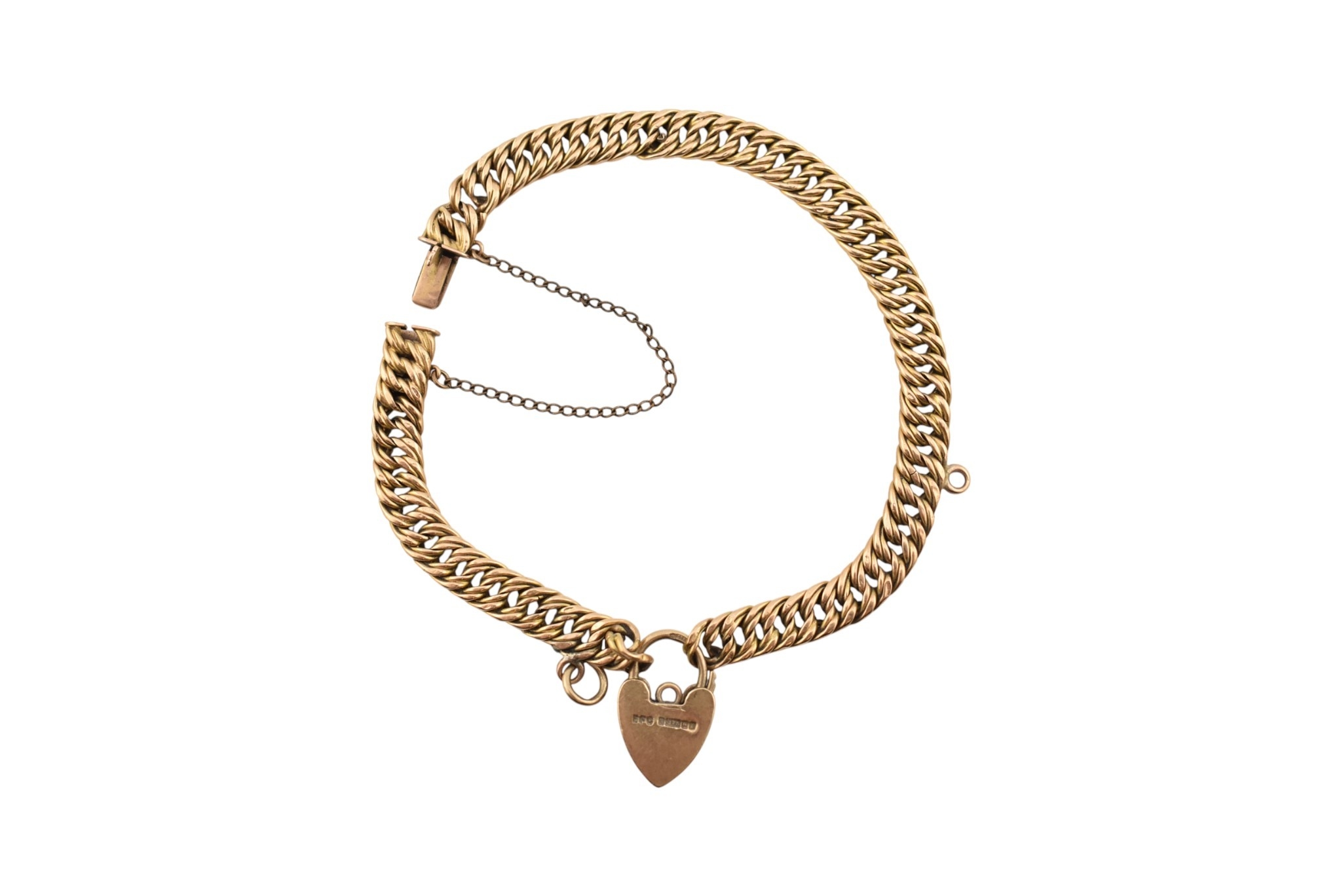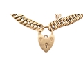 A 15ct gold fancy link bracelet adorned with a 9ct gold hallmarked heart padlock. Stamped 15ct to bracelet. Weight 14.5g, measures 18cm approx. AF