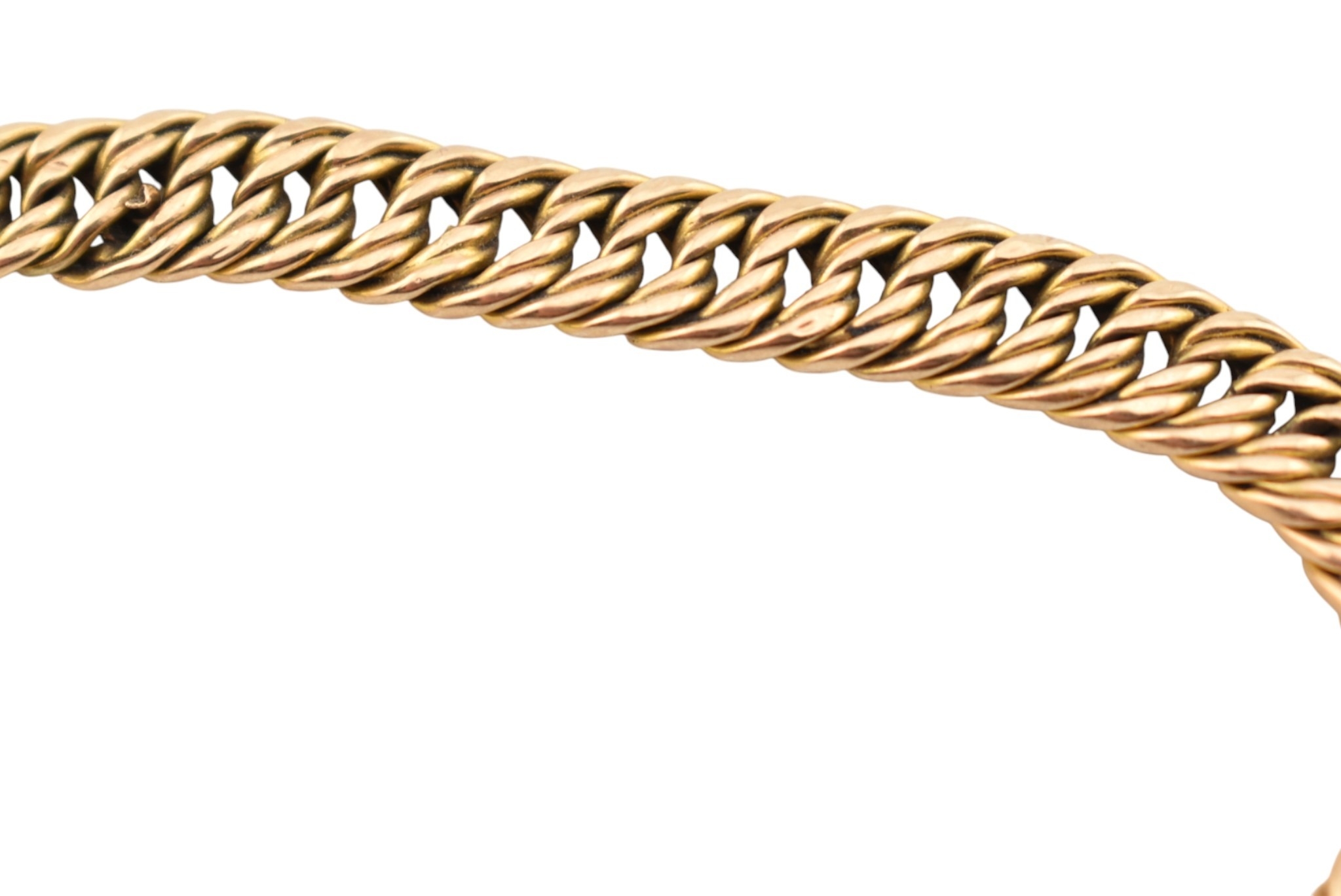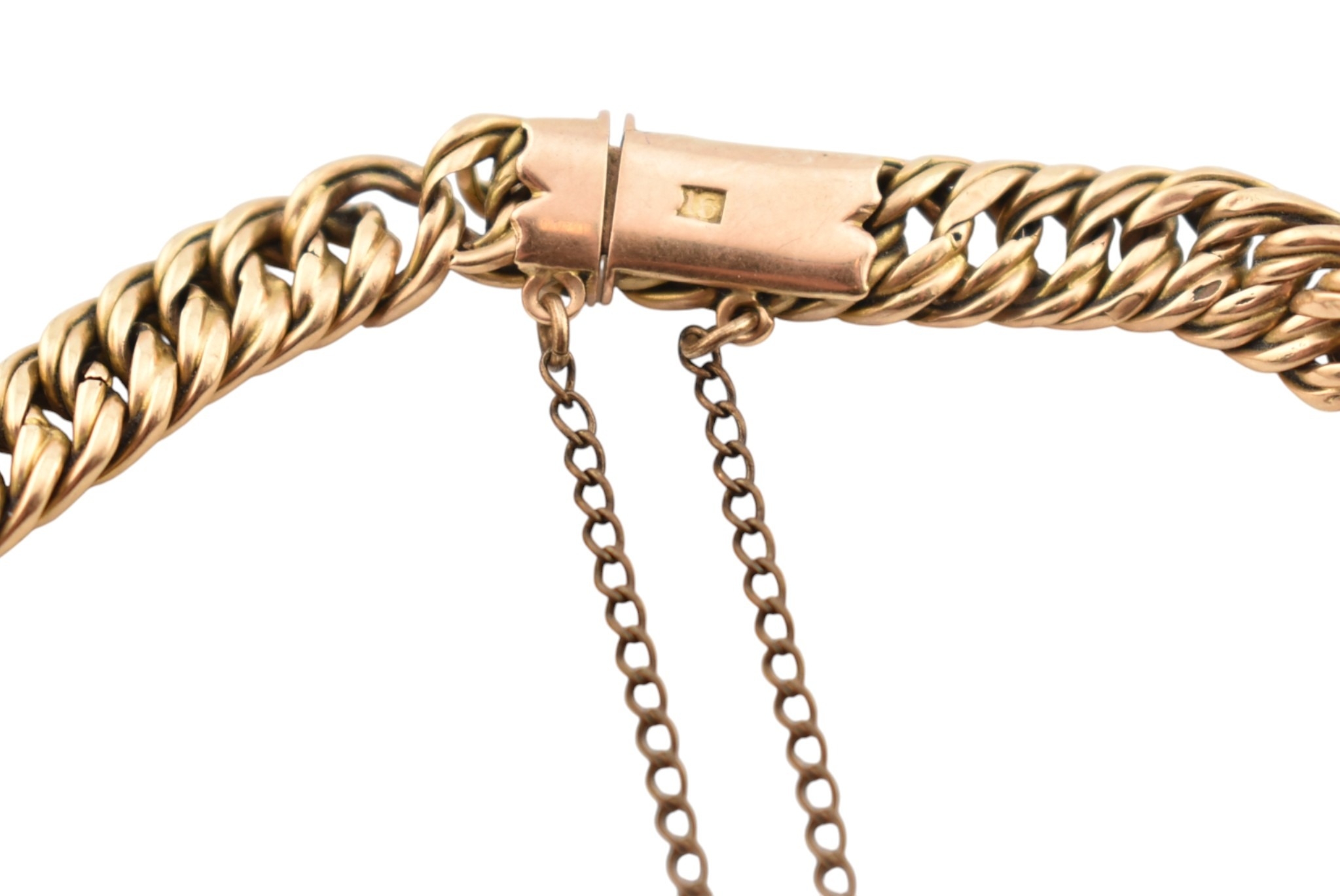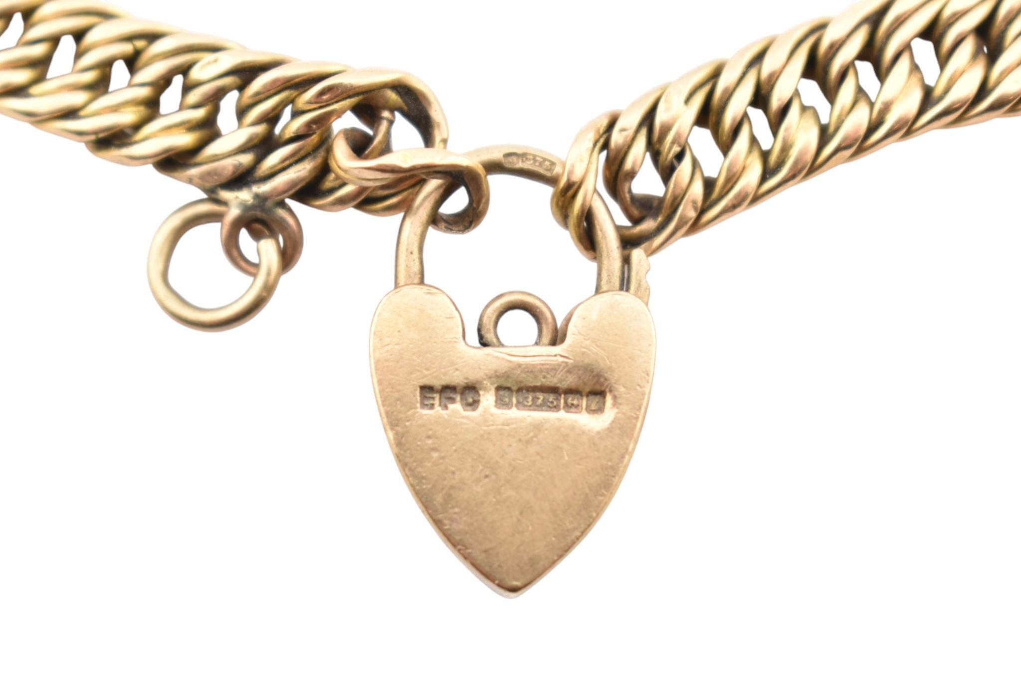 A 15ct gold fancy link bracelet adorned with a 9ct gold hallmarked heart padlock. Stamped 15ct to bracelet. Weight 14.5g, measures 18cm approx. AF