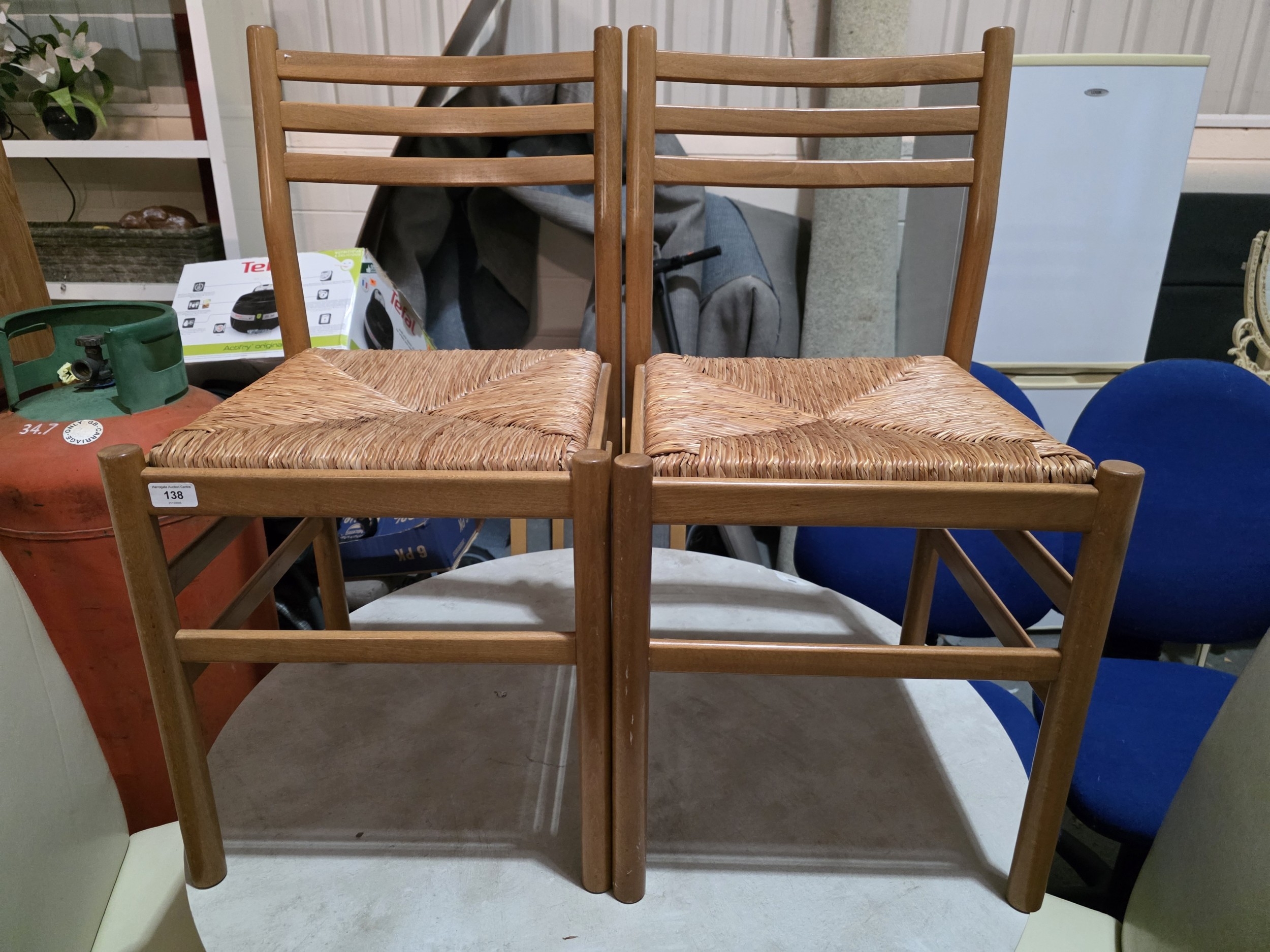 PAIR OF WOODEN LADDER-BACK CHAIRS WITH RUSH SEAT