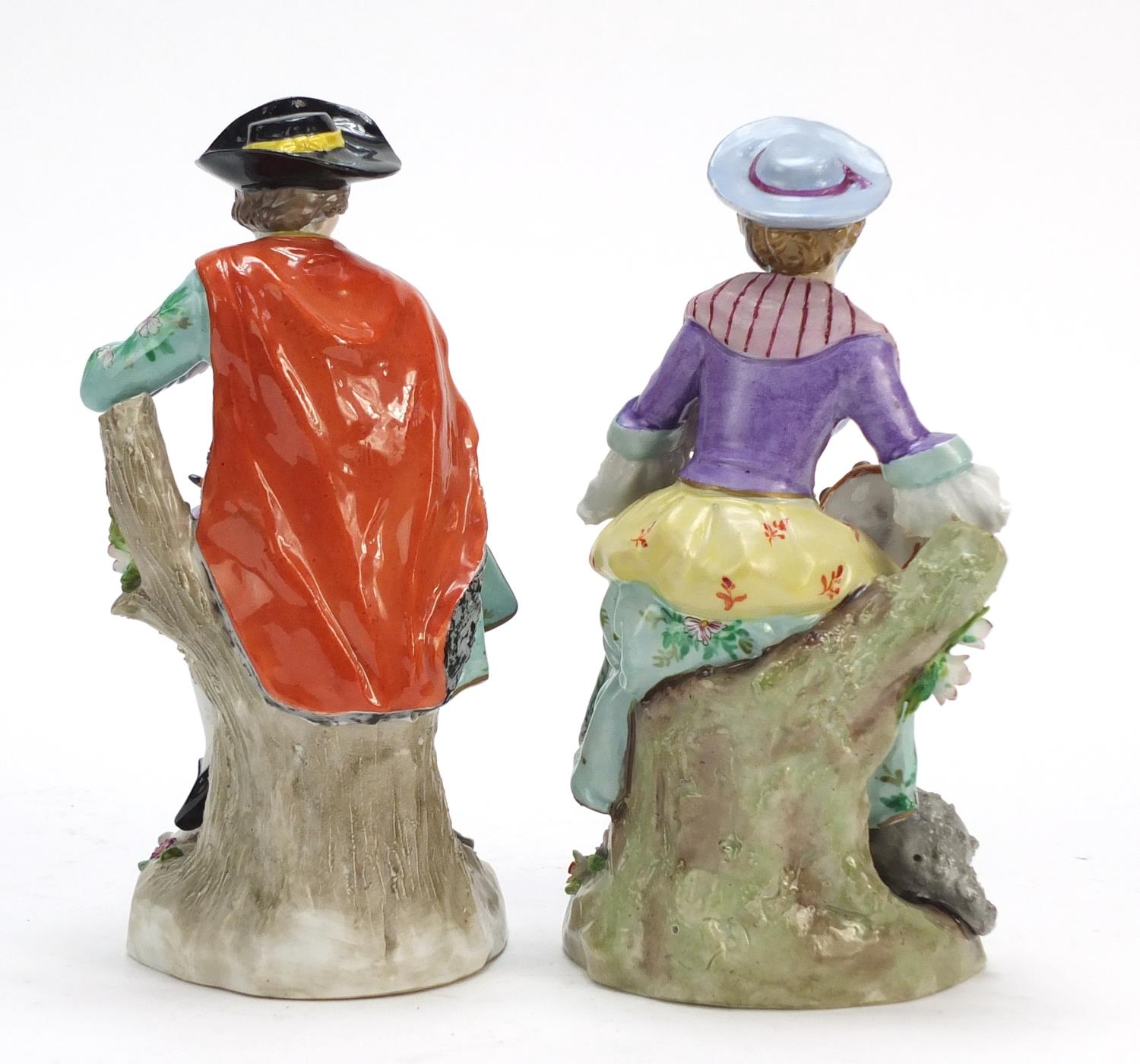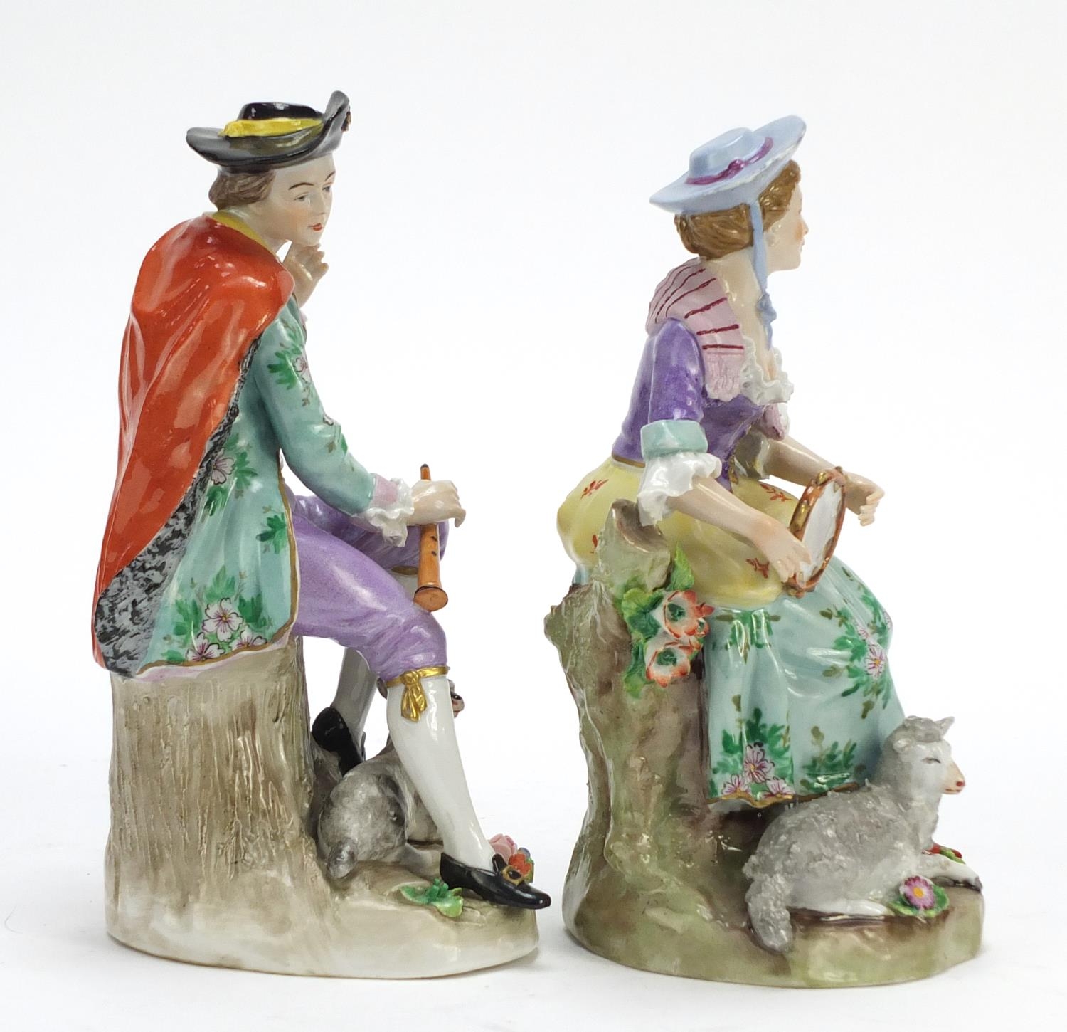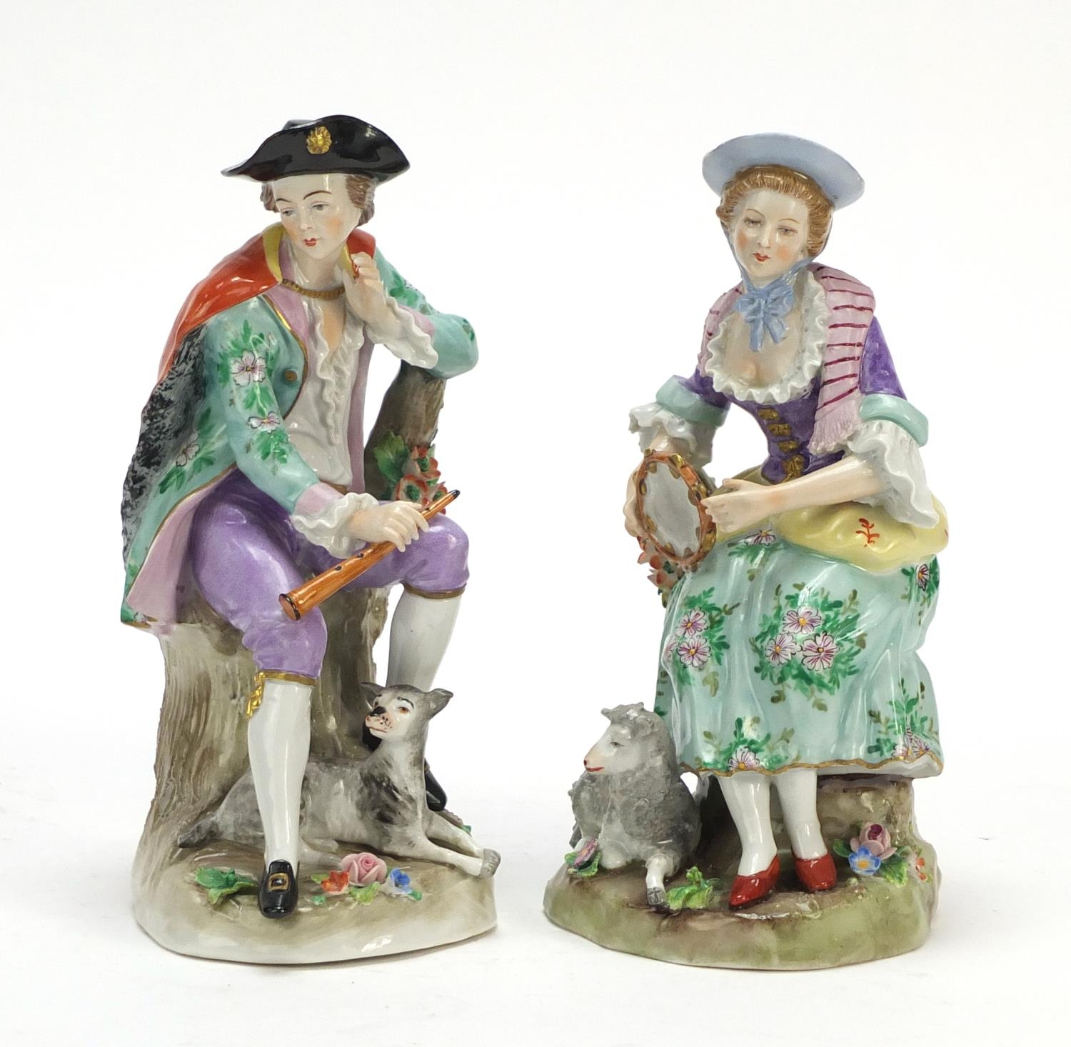 Pair of German hand painted Dresden porcelain figures of a shepherd and shepherdess, 19cm high