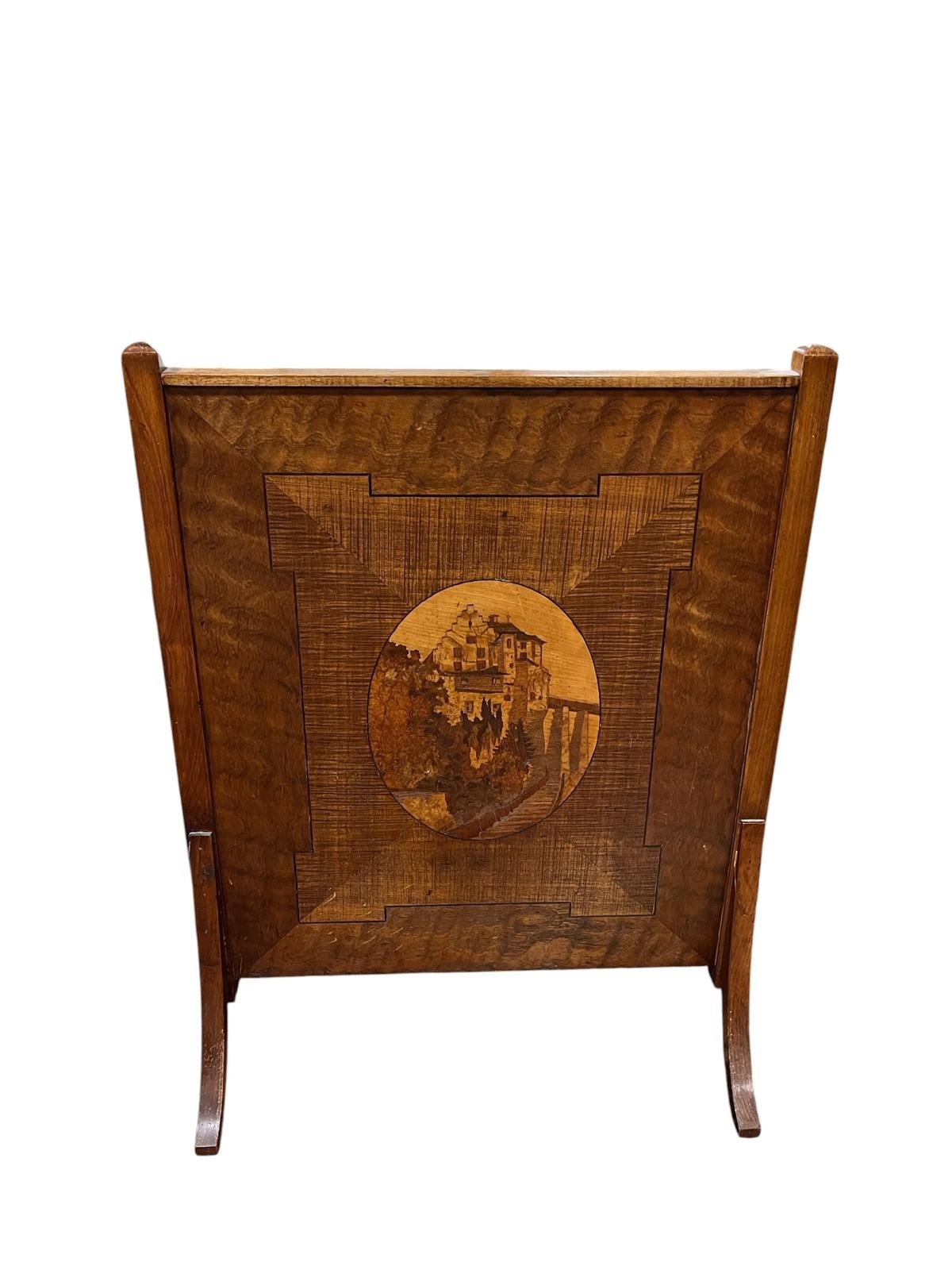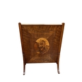 A VINTAGE MAHOGANY INLAID FIRESCREEN of rectangular form inset with an oval inlaid panel on splayed legs 78cm (h) x 61cm (w)