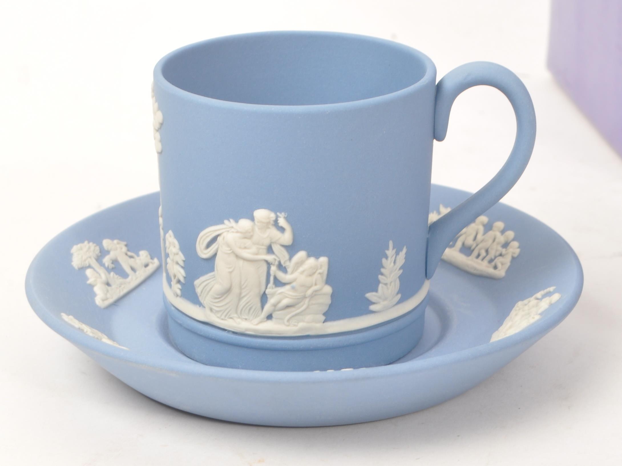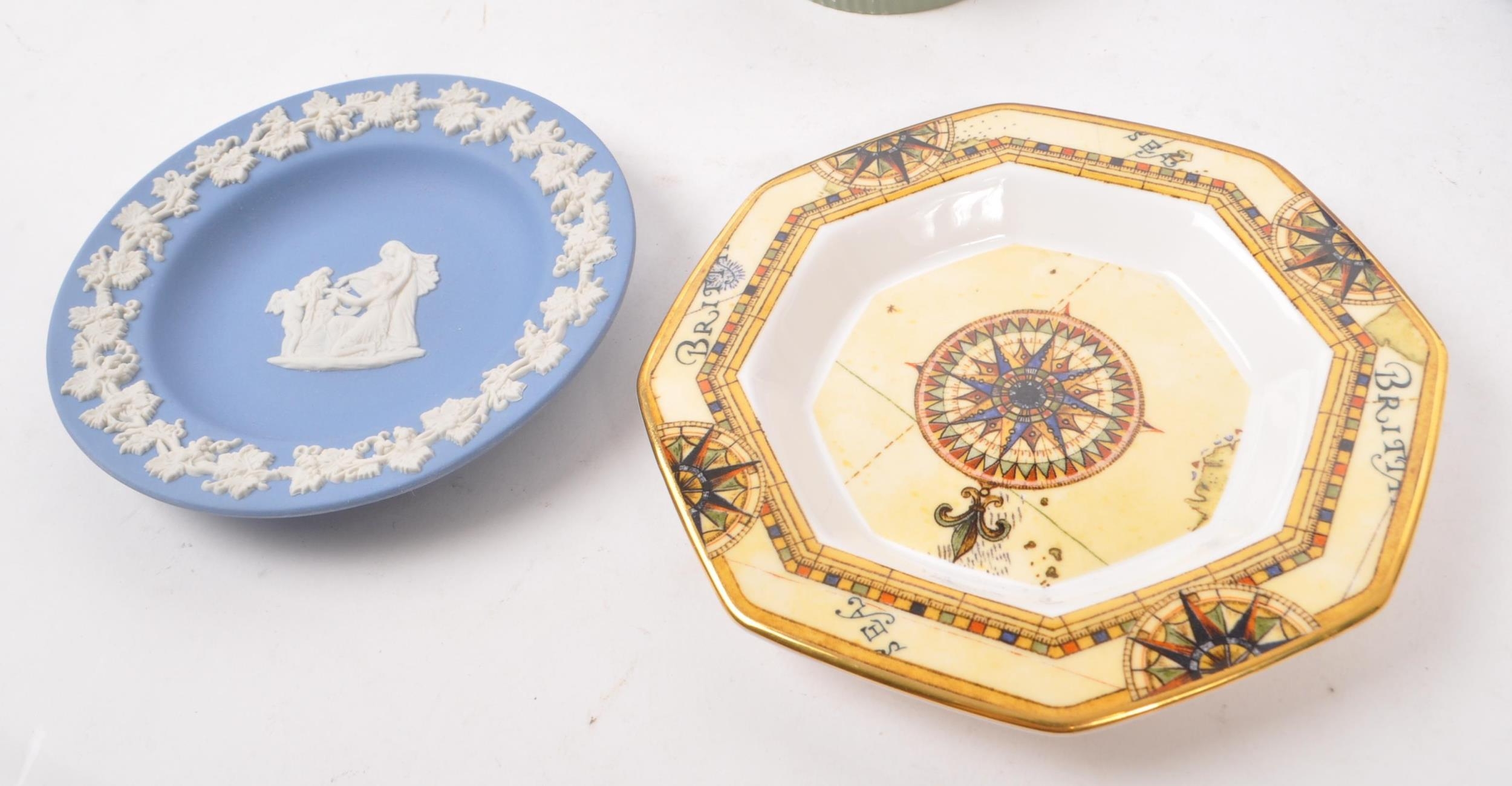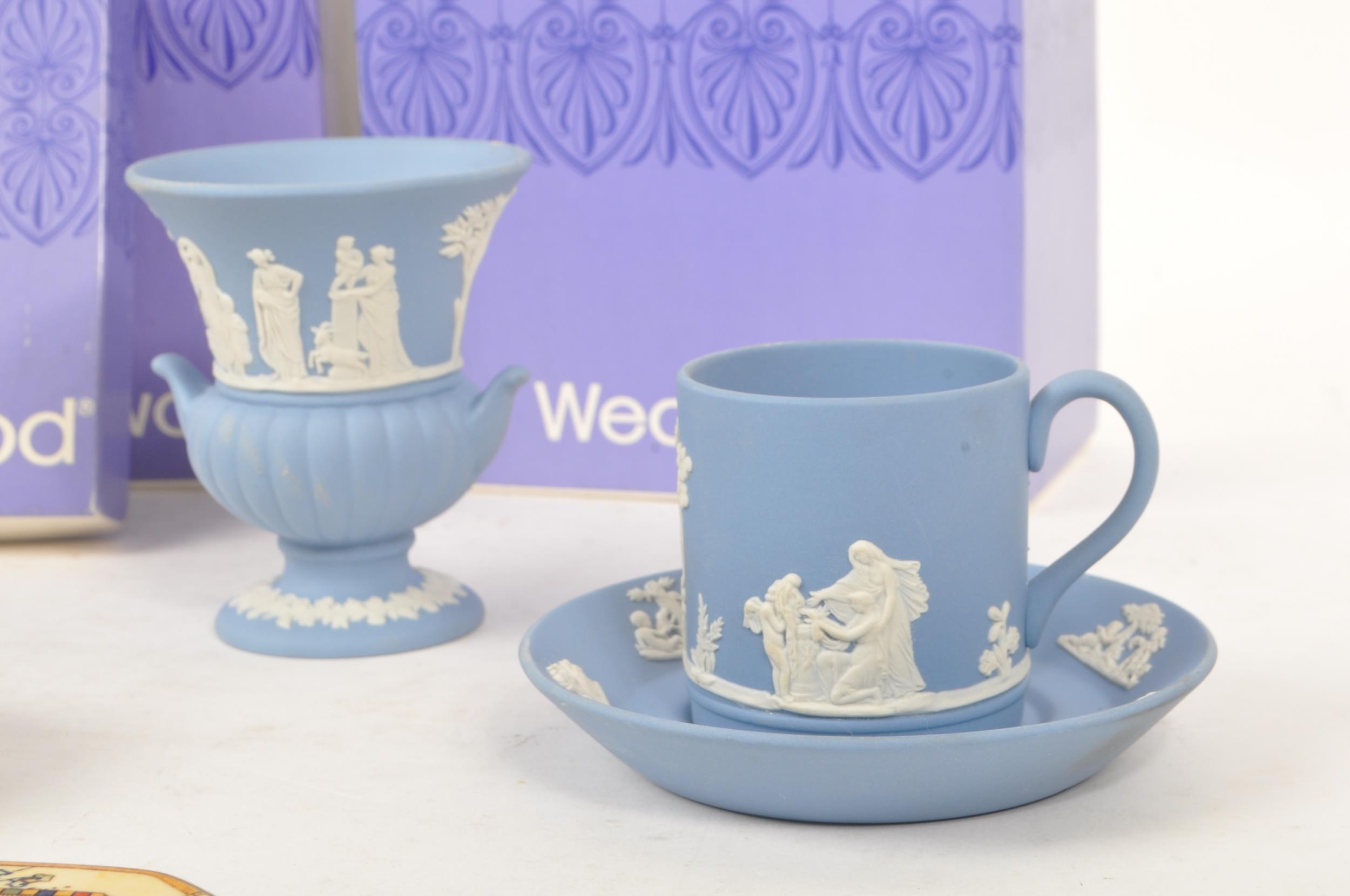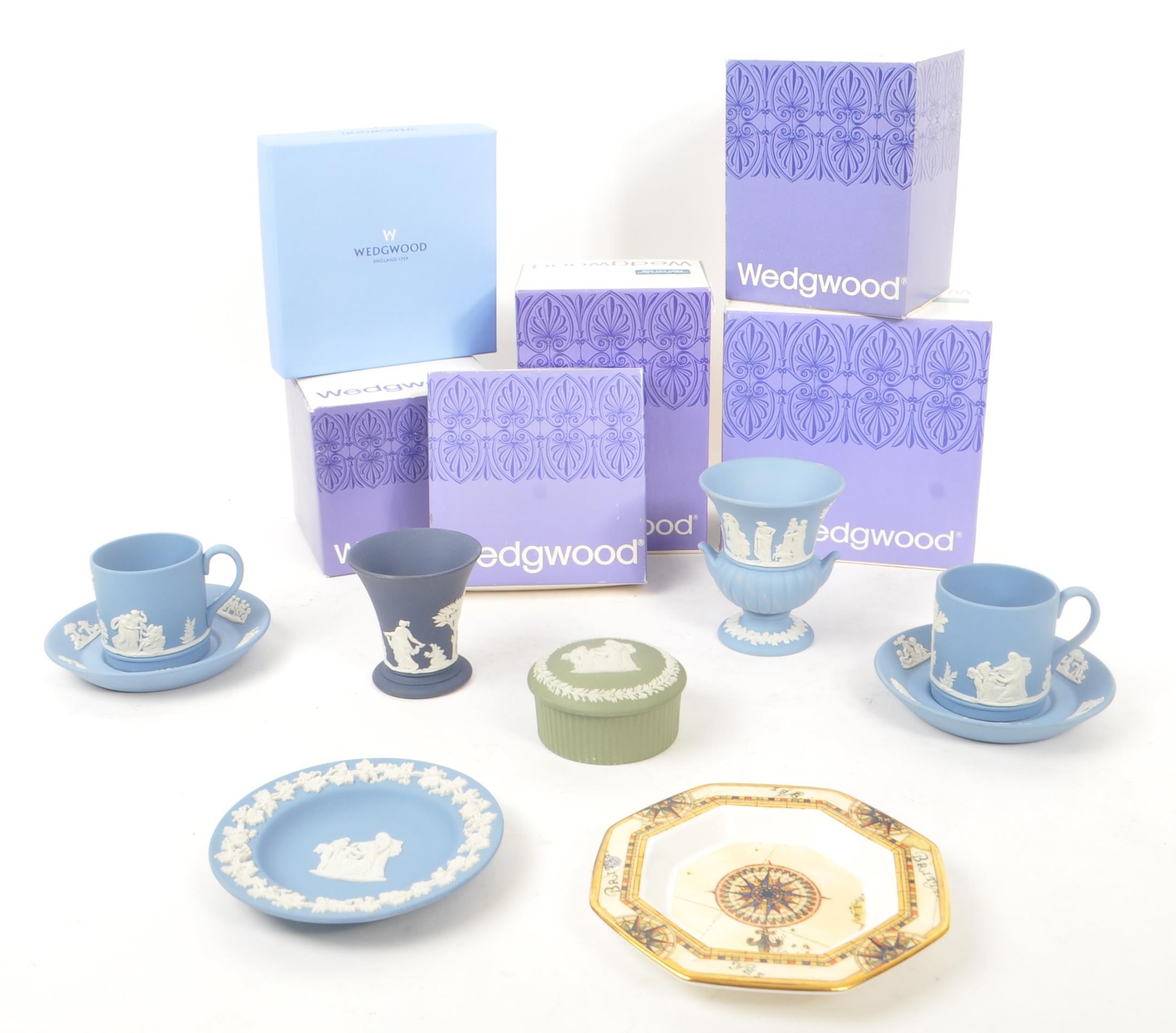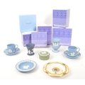 Wedgwood - Jasperware - A collection of vintage 20th Century porcelain china Wedgwood Jasperware items. To include two cups and saucers, sweet dish, miniature vase all in typical pale blue and white colourway, accompanied by a posy pot (portland blue) and small lidded pot in green. Together with a Wedgwood Atlas tray dish. Most items in original boxes. Largest item measuring approx.13cm x 13cm.