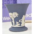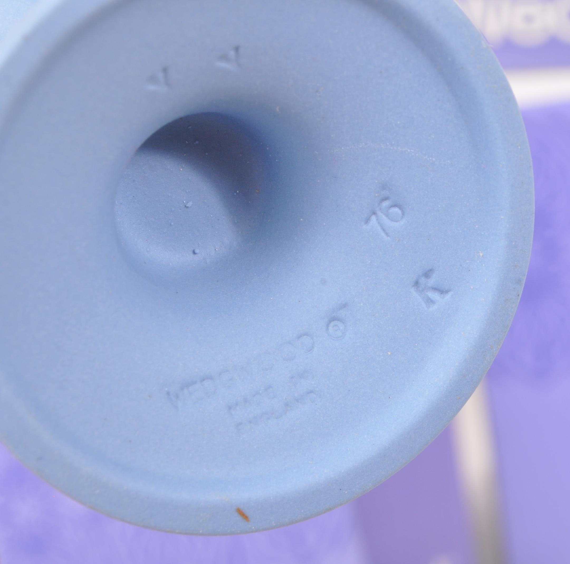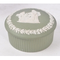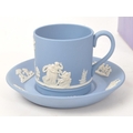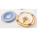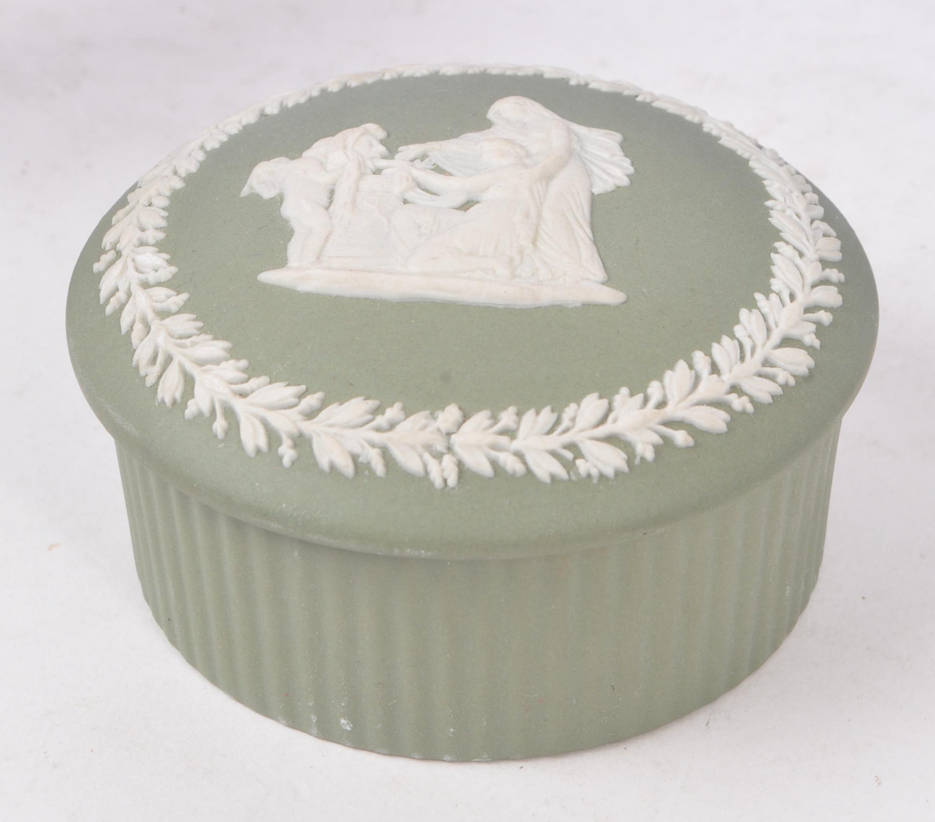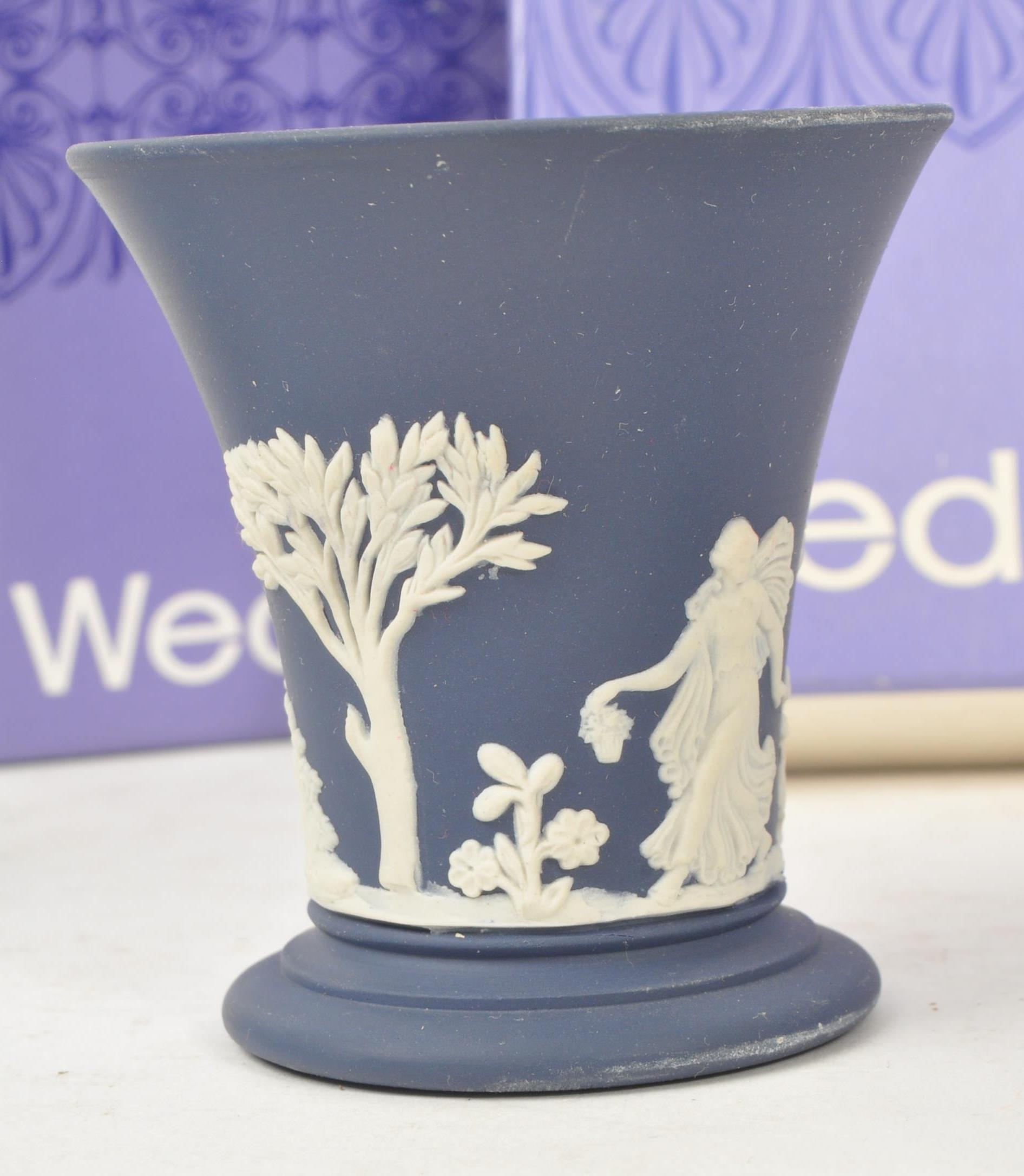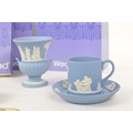 Wedgwood - Jasperware - A collection of vintage 20th Century porcelain china Wedgwood Jasperware items. To include two cups and saucers, sweet dish, miniature vase all in typical pale blue and white colourway, accompanied by a posy pot (portland blue) and small lidded pot in green. Together with a Wedgwood Atlas tray dish. Most items in original boxes. Largest item measuring approx.13cm x 13cm.
