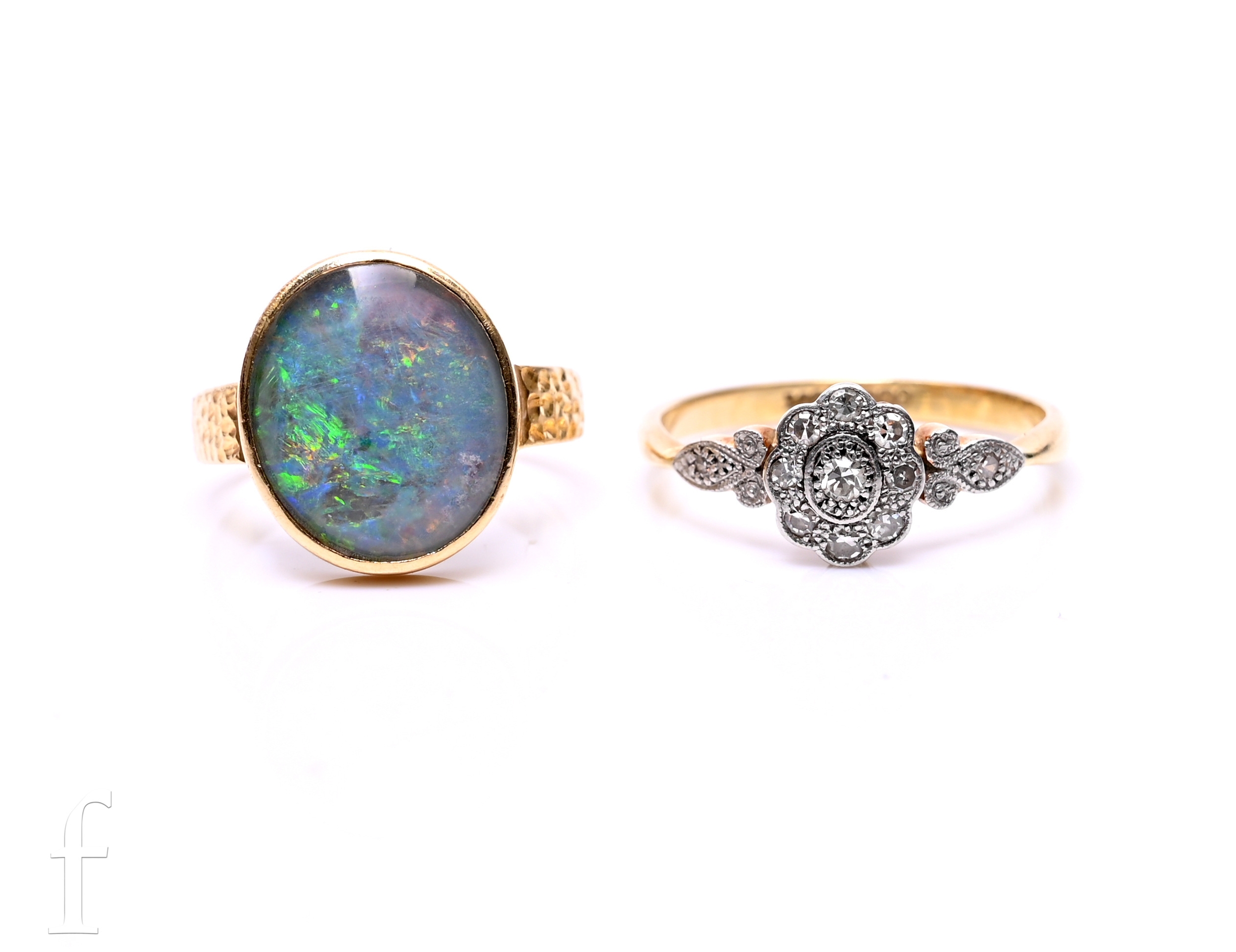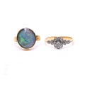 A diamond cluster ring, the eight-cut diamonds set between diamond set shoulders, mount marked '18CT', total weight 3g, ring size Q, and an opal ring, the oval opal triplet, collet set in 18 carat gold mount, hallmarked, total weight 4.6g, ring size L.