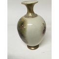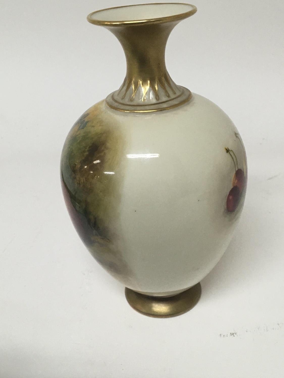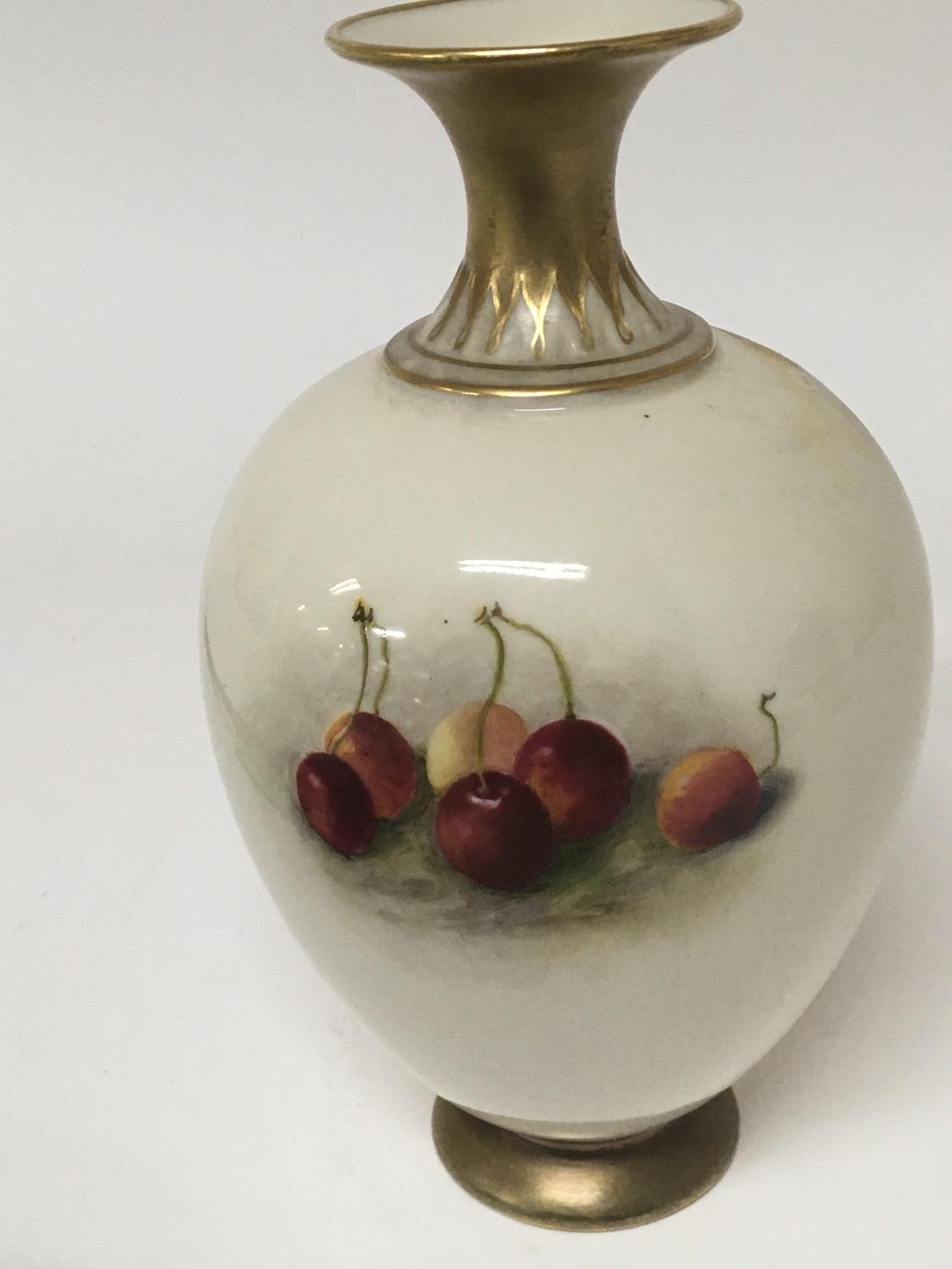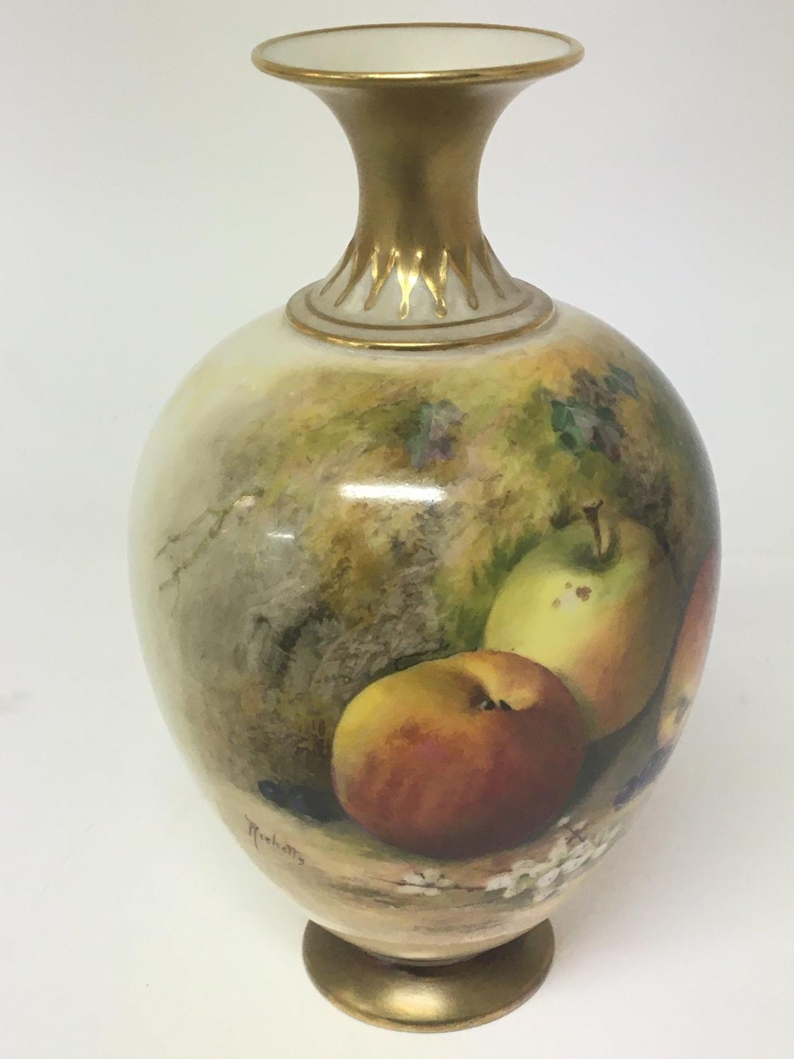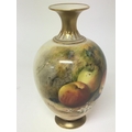 A fine quality Royal Worcester porcelain vase hand painted with apples in a floral and foliage landscape. With applied gilt signed by William Rieketts. No obvious damage. Height 17cm.