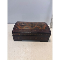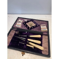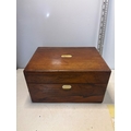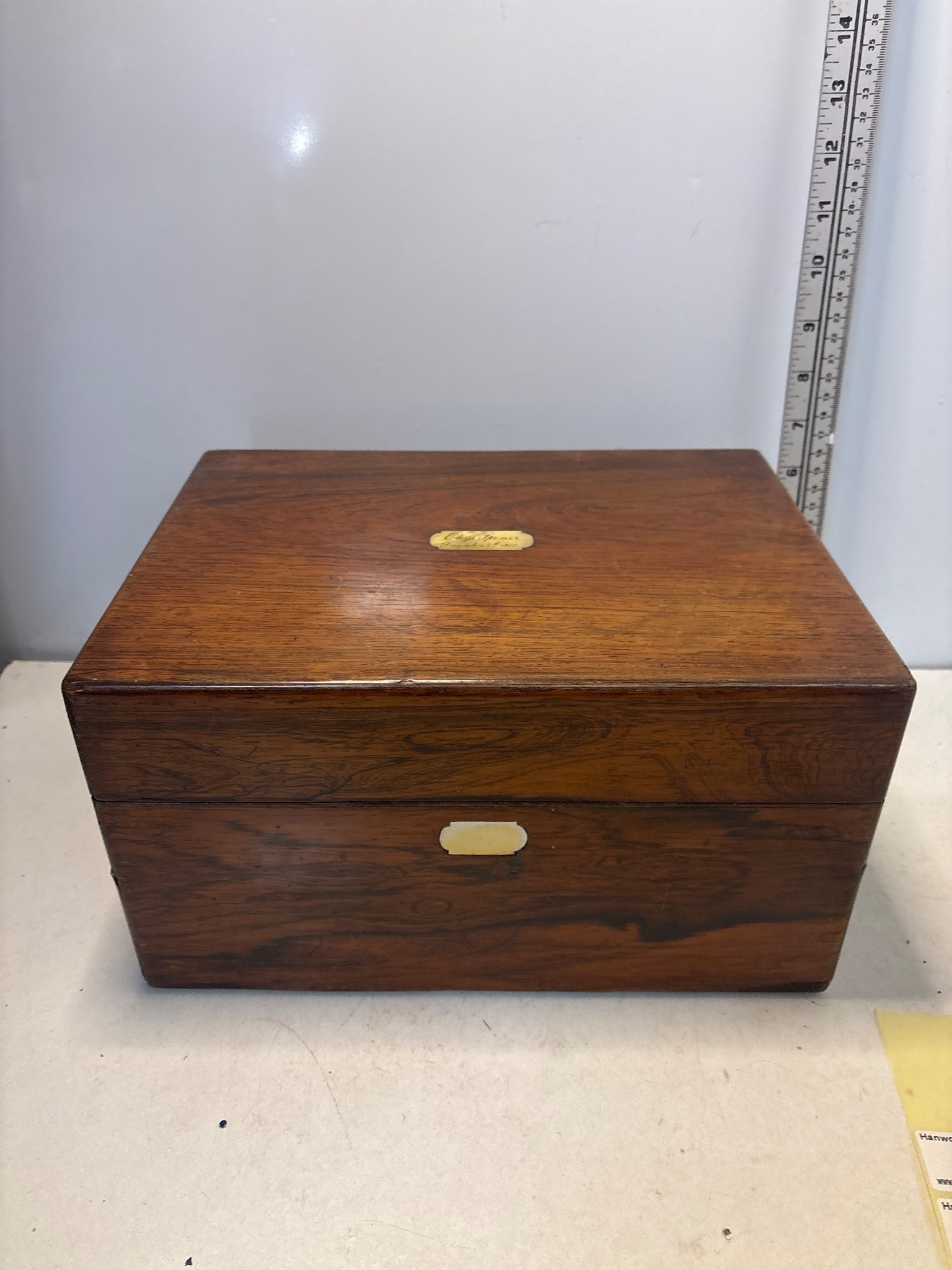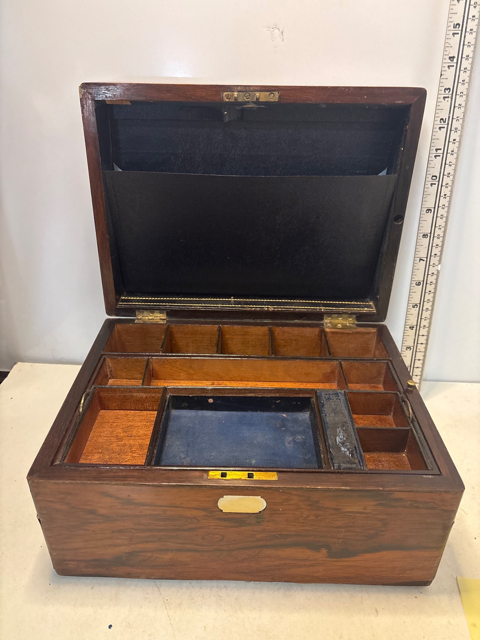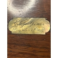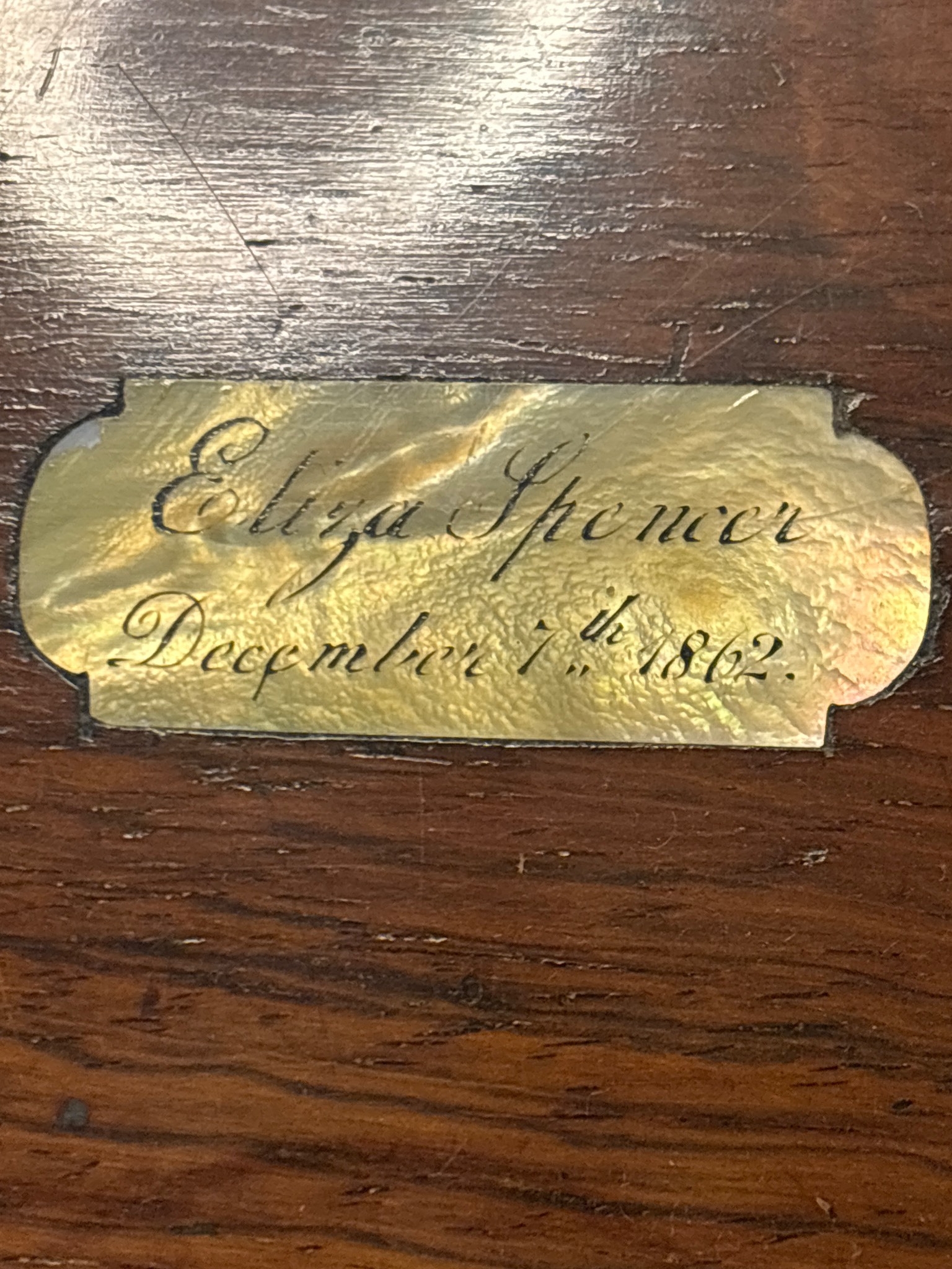 Wooden writing box featuring brass inlays and an engraved plaque reading 'Eliza Spencer December 17th, 1862.' Interior includes compartments and a blue velvet section. Measures approximately 10 inches across.