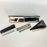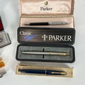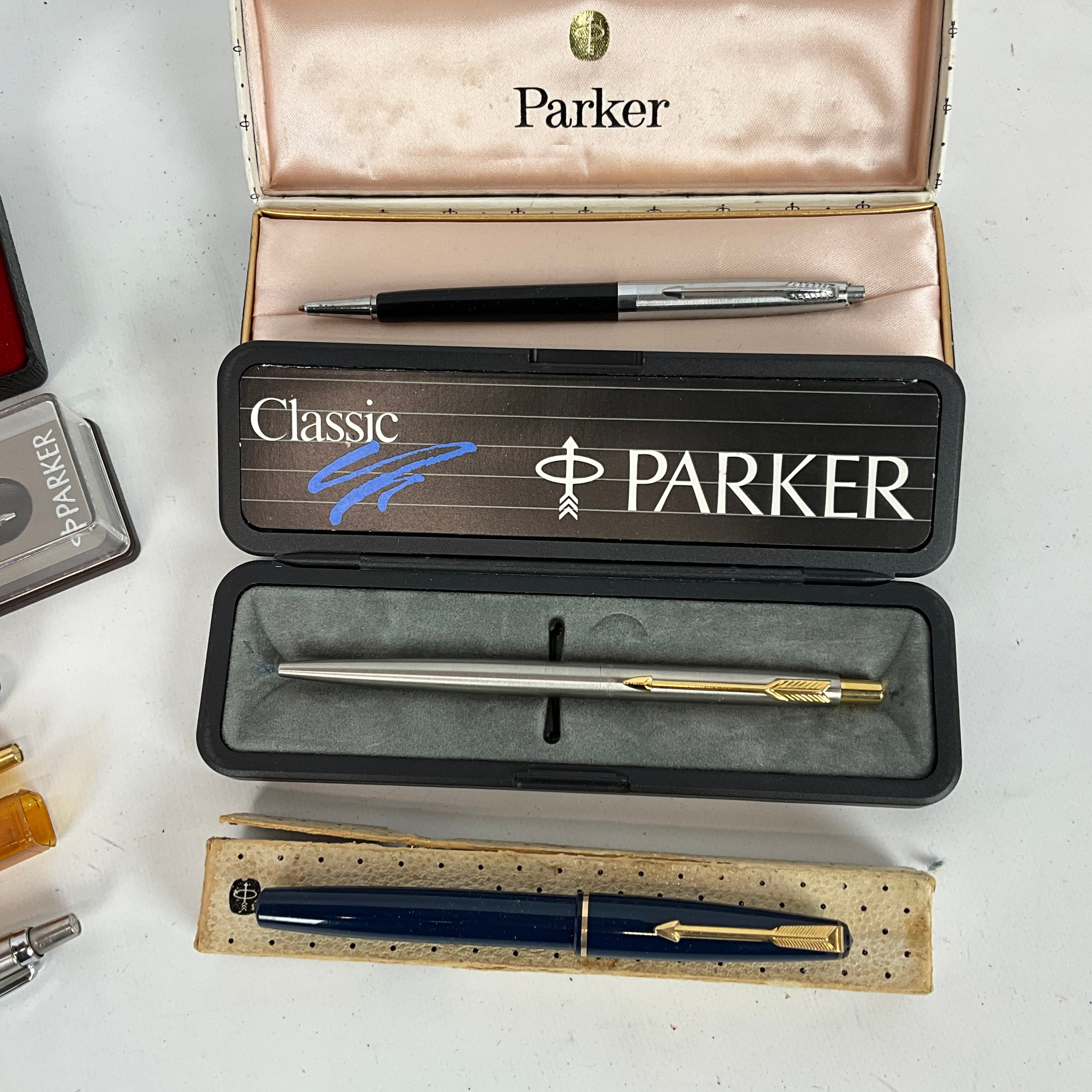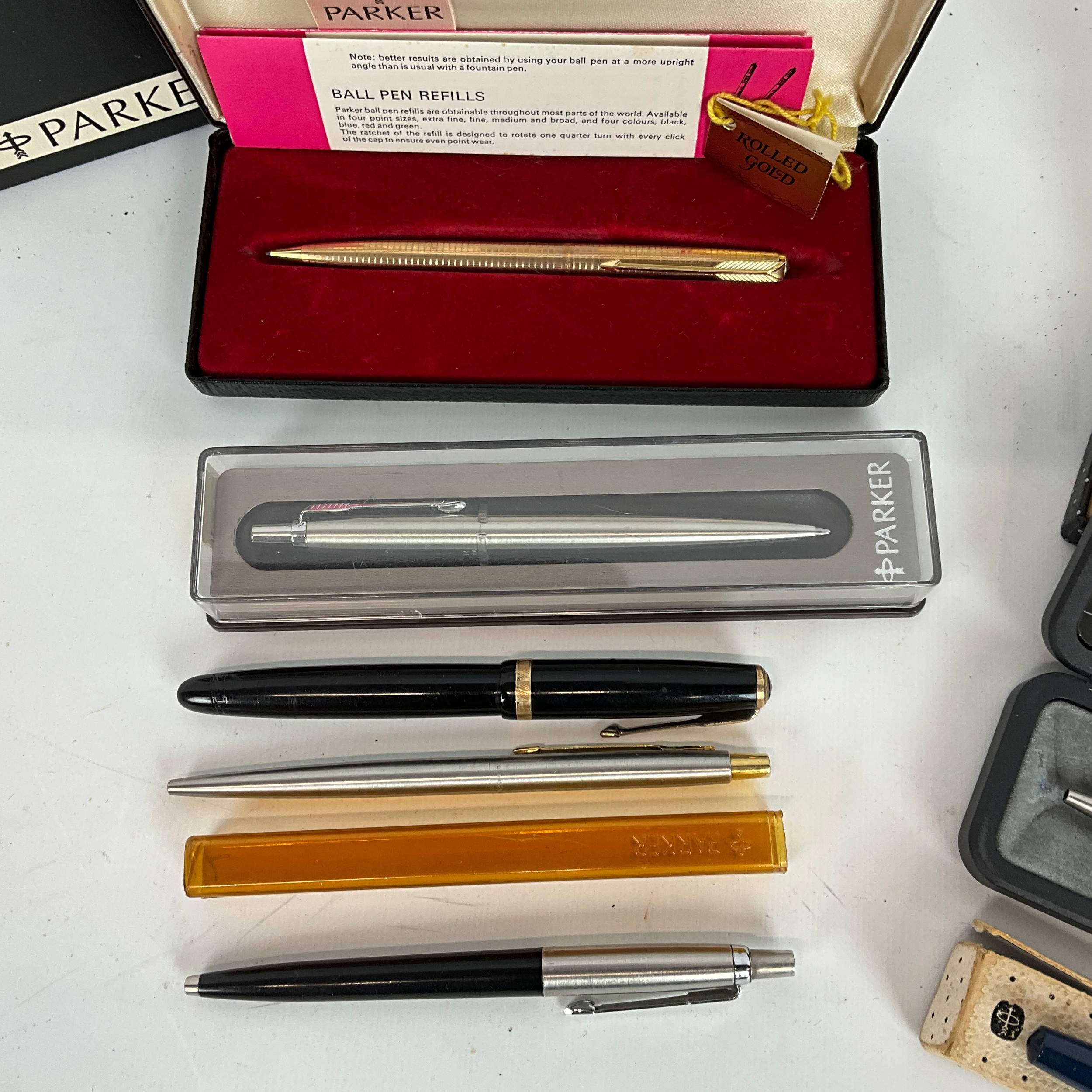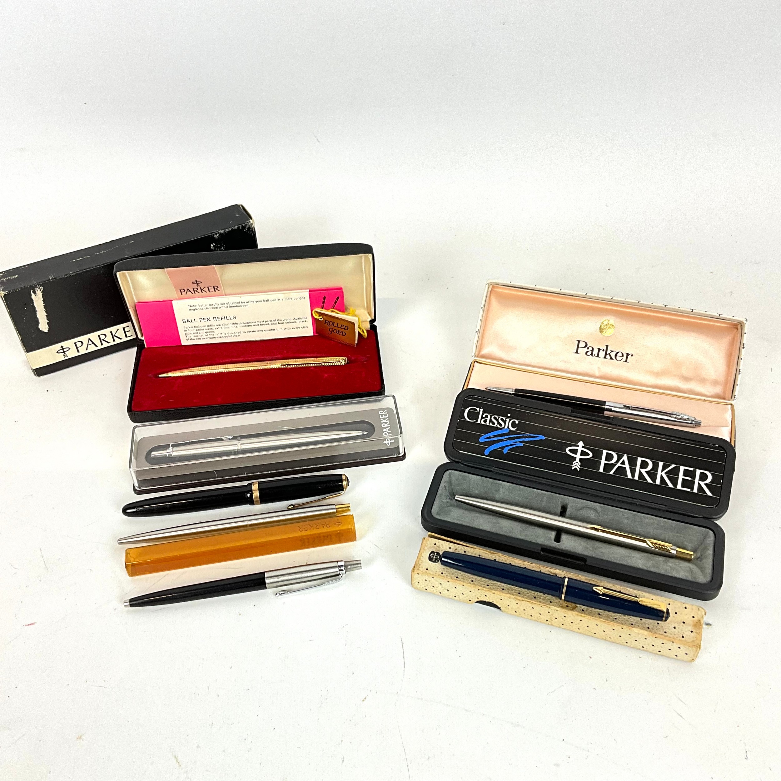 A collection of Parker pens to include a 14ct nibbed Parker duo fold, a Parker rolled gold propelling pencil, and various ballpoint examples, five in cases, 8 in total.