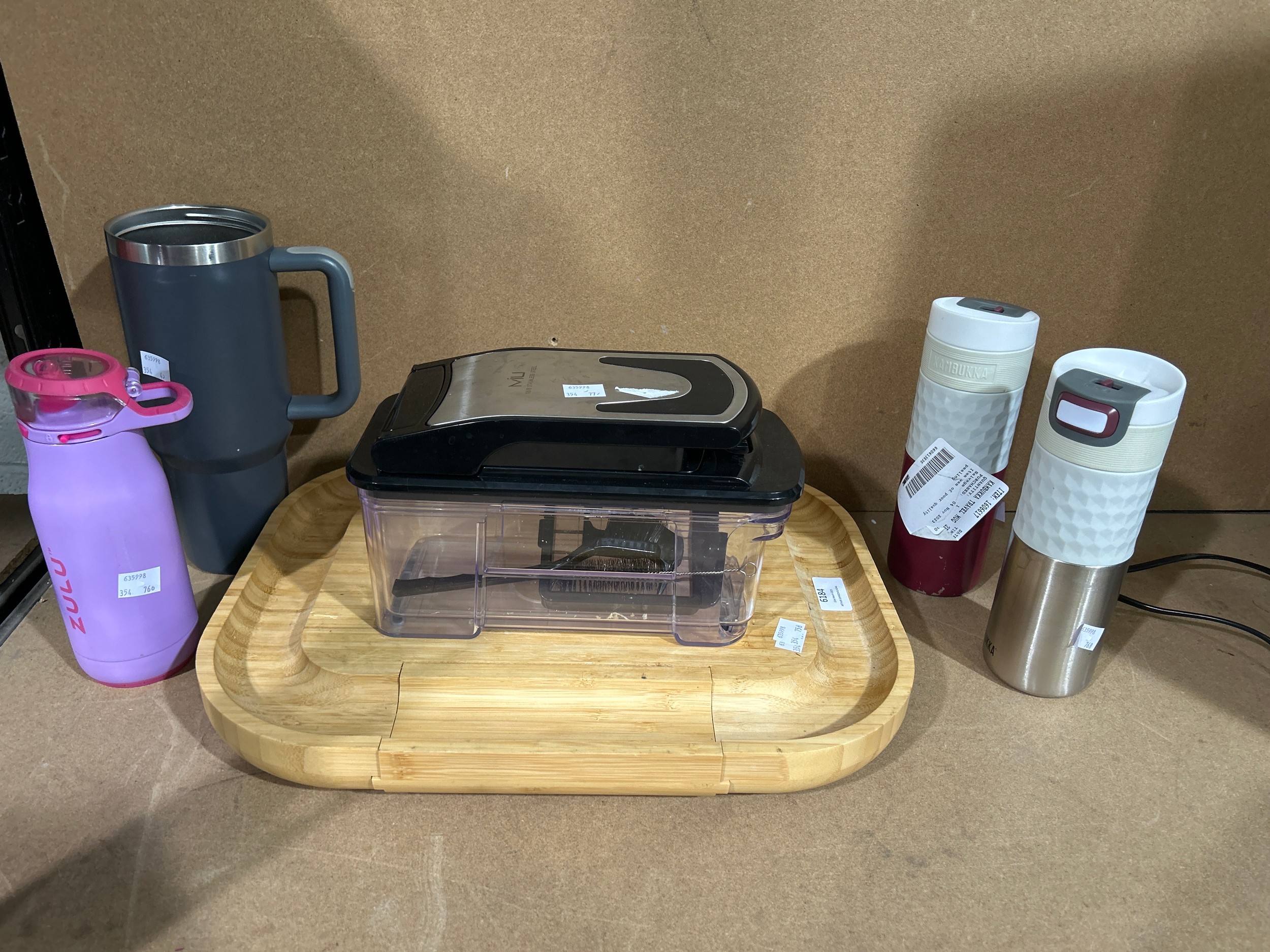 Stainless steel mug, Bamboo cheese board, Zulu stainless steel water bottle and a Miu vegetable chopper (354-45,758,766,779) *This lot is subject to VAT