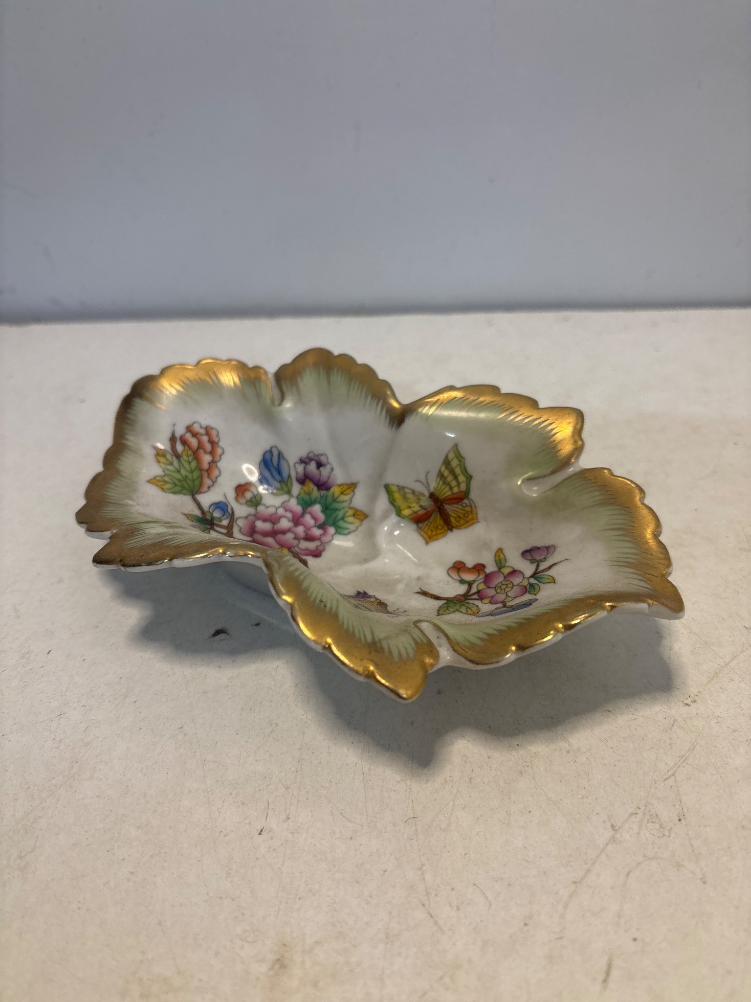 Herend porcelain dish featuring floral designs, butterfly motif, and gold accents. Made in Hungary.