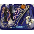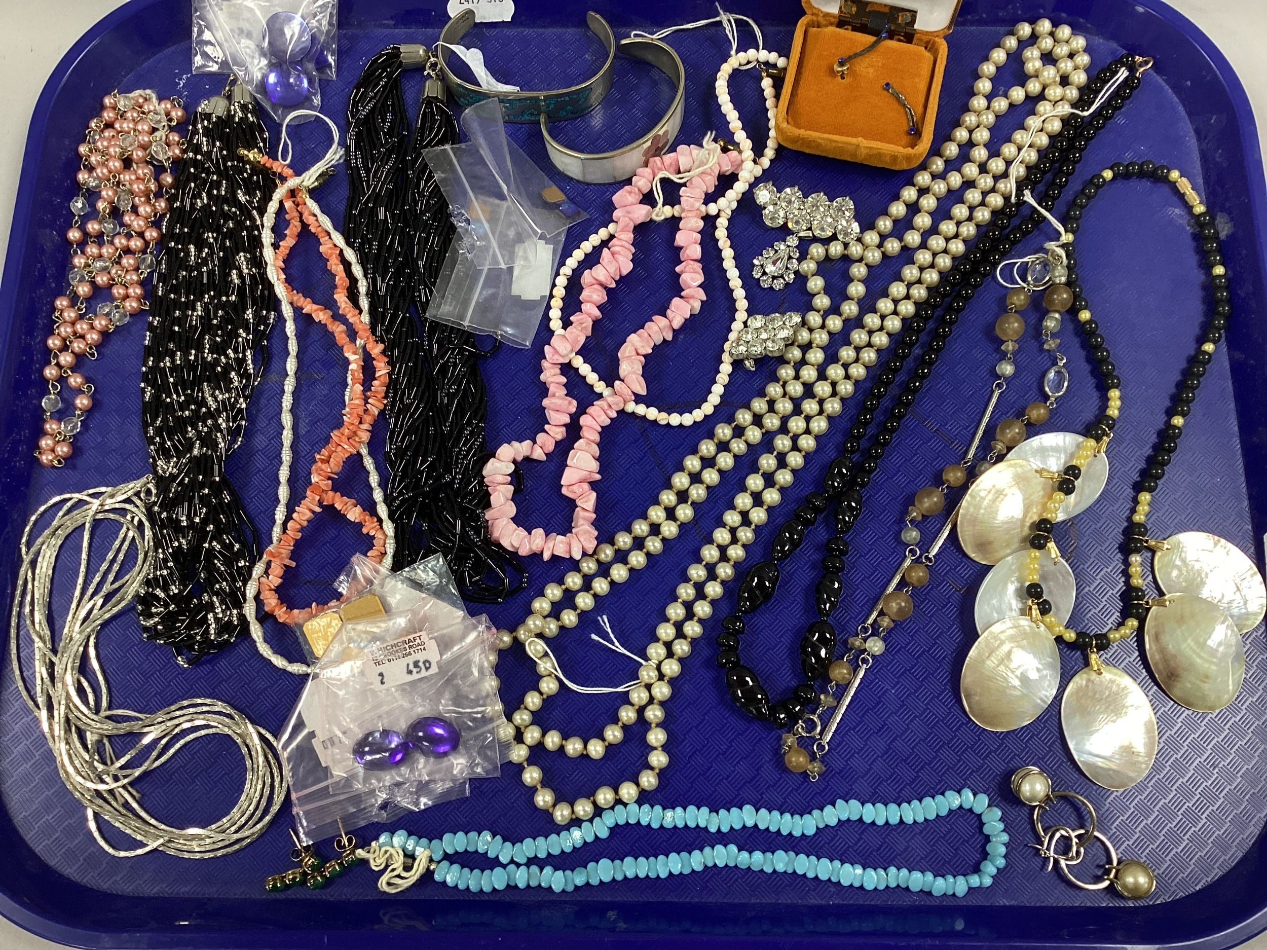 A Variety of Costume Jewellery, to include a coral chip necklace, to barrel clasp, shell drop necklace, knotted imitation pearl bead necklace, diamanté brooch, three stone drop earrings, stamped "925", cuff bangles etc :- One Tray