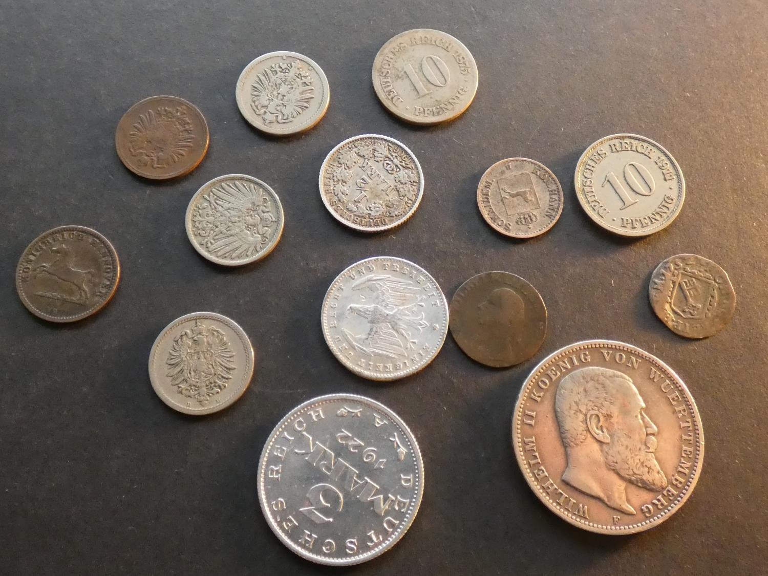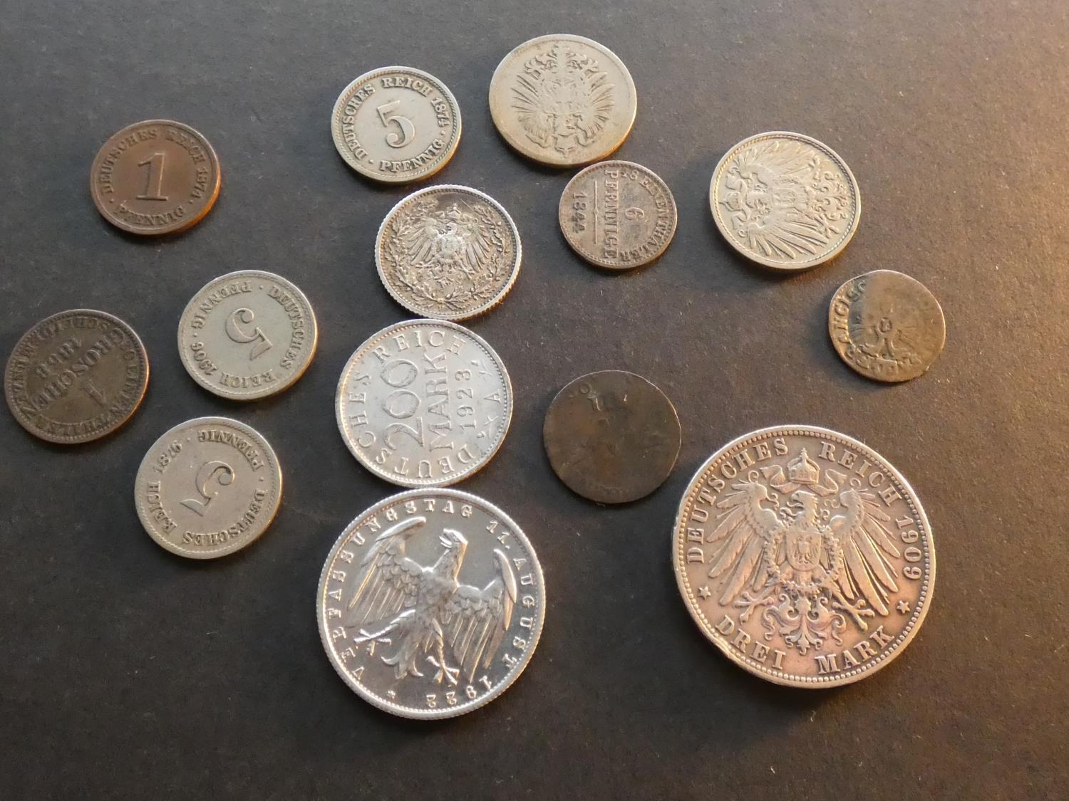 GERMANY. 1 Pfennig (1874G), 5pf (1874B, 1876D, 1906F), 10pf (1875C, 1911J), ½ Mark (1906F), 3Mk (1922A) & 200Mk (1923A), plus States; Bremen, 1 Grote, 1752, East Prussia, 3 Groschen, 1802A. Hannover, 1 Groschen, 1858B & 6pf, 1844B and Württemberg, 3 Mark, 1909F. Mixed grades and condition, Good, worn to EF (14)