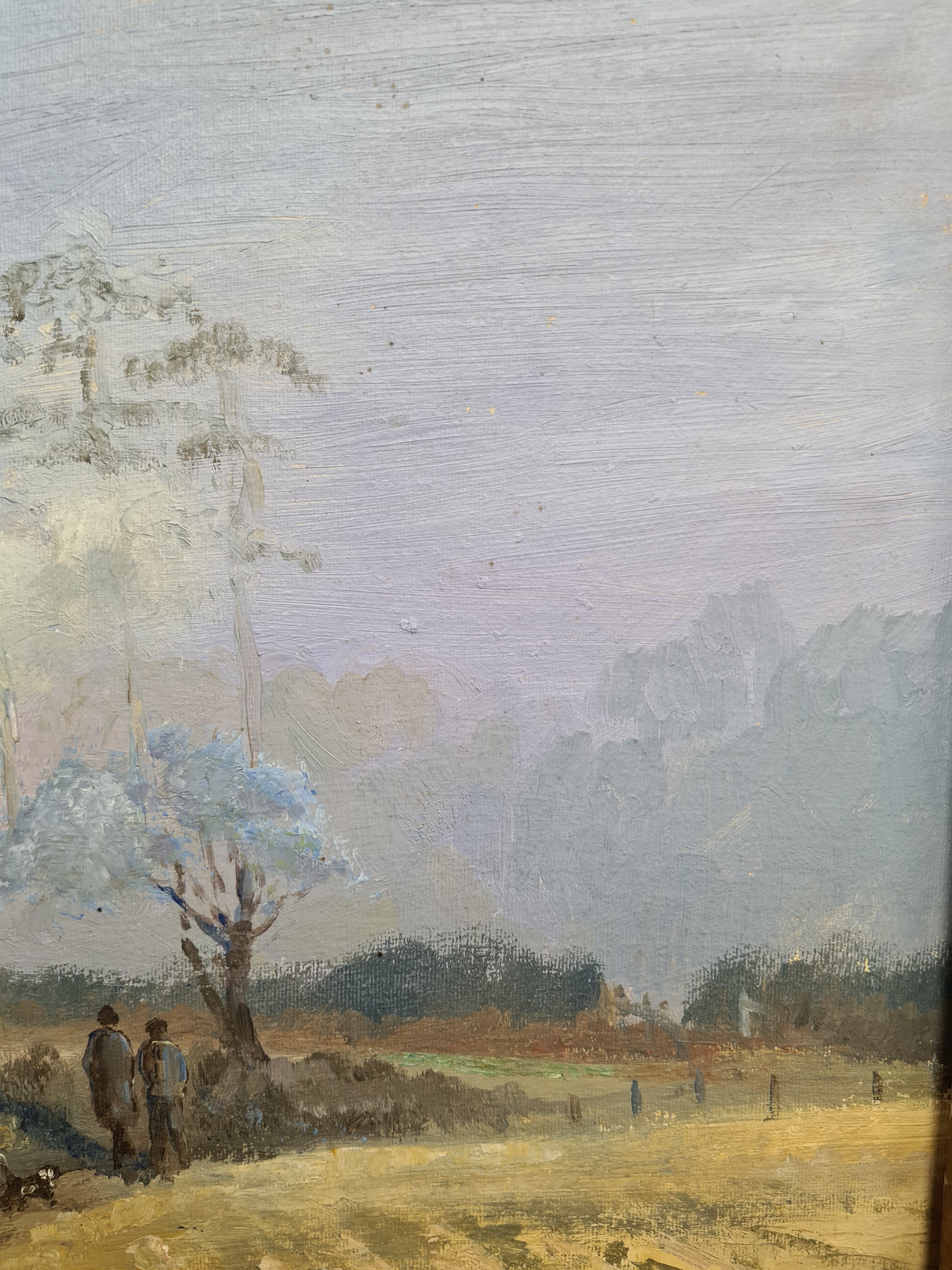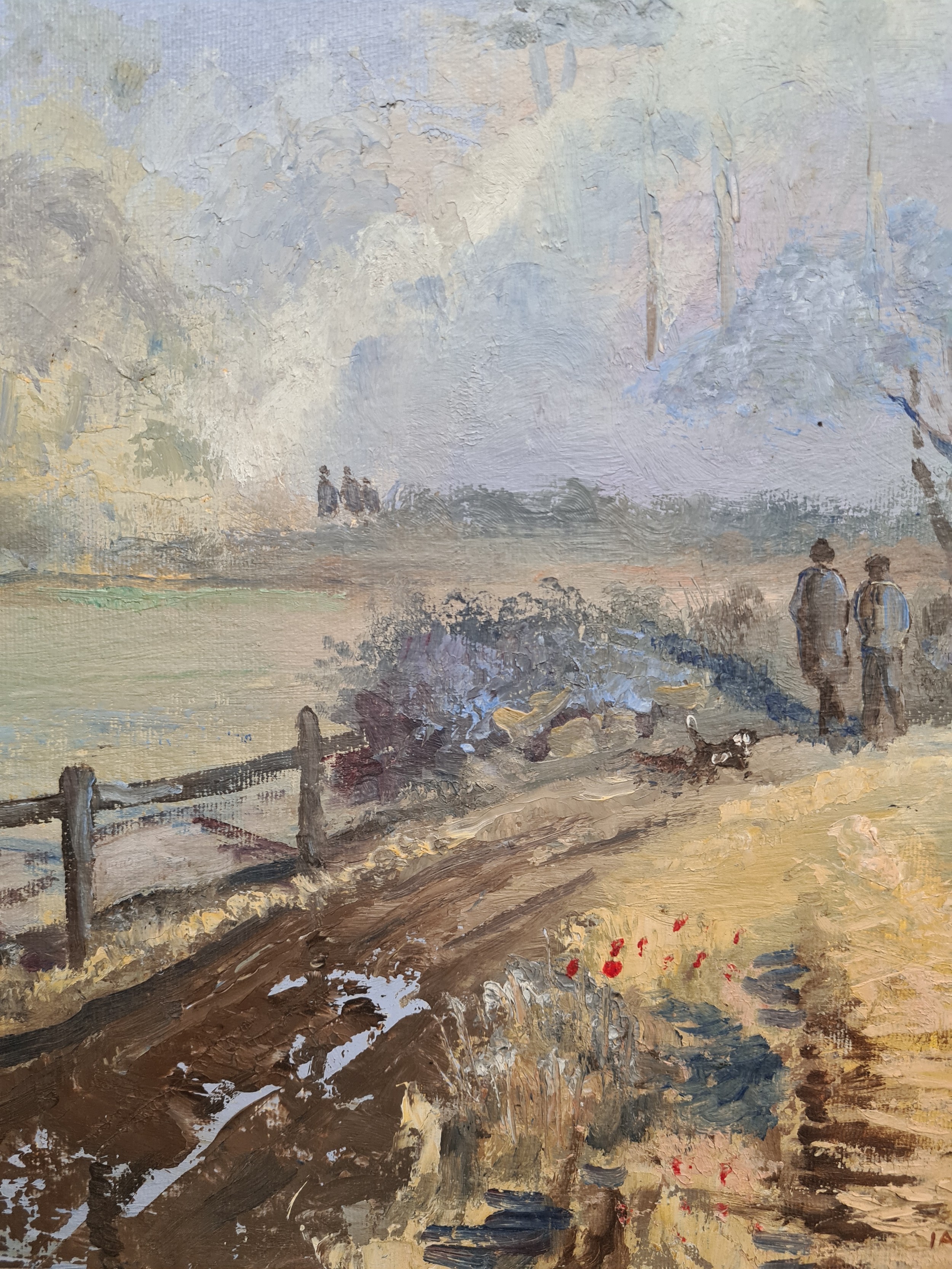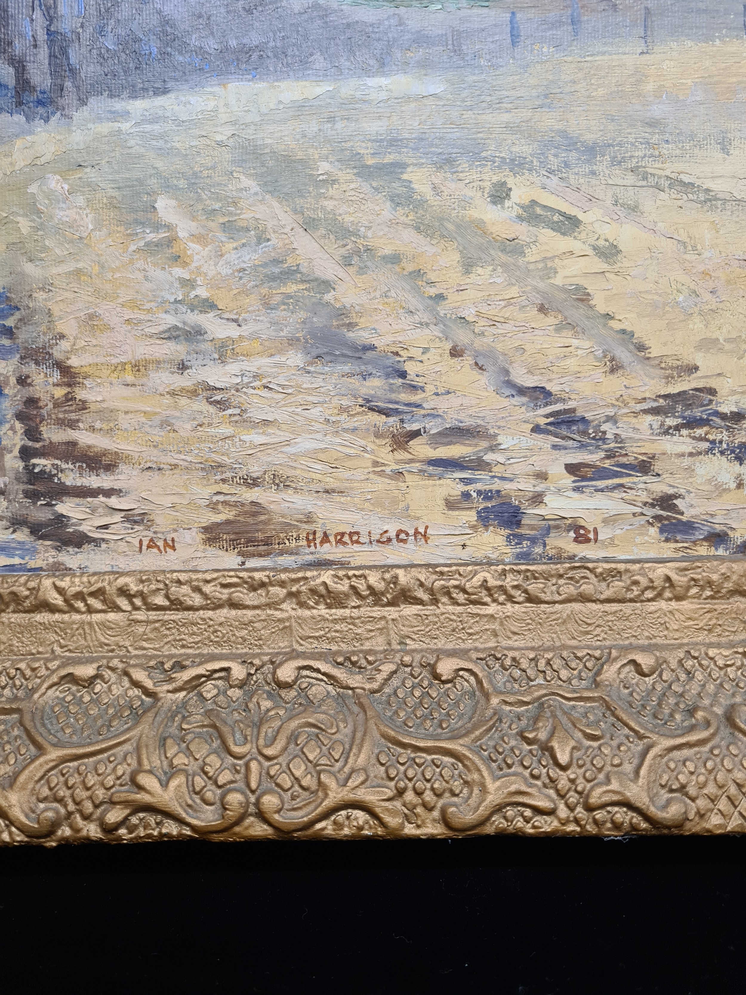 Star Lot: A wonderful 1981 oil on board painting. Features an Irish rural landscape with figures and flock of sheep. Rendered in a subdued and misty palette with lilac hues, warm ochres, dusty olive greens and streaks of white with dabs of red. Portrays gestural brushstrokes with visible marks and layered detailing. Signed 'Ian Harrison' and dated. Housed in an elaborate gilt frame.