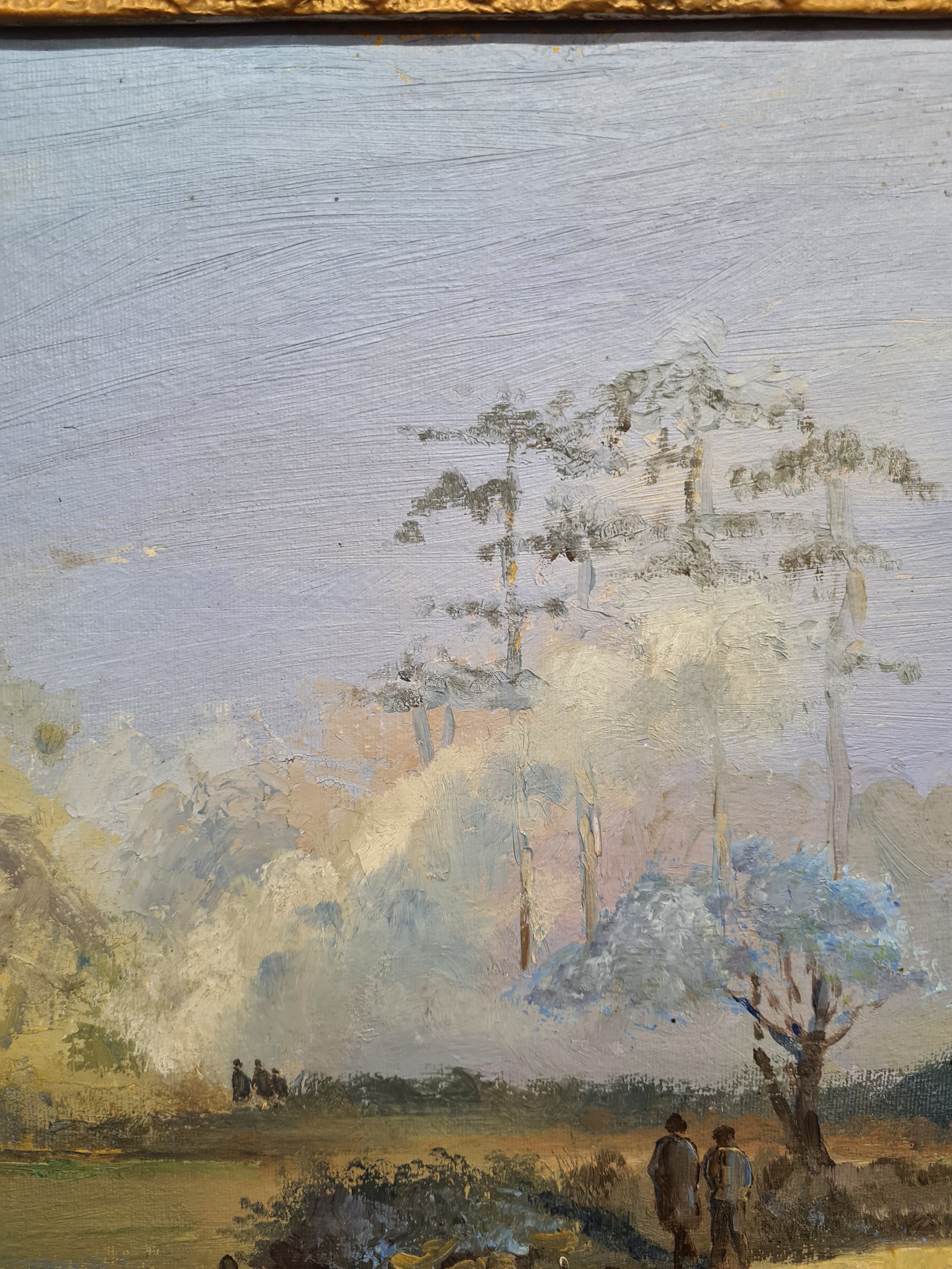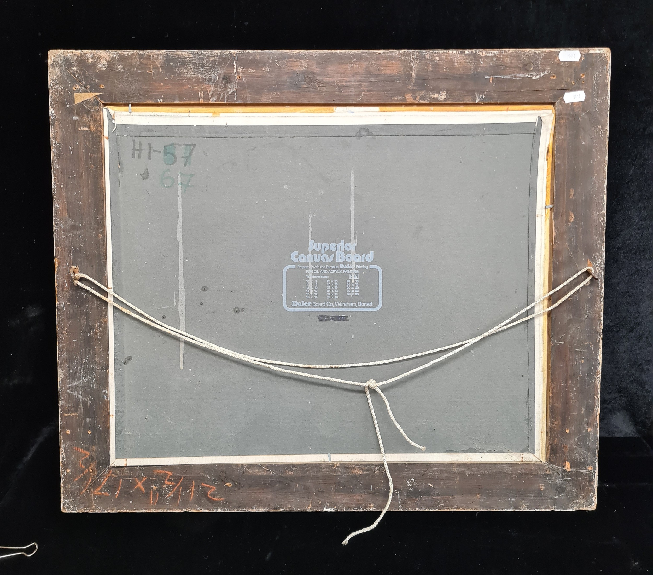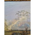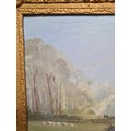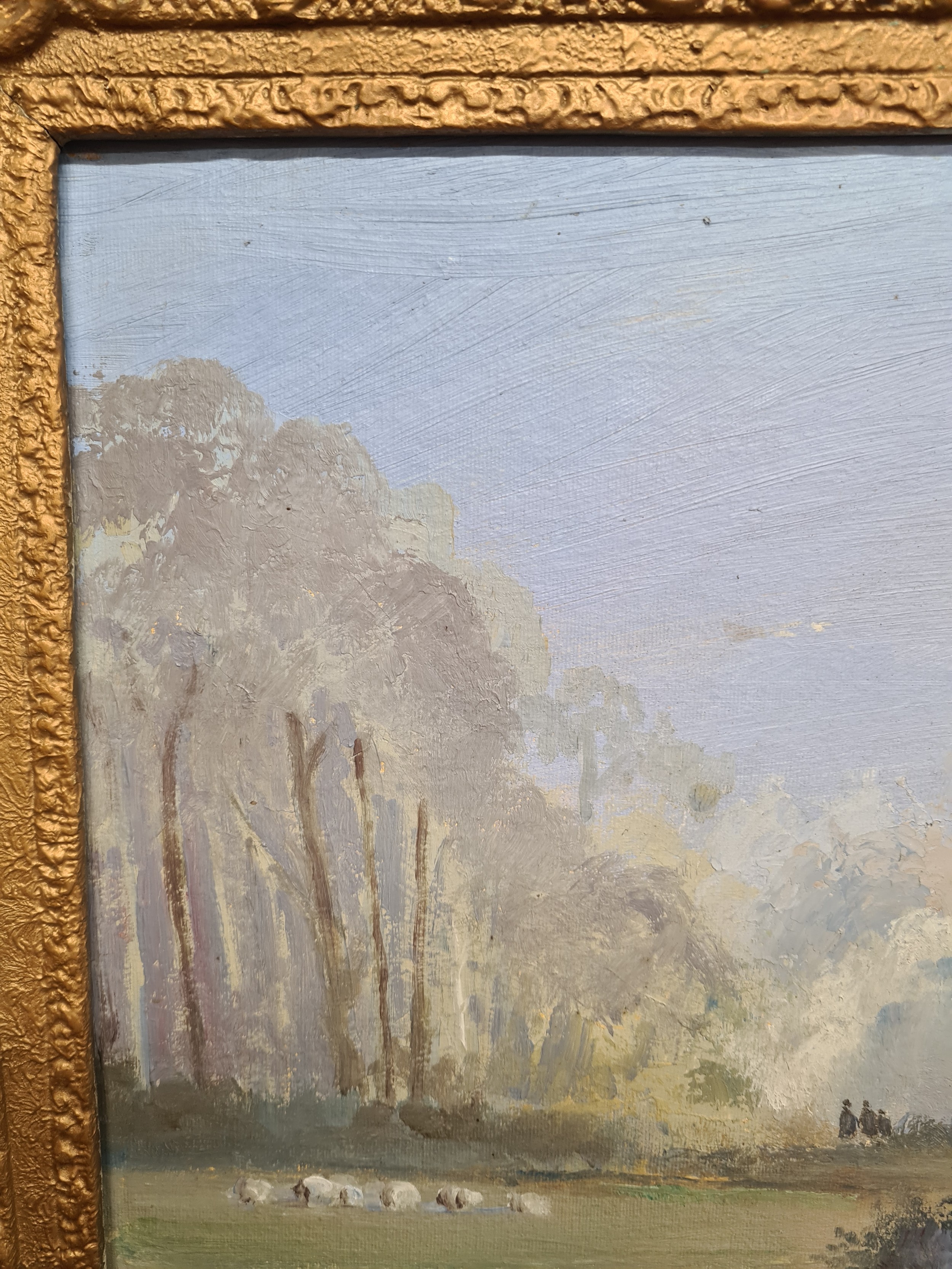 Star Lot: A wonderful 1981 oil on board painting. Features an Irish rural landscape with figures and flock of sheep. Rendered in a subdued and misty palette with lilac hues, warm ochres, dusty olive greens and streaks of white with dabs of red. Portrays gestural brushstrokes with visible marks and layered detailing. Signed 'Ian Harrison' and dated. Housed in an elaborate gilt frame.