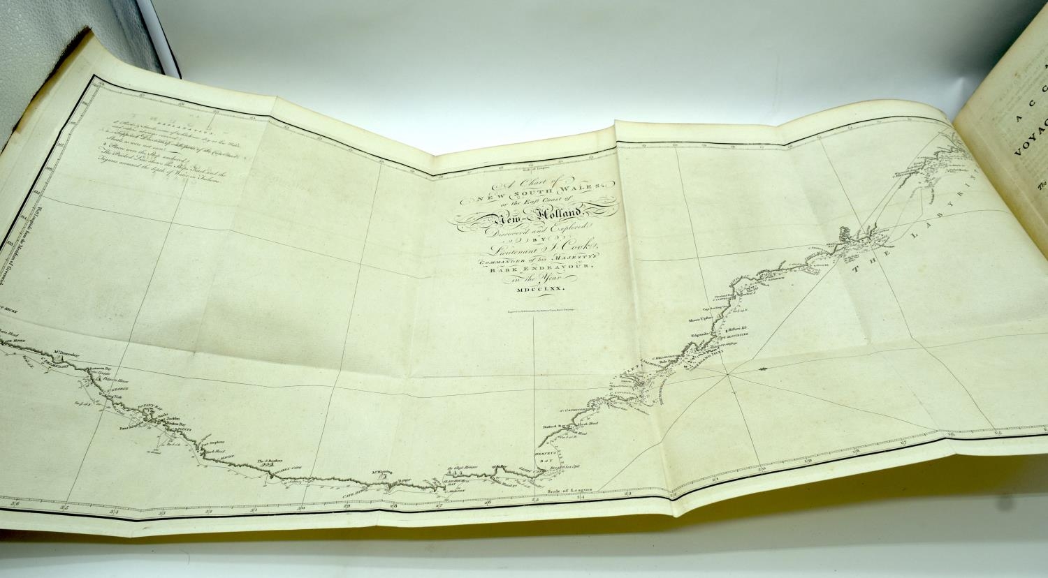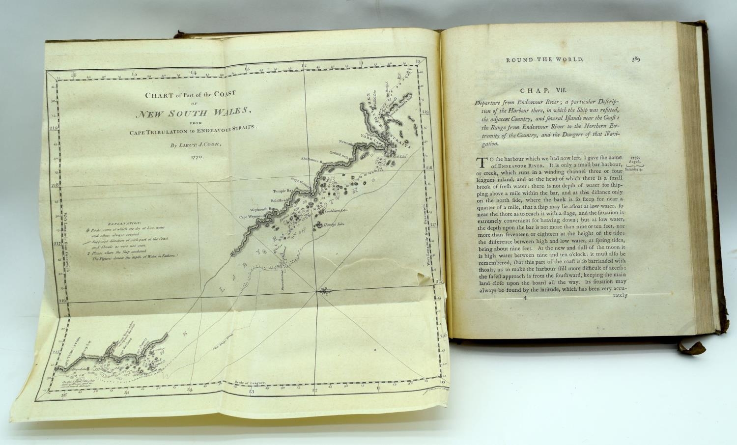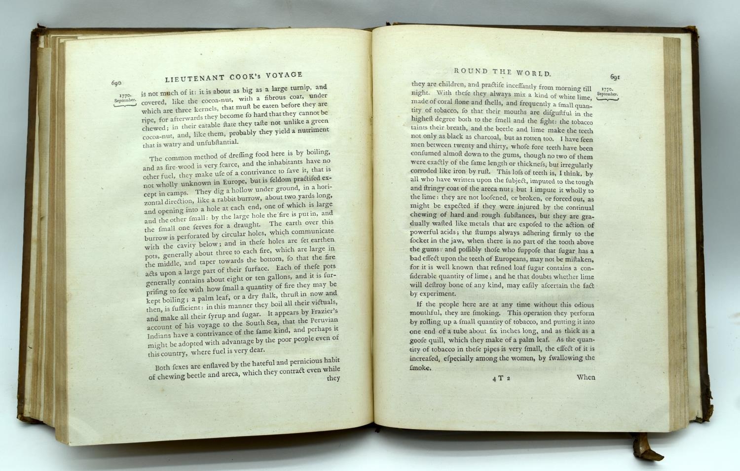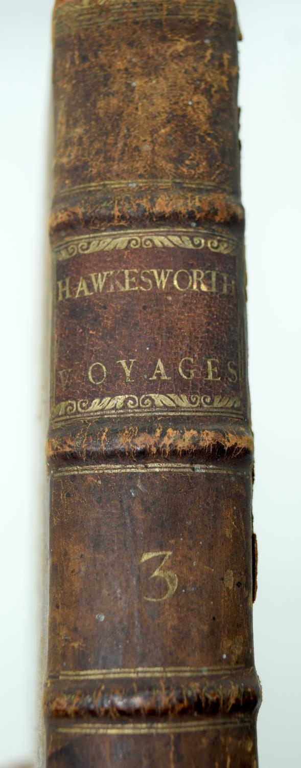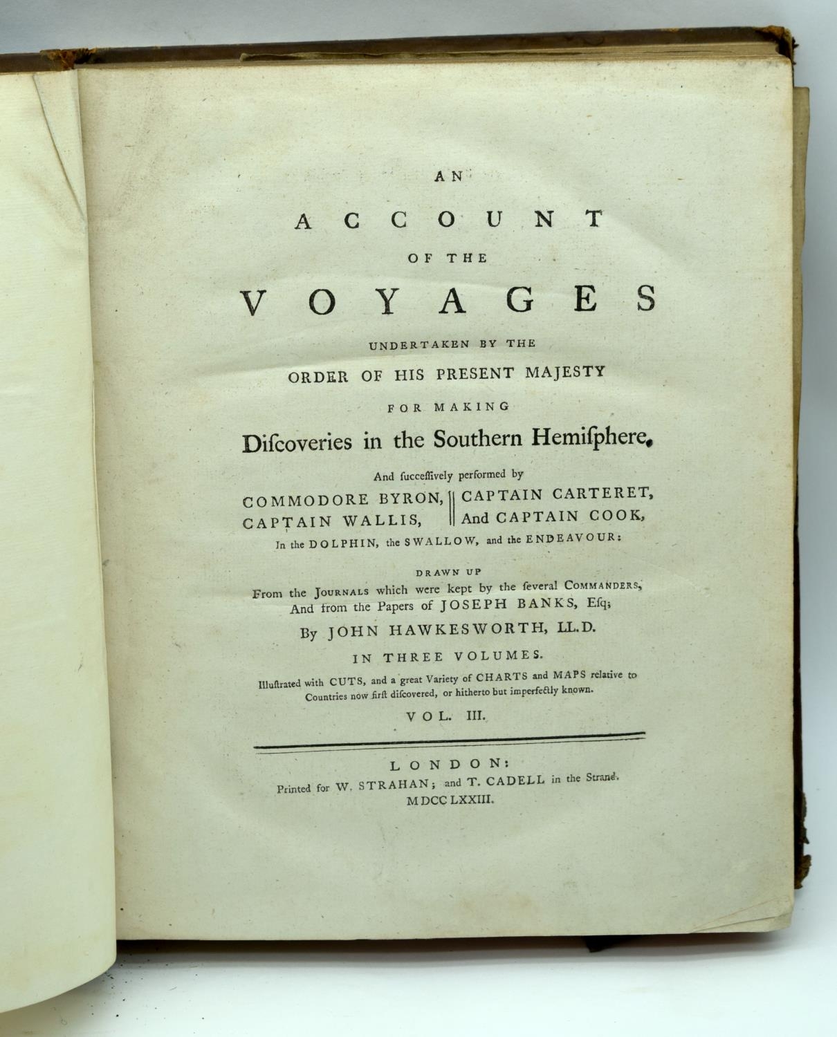 The 1773 book of an Account of the Voyages of Discoveries in the Southern Hemisphere by Commodore Bryon, Captains Cook, Wallis and Carteret. Volume III by John Hawkesworth 28 x 23 cm.