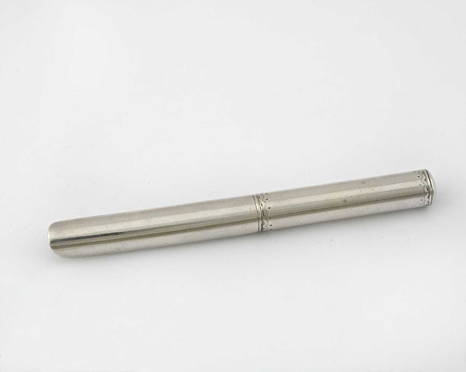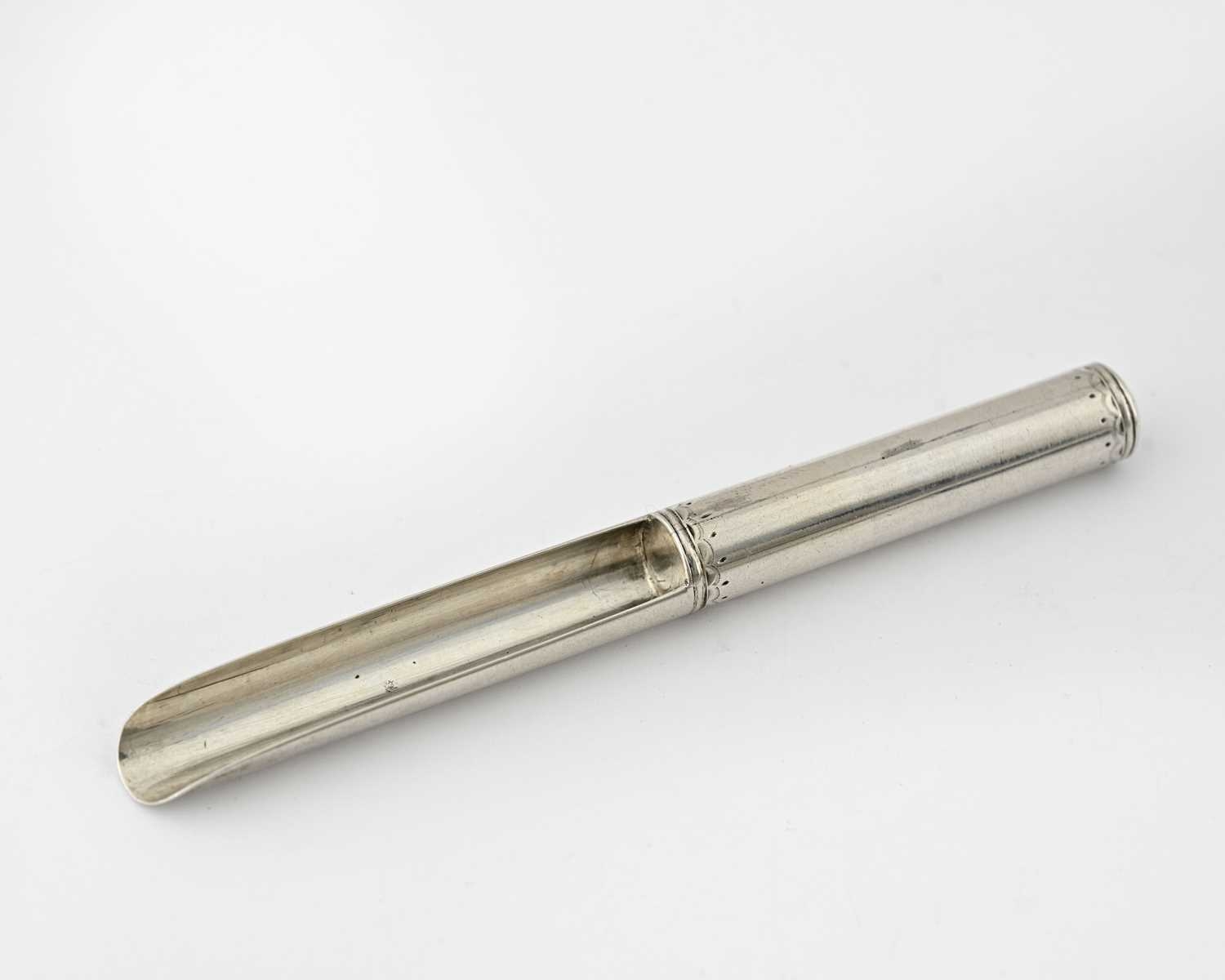 An early nineteenth-century English silver apple corer, of single-piece construction, the handle decorated with opposing bands of bright-cut scale decoration, apparently unmarked, circa 1800-20, length 11.7cm, weight 21g/0.67ozt approx