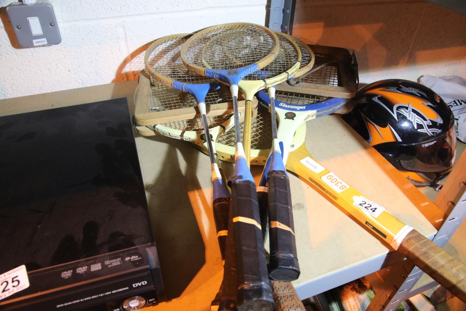 Collection of mixed make tennis and badminton rackets including two in presses. Not available for in-house P&P, contact Paul O'Hea at Mailboxes on 01925 659133