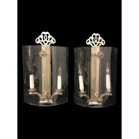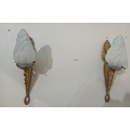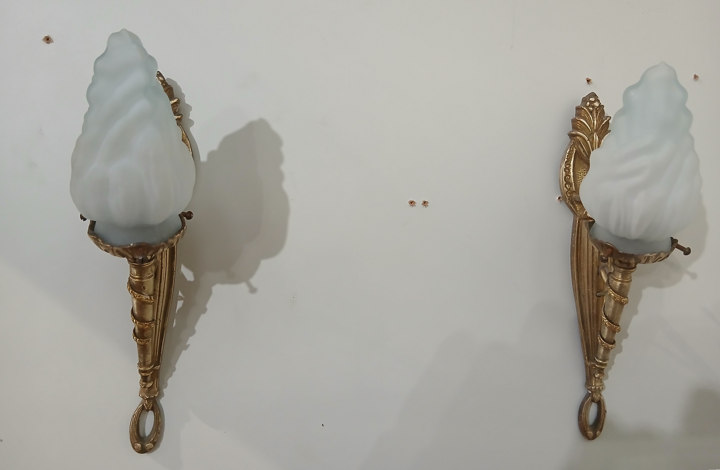 A PAIR OF CONTINENTAL GILT BRASS WALL LIGHTS each in the form of a torch with opaline glass shades 32cm (h) x 8cm (w) x 14cm (d)
