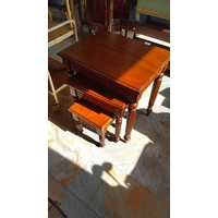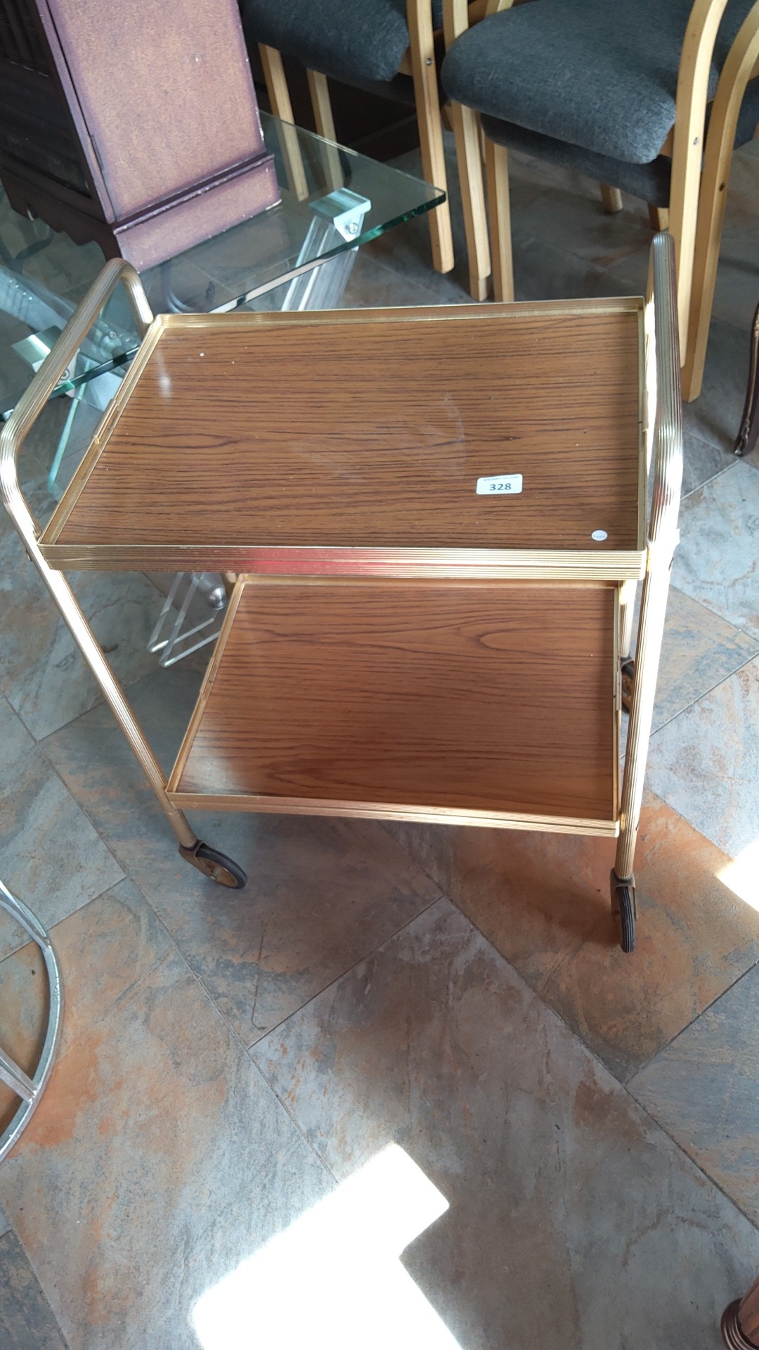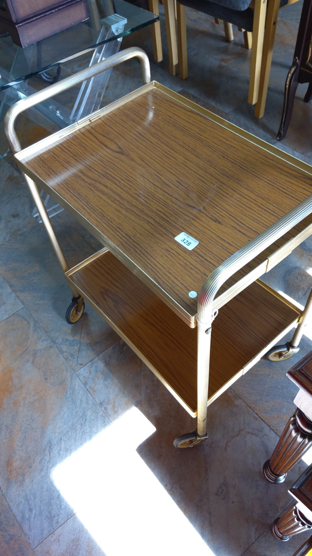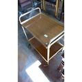 Mid-20th century two-tier tea trolley with faux wood-grain laminate trays within a gilt-metal tubular frame, the upper tier with raised gallery and fluted handles; raised on four castors.