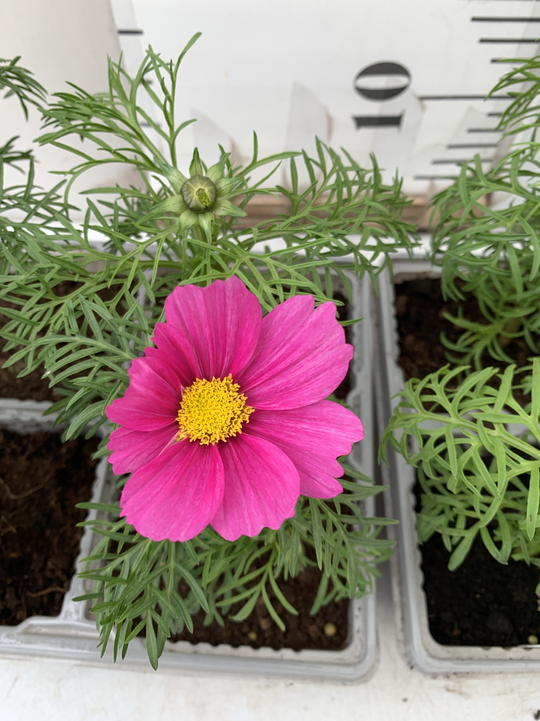 EIGHT MIXED COLOUR COSMOS PLANTS IN TWO TRAYS. TO BE SOLD FOR THE EIGHT