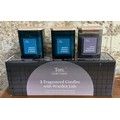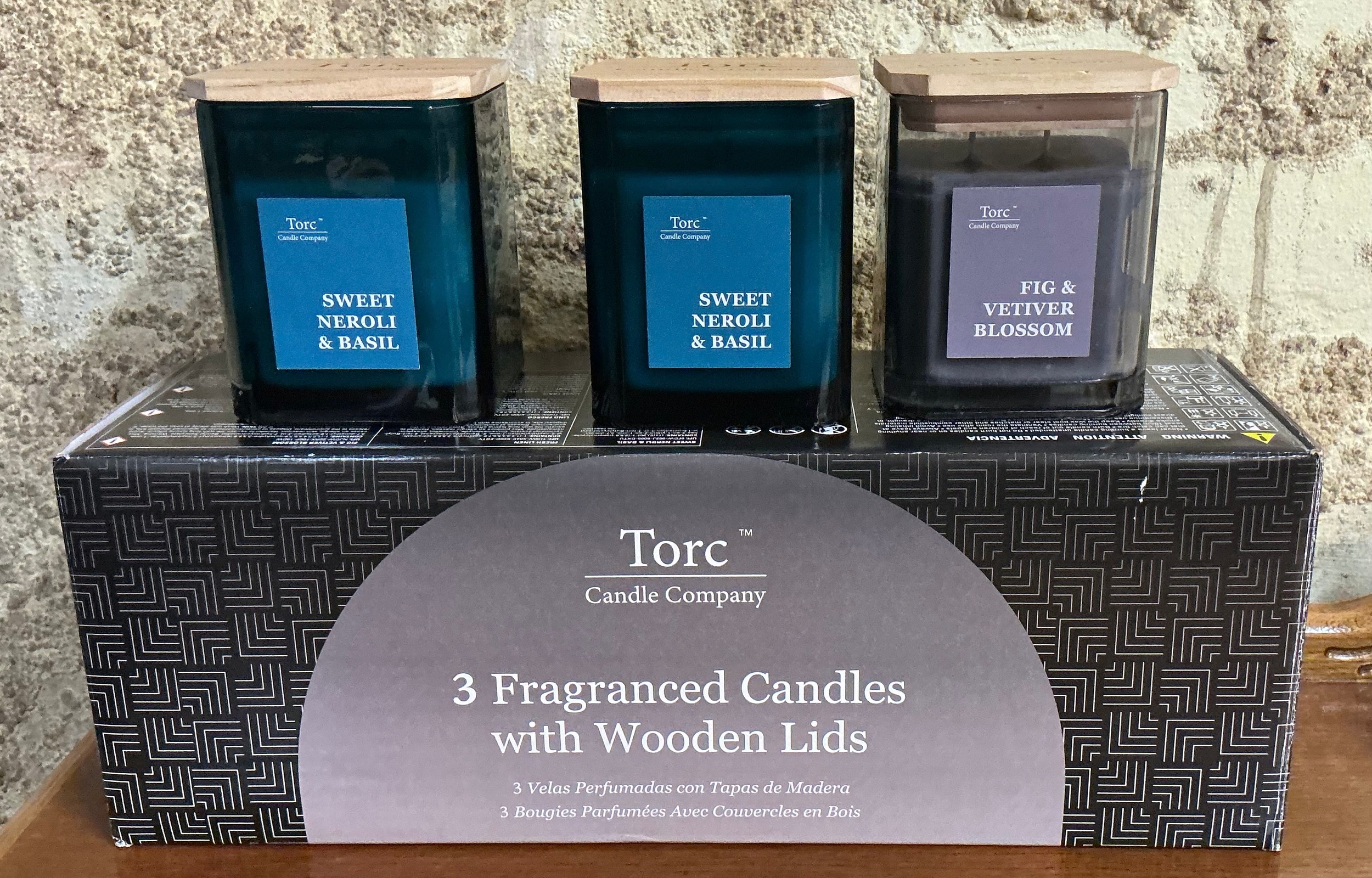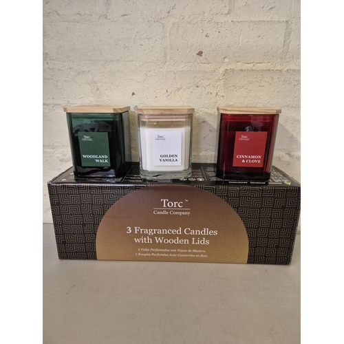 BOXED SET OF THREE TORC CANDLE COMPANY CANDLES WITH WOODEN LIDS - 2X SWEET NEROLI AND BASIL AND 1 FIG AND VETIVER BLOSSOM