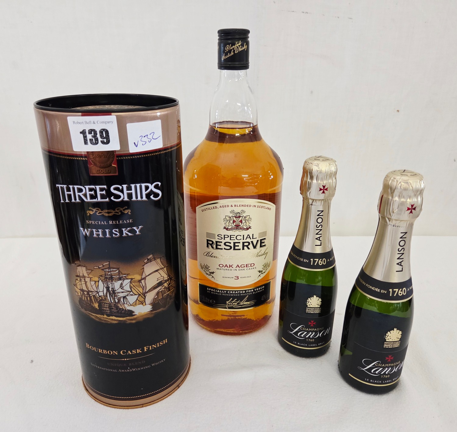 Alcohol, comprising cased 750ml Three Ships whisky, 1.5lt of Special Reserve whisky and 2x 200ml Lanson champagne