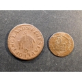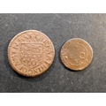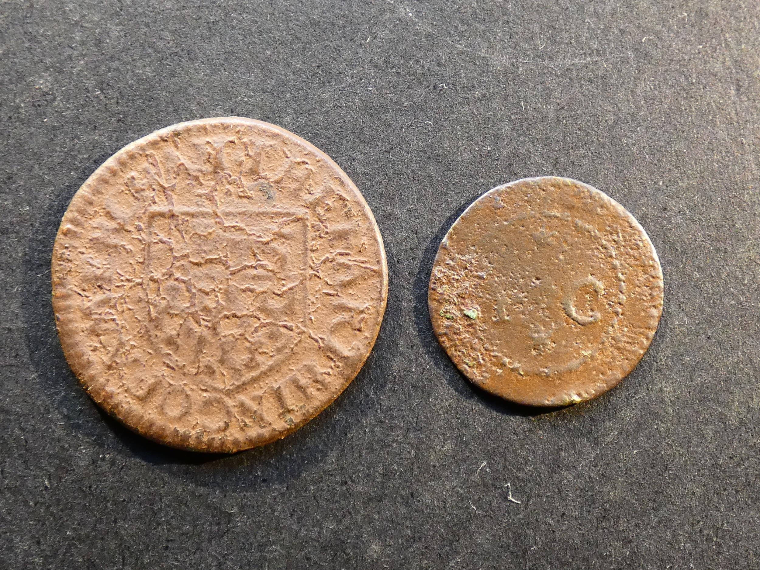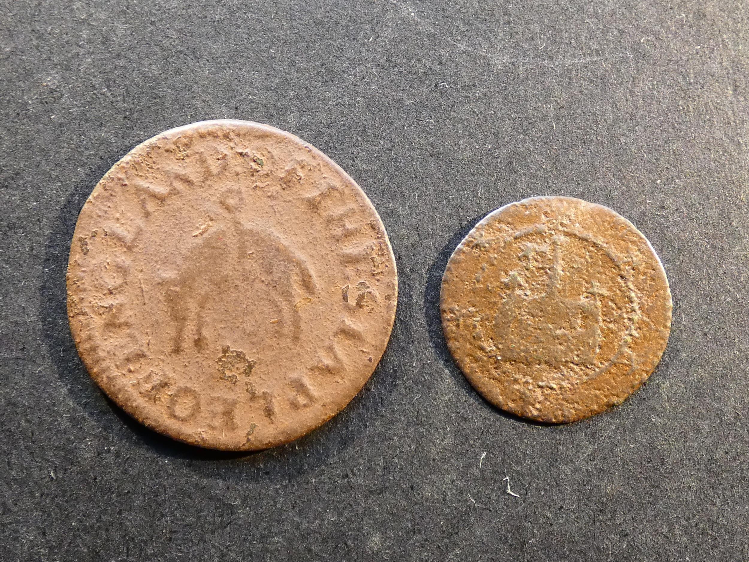 TOKENS - 17th CENTURY. Uncertain location, Farthing, obverse; four stars around inner circle, within which 'P.C.', small star above and below, reverse; six stars around inner circle within which a church, W-66, VG, surface corrosion, plus Farthing, obverse; THE FARTHING OF A MERCHANT, Staplemerchants' arms, reverse; OF THE STAPLE OF ENGLAND, a fleece, W-92, NF, corroded. (2)