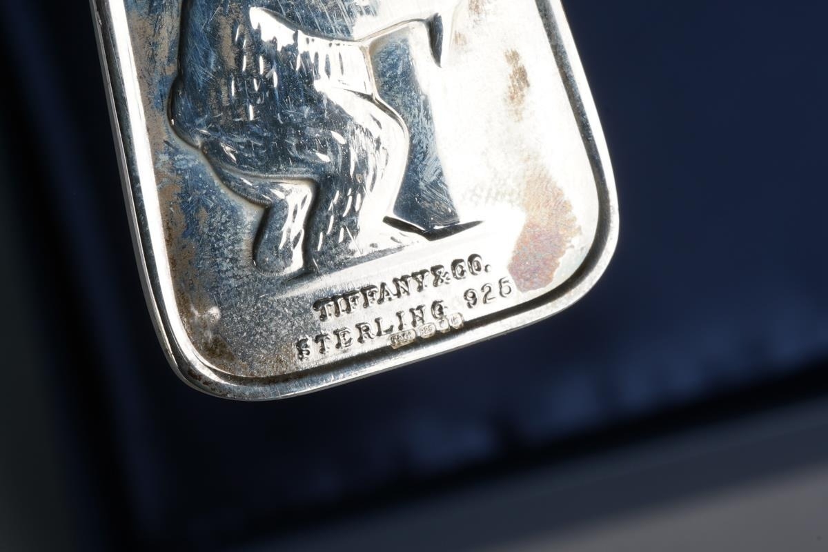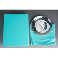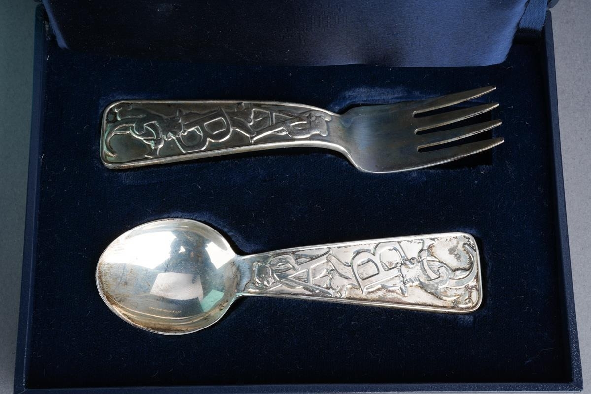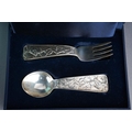 A boxed Tiffany& Co sterling silver christening set spoon and fork, the handles cast with bears and ABC to the front and a single bear holding food to the back, stamped "TIFFANY & CO STERLING" and London hallmarks, gross weight 2.73ozt, 85 grams approx, comes in a fitted Tiffany & Co case and with outer lidded card box (1)