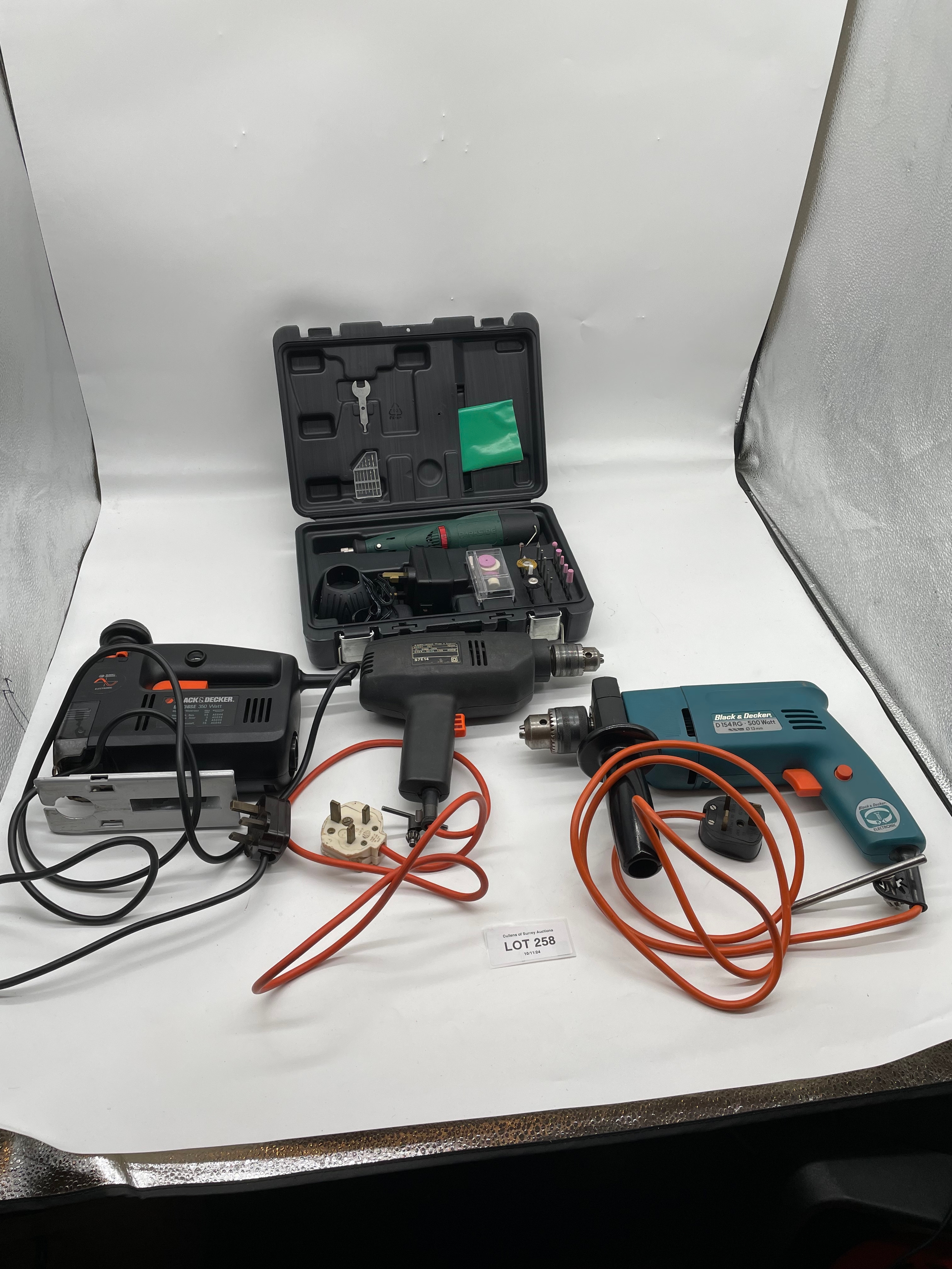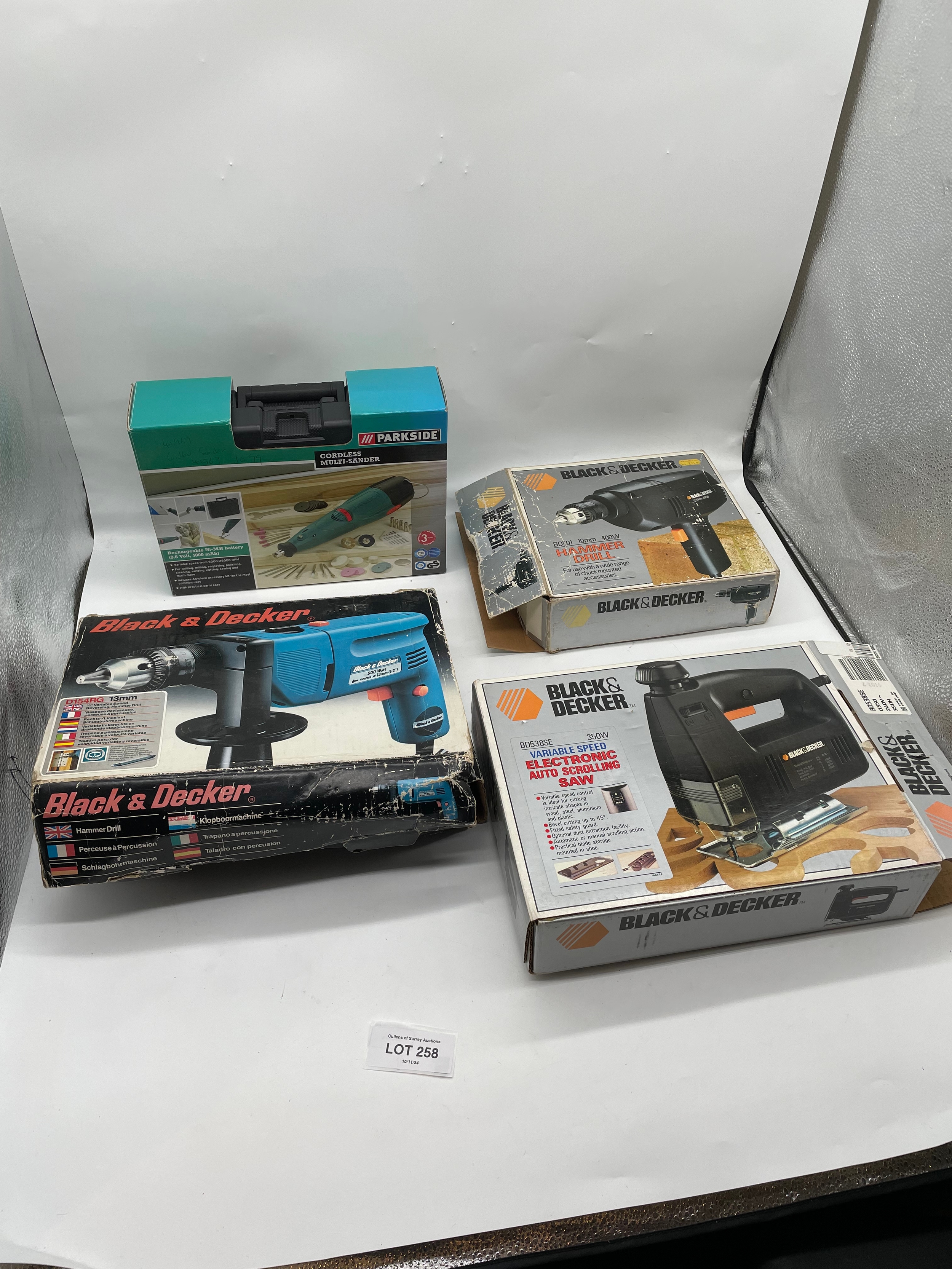 A selection of boxed power tools including Black and decker hammer drills, scrolling saw and Parkside Multi screwdriver