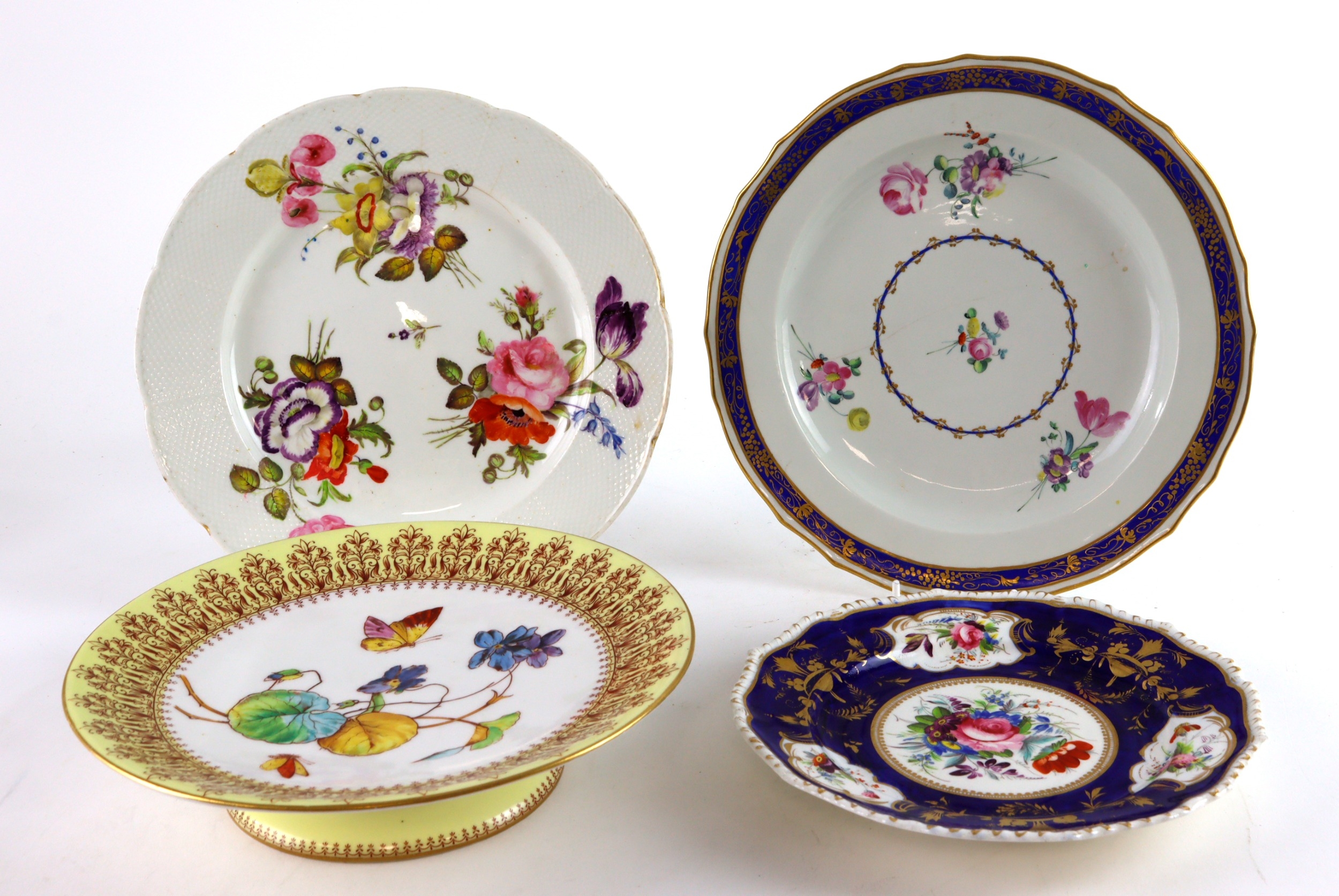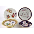 Three Derby Plates, two 1780 and one 1800, along with a footed Derby Crown Porcelain Co. Ltd c1880, two of the Derby plates with some damage (4)