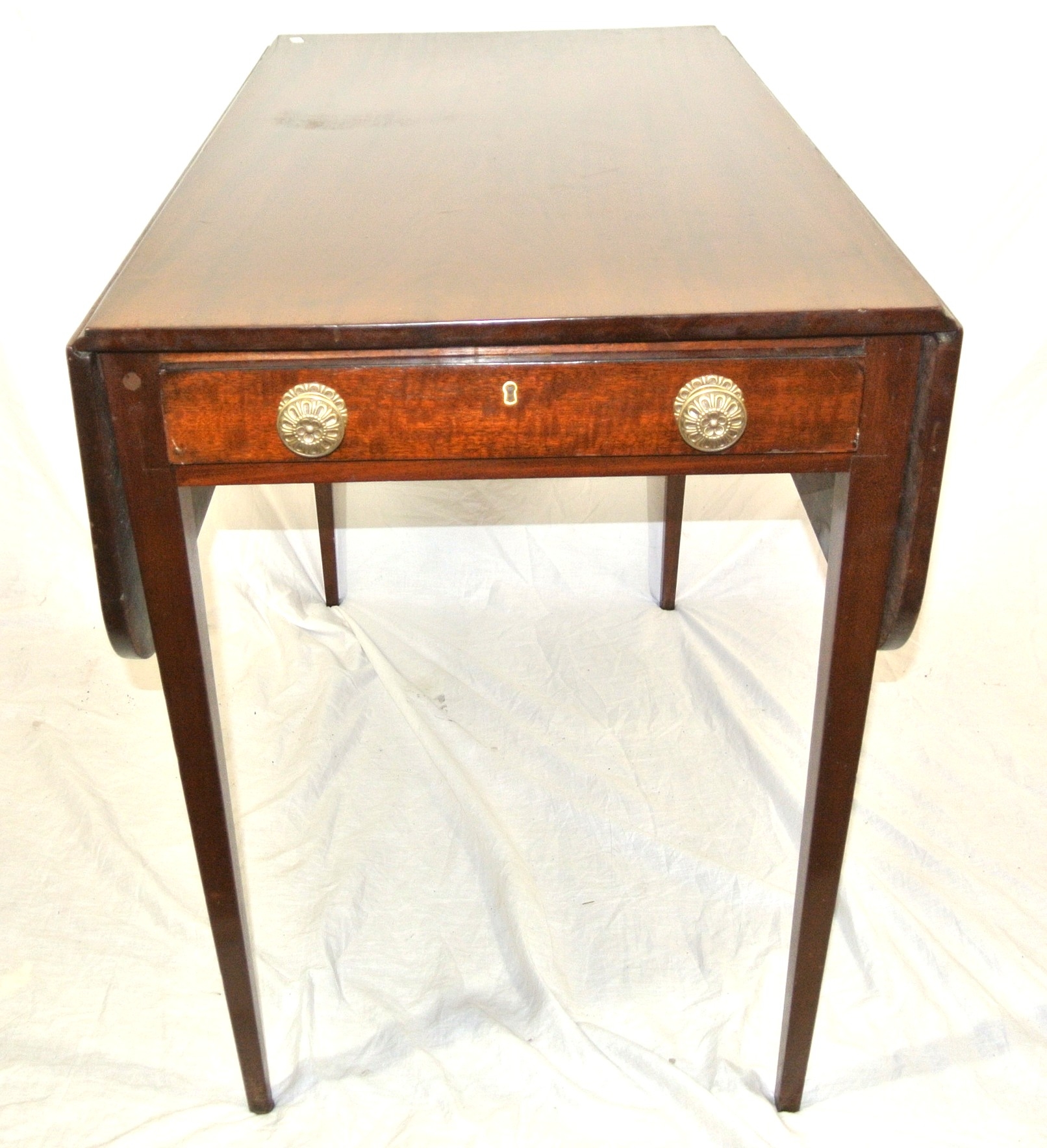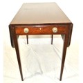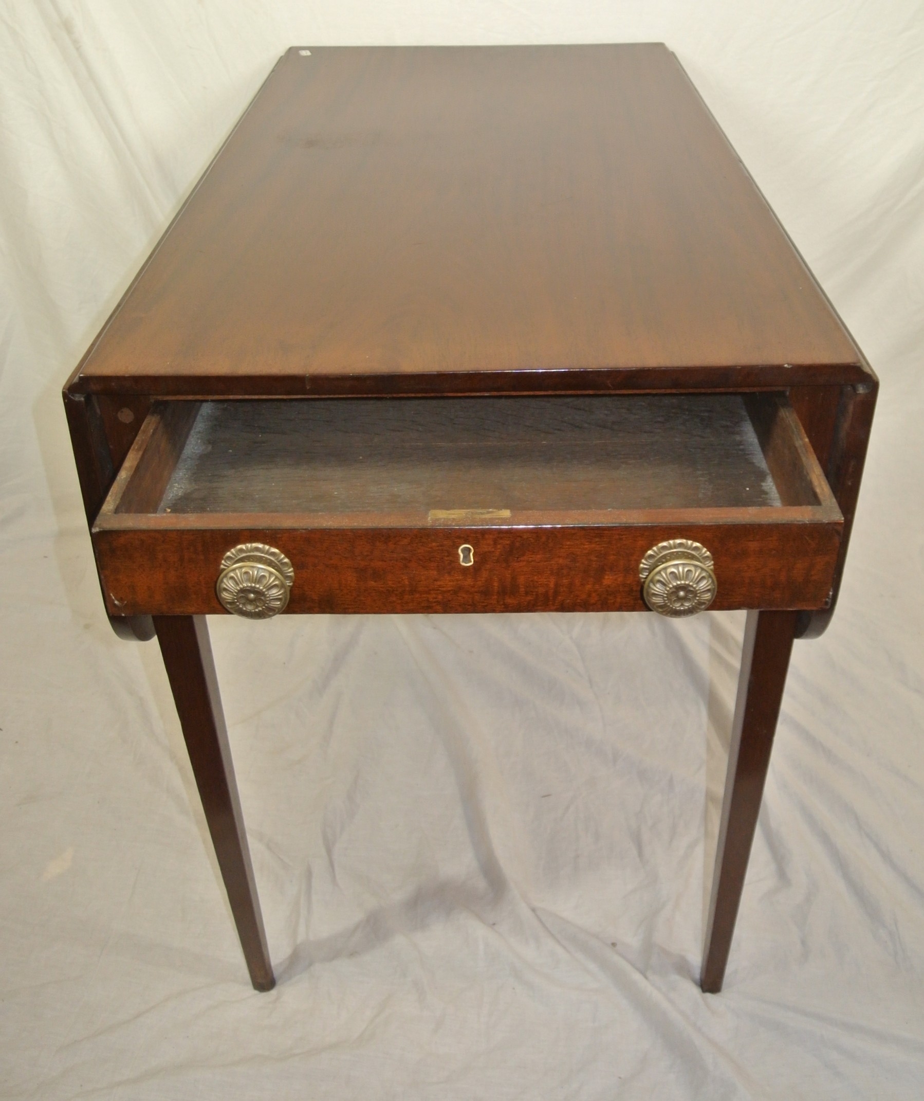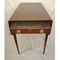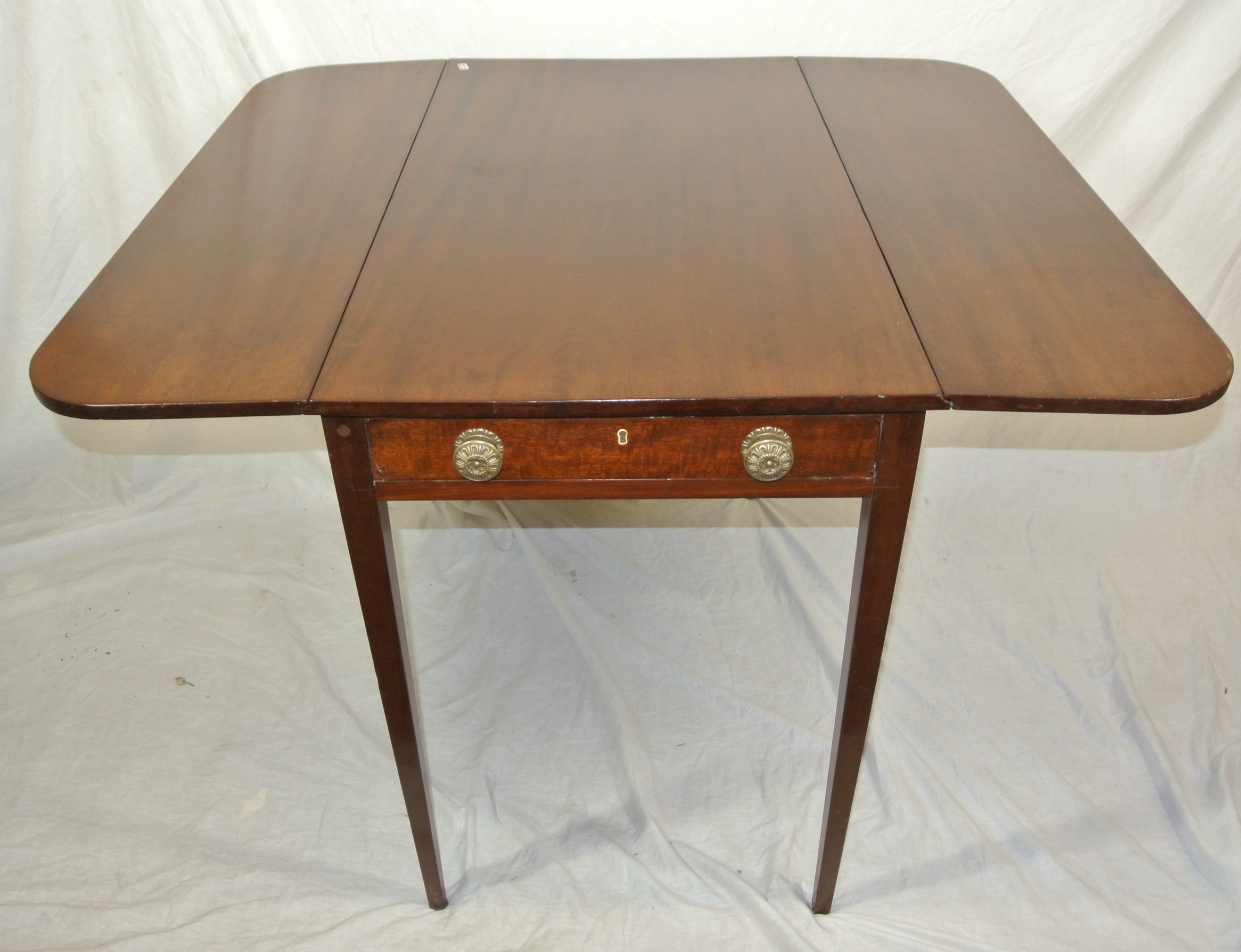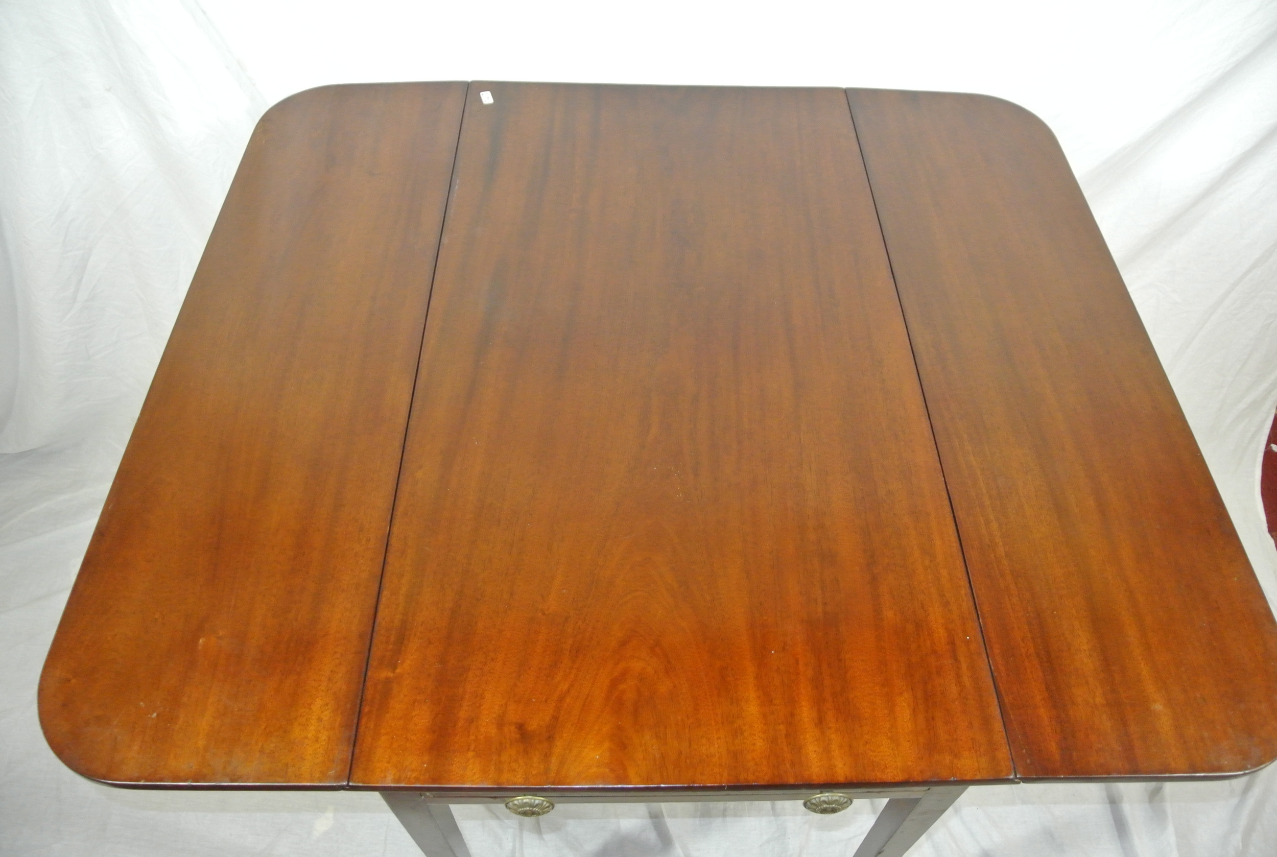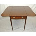 Edwardian mahogany dropleaf table with rounded borders, pull-out supports, frieze drawer with brass handles, on square tapering legs