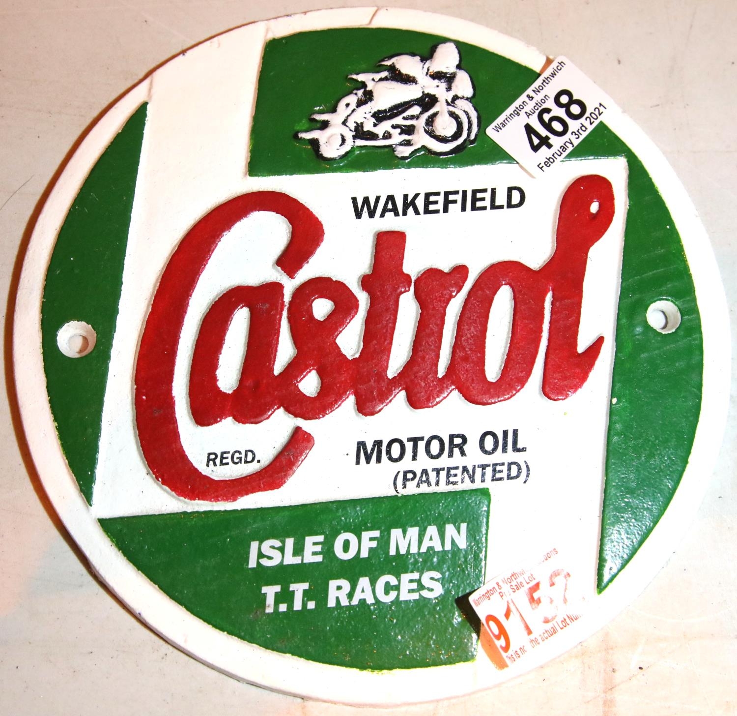 Cast iron Castrol Wakefield sign, D: 25 cm. P&P Group 1 (£14+VAT for the first lot and £1+VAT for subsequent lots)