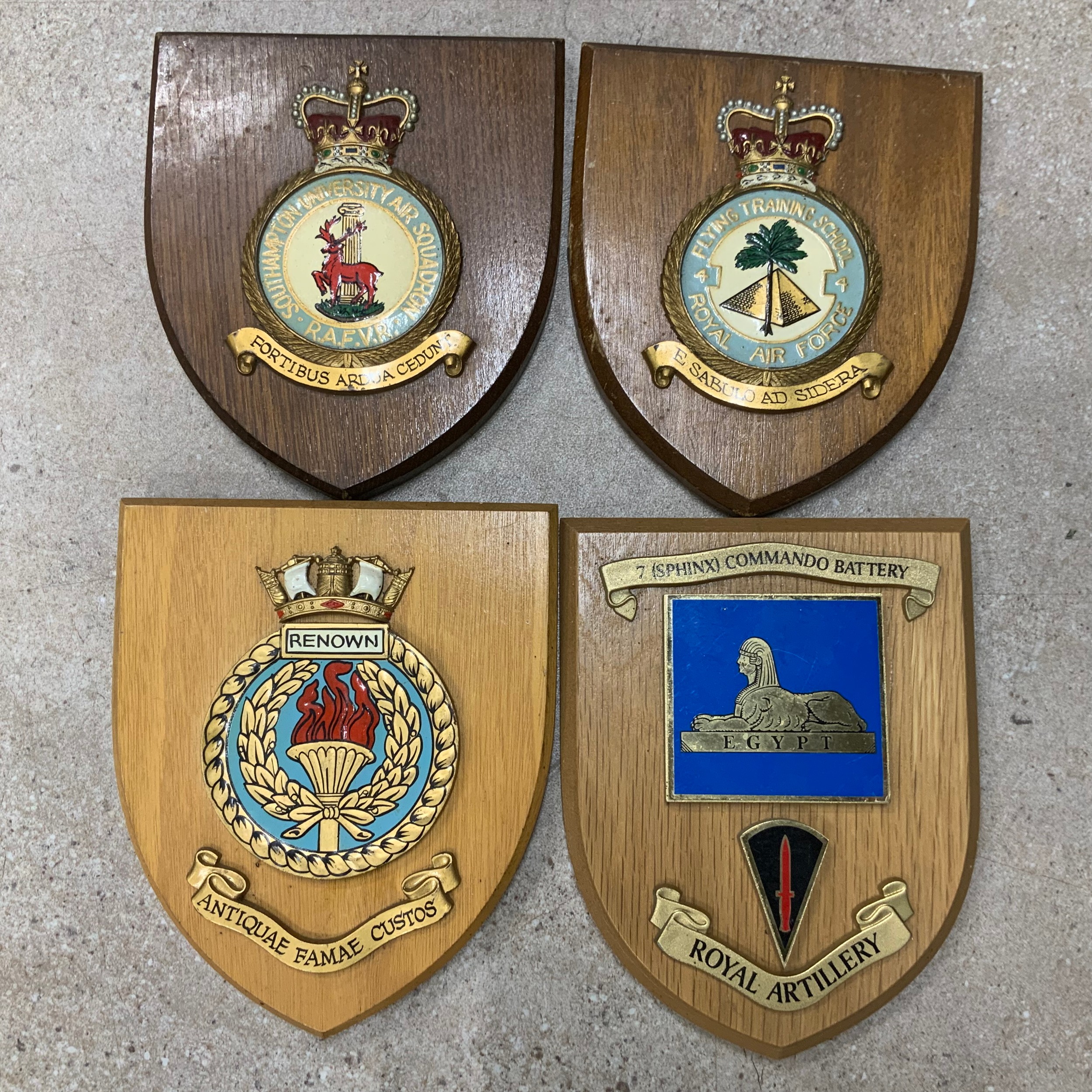 A collection of military regimental plaques, to include royal Artillery, Southampton University Air Squadron, RAF Flying Training School and one other.