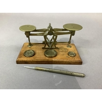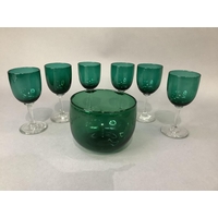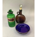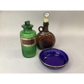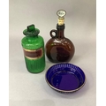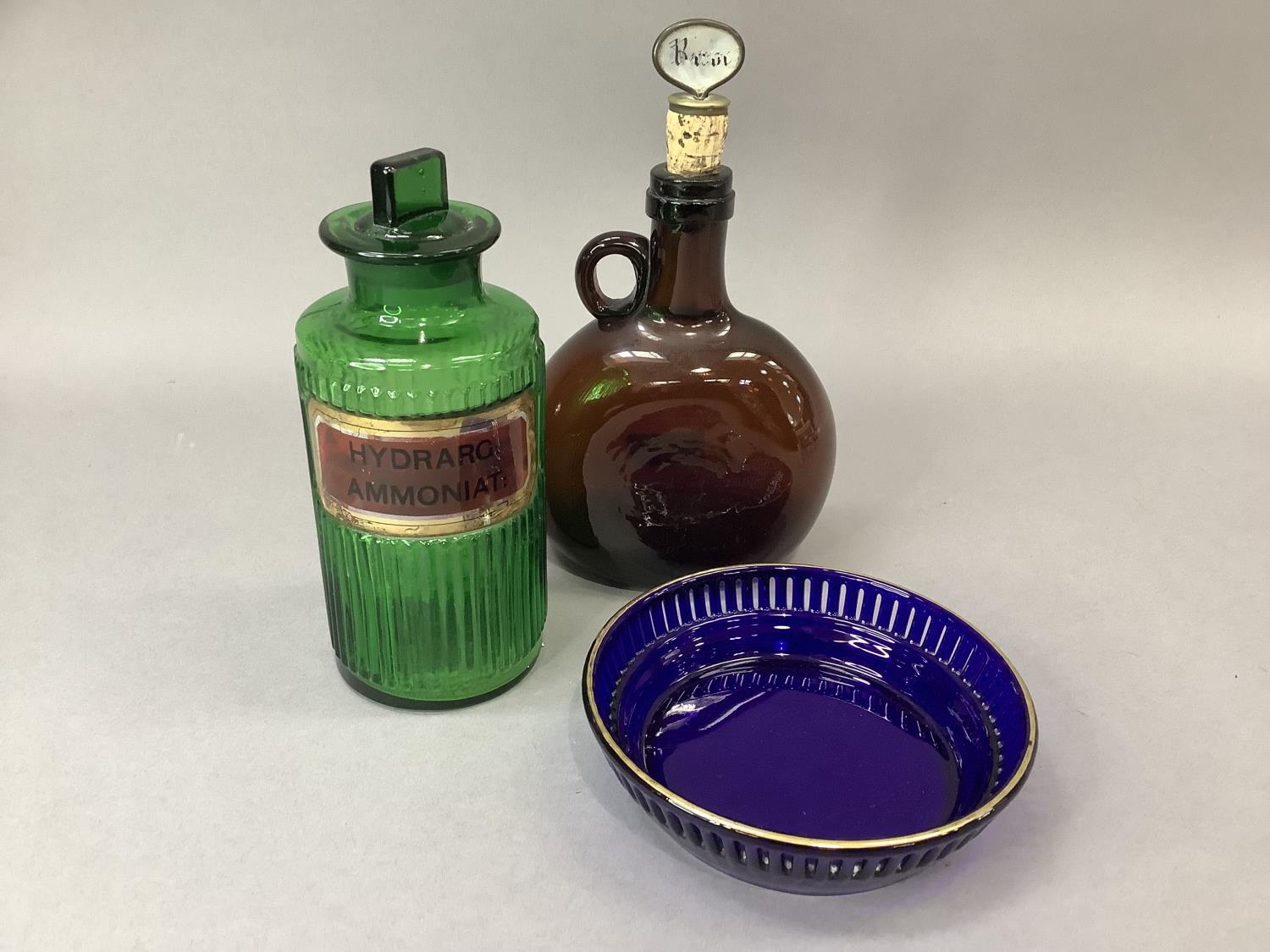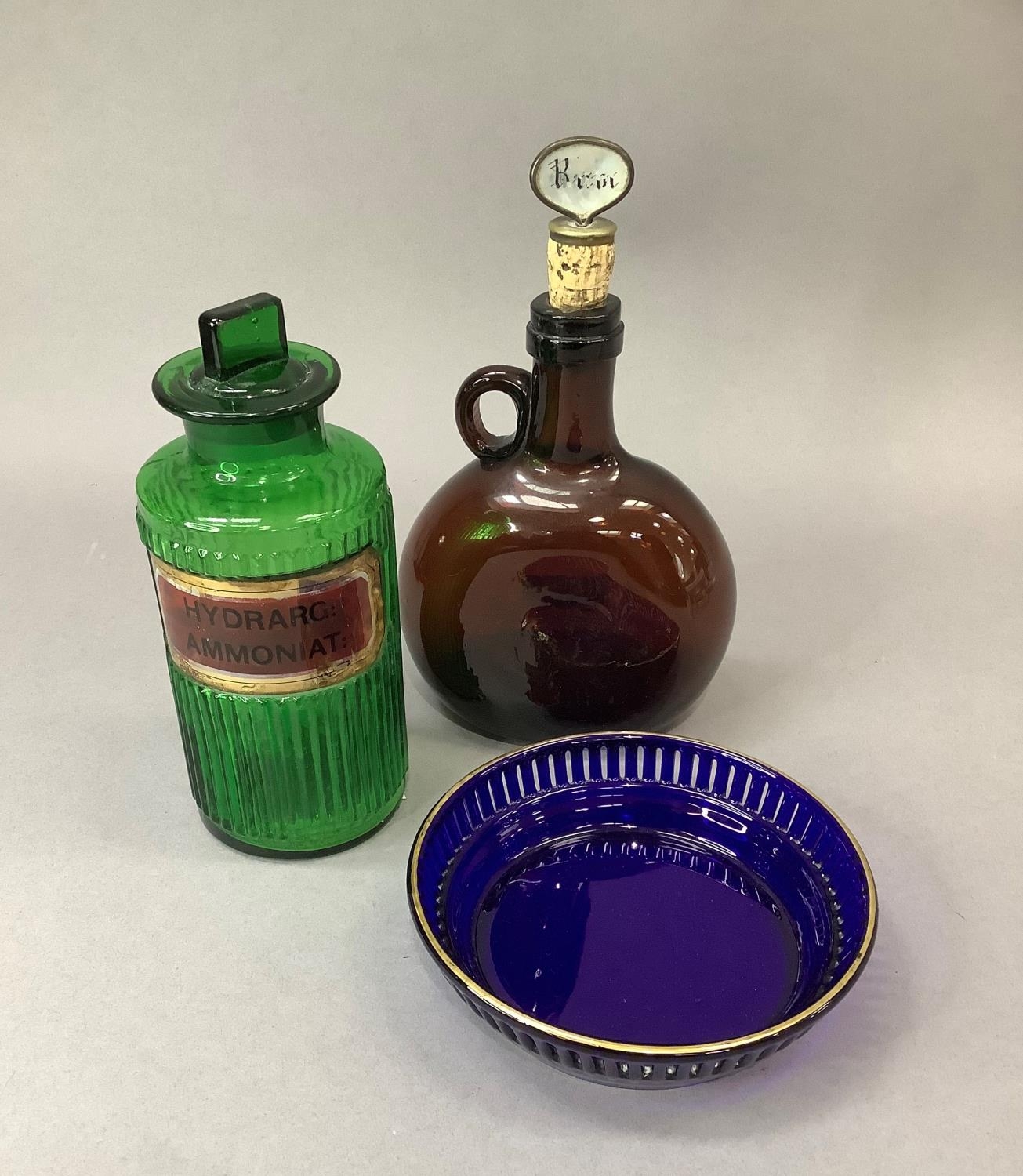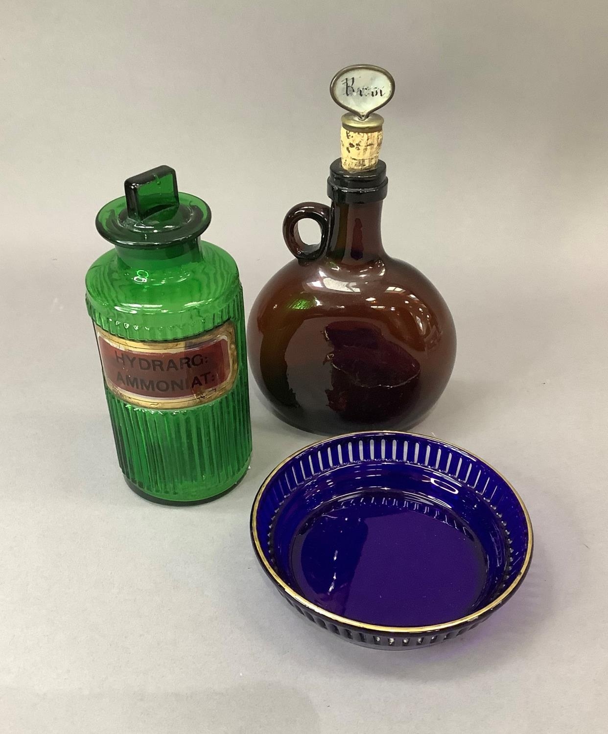 A green glass pharmacy bottle, ribbed and with gilt label for Hydrarg:ammoniat, 19cm high together with a brown glass decanter with single loop handle, 17cm with rum stopper and a blue glass bowl with pierced and gilt rim, 15cm diameter