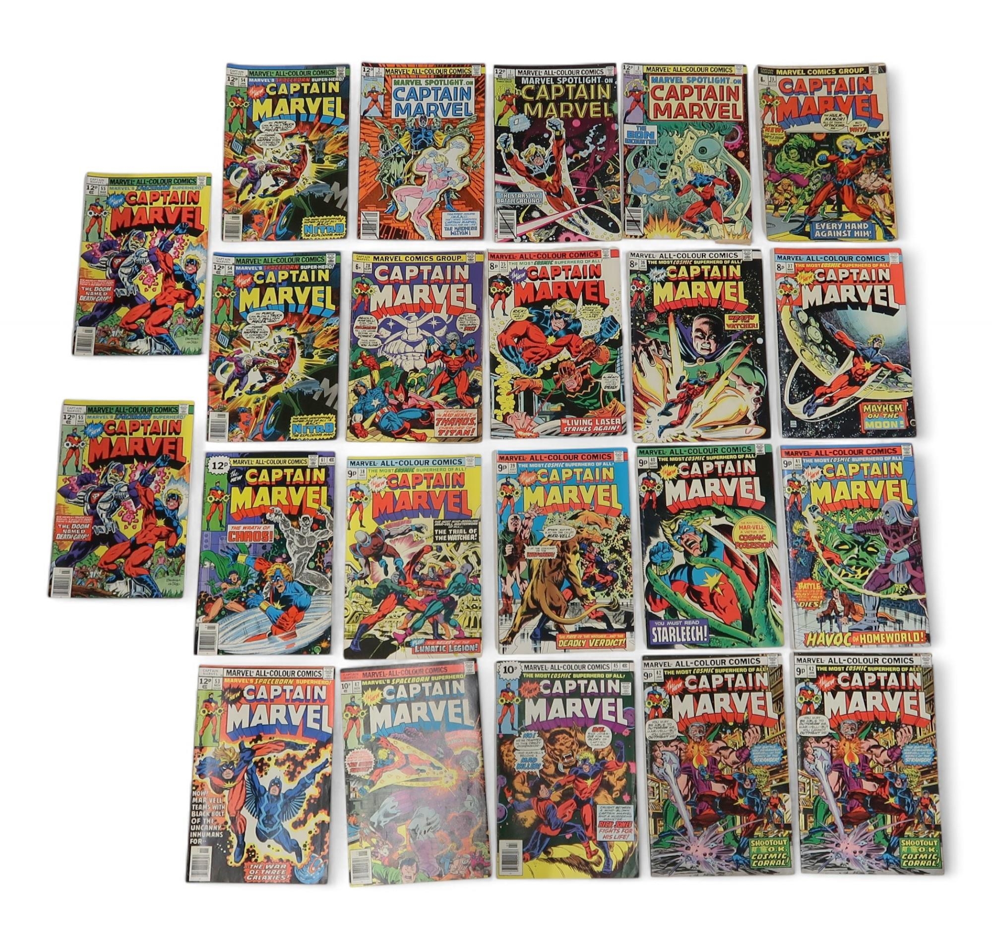 Marvel; Captain Marvel 25, 28, 35-42 (2 copies of 42), 45, 47, 53-55 (2 copies of 54 & 55), 61, Marvel Spotlight 1-3 (UK price variant)