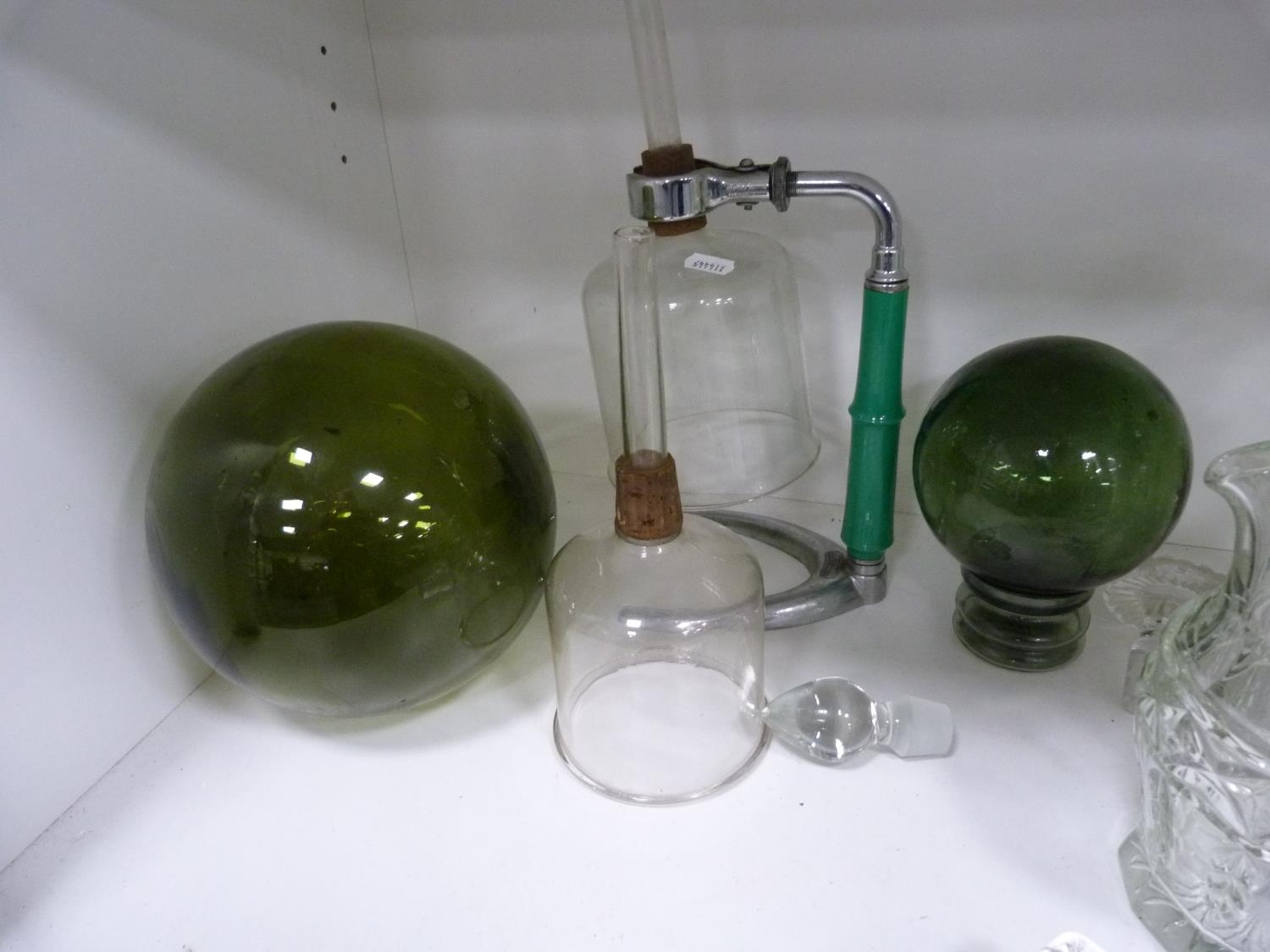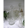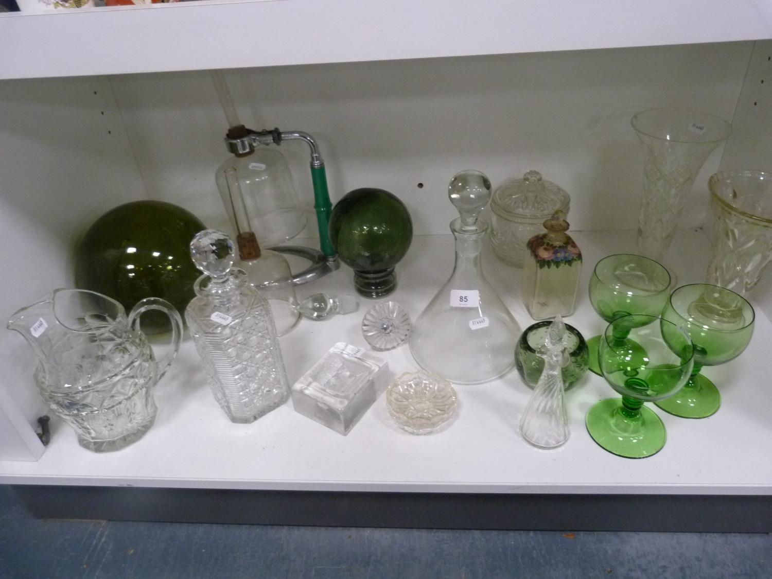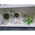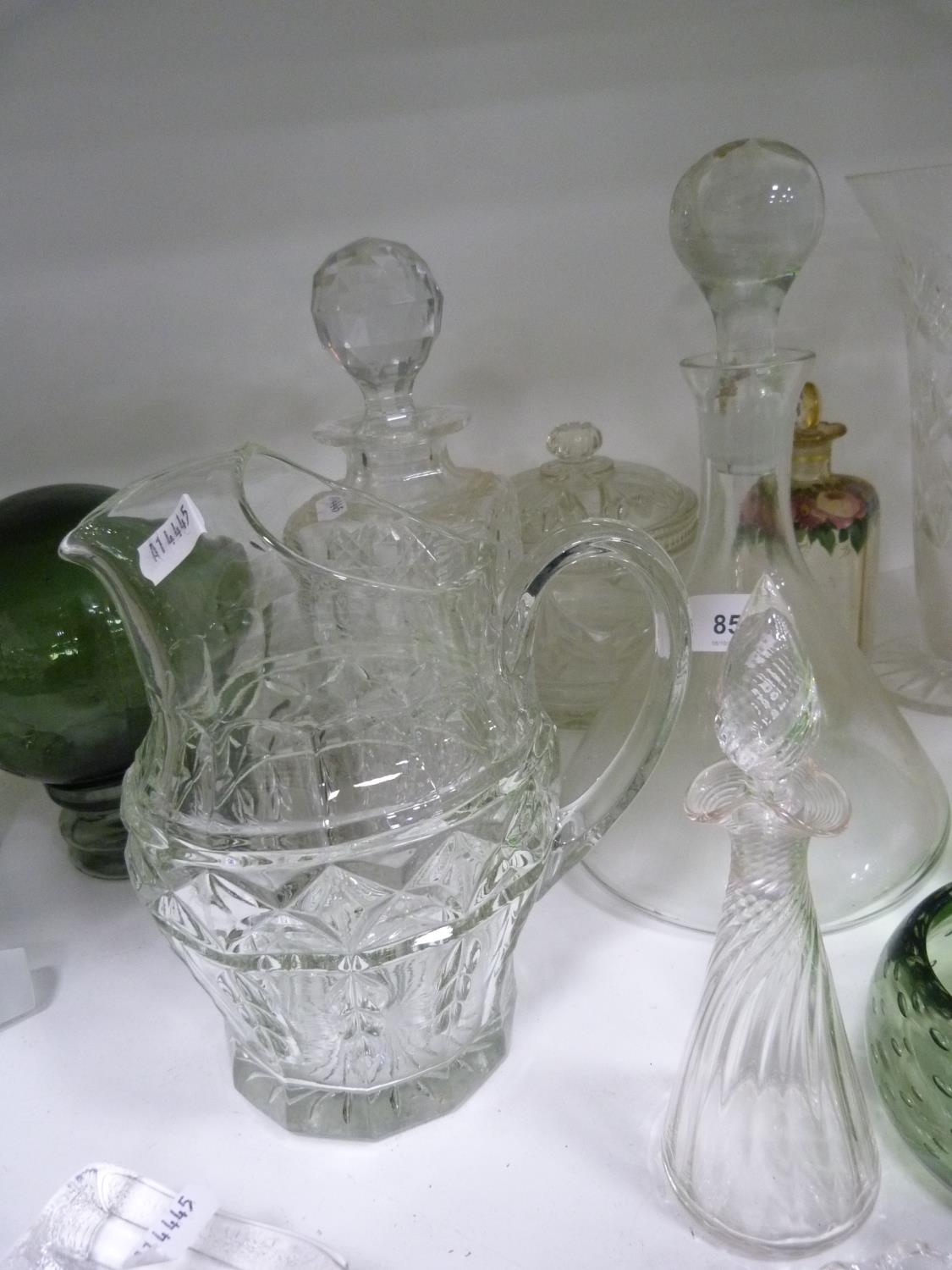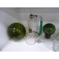 Decanters, green glasses, perfume bottle with stopper, jug, ashtray, green glass float, spare decanter stoppers etc.