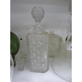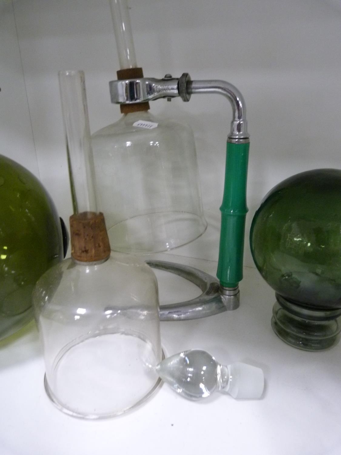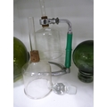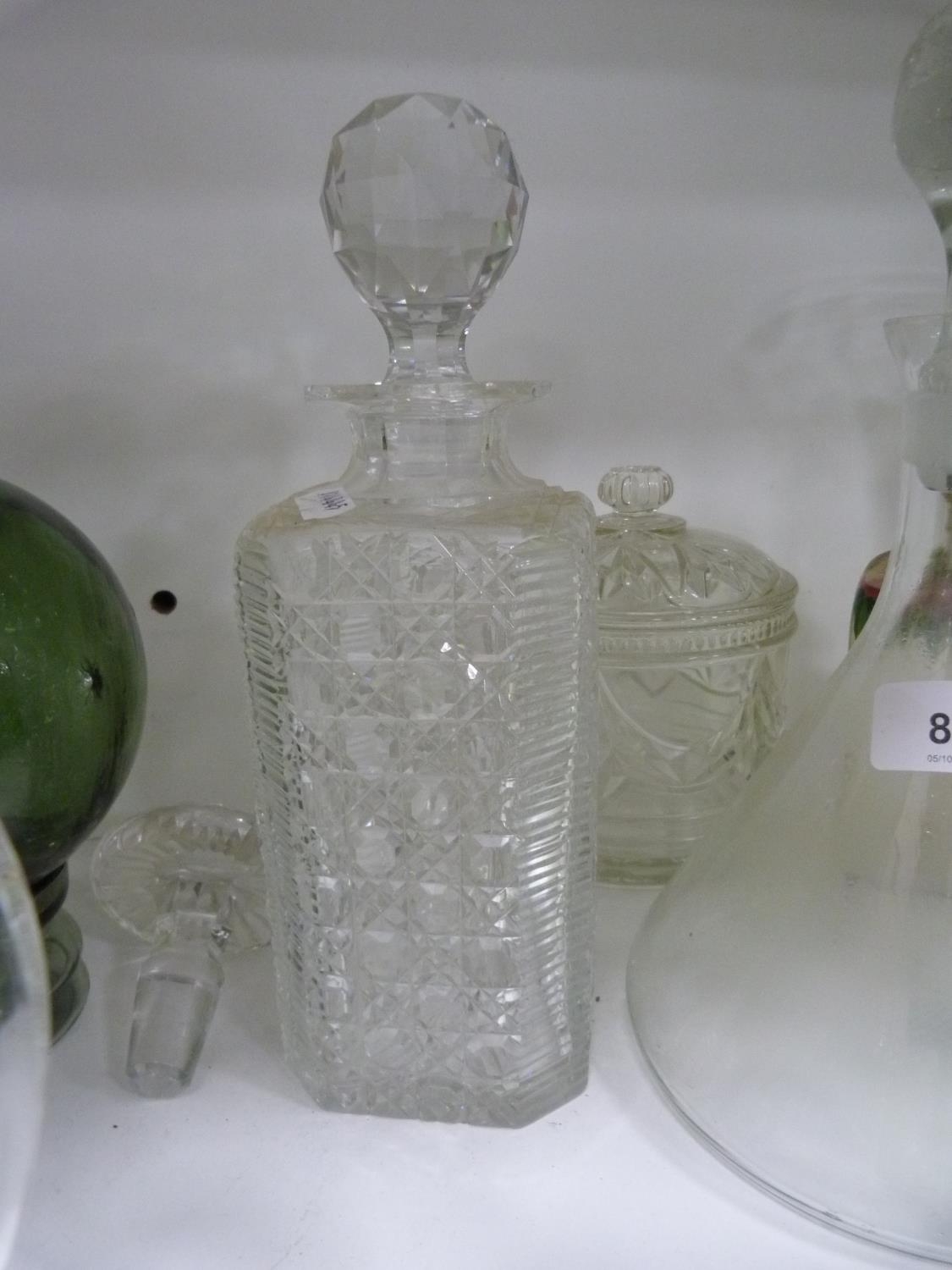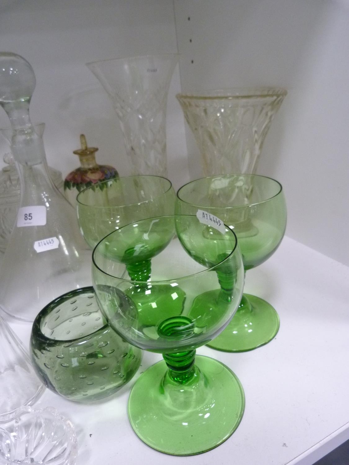 Decanters, green glasses, perfume bottle with stopper, jug, ashtray, green glass float, spare decanter stoppers etc.
