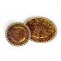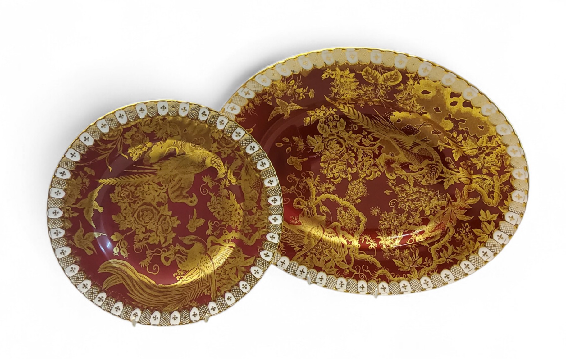 A Royal Crown Derby Gold Aves pattern shaped oval serving plate, on a red ground, heraldic border, 38cm wide, printed mark, second; a similar shaped circular dinner plate, 27cm diam, printed mark, second (2)