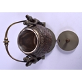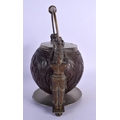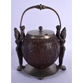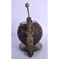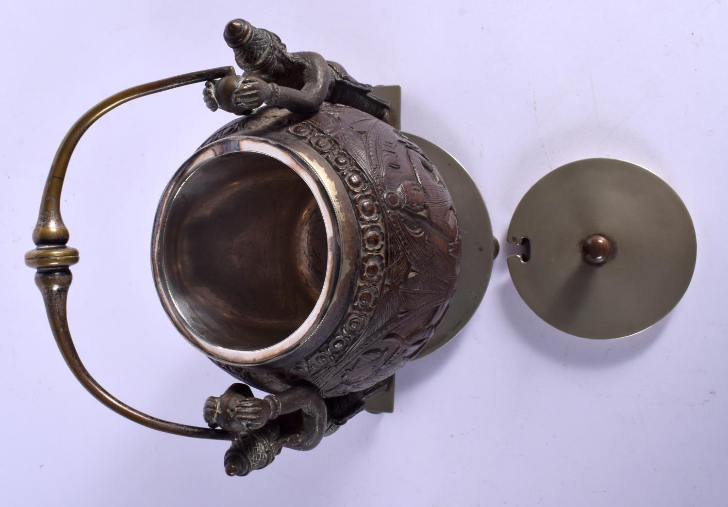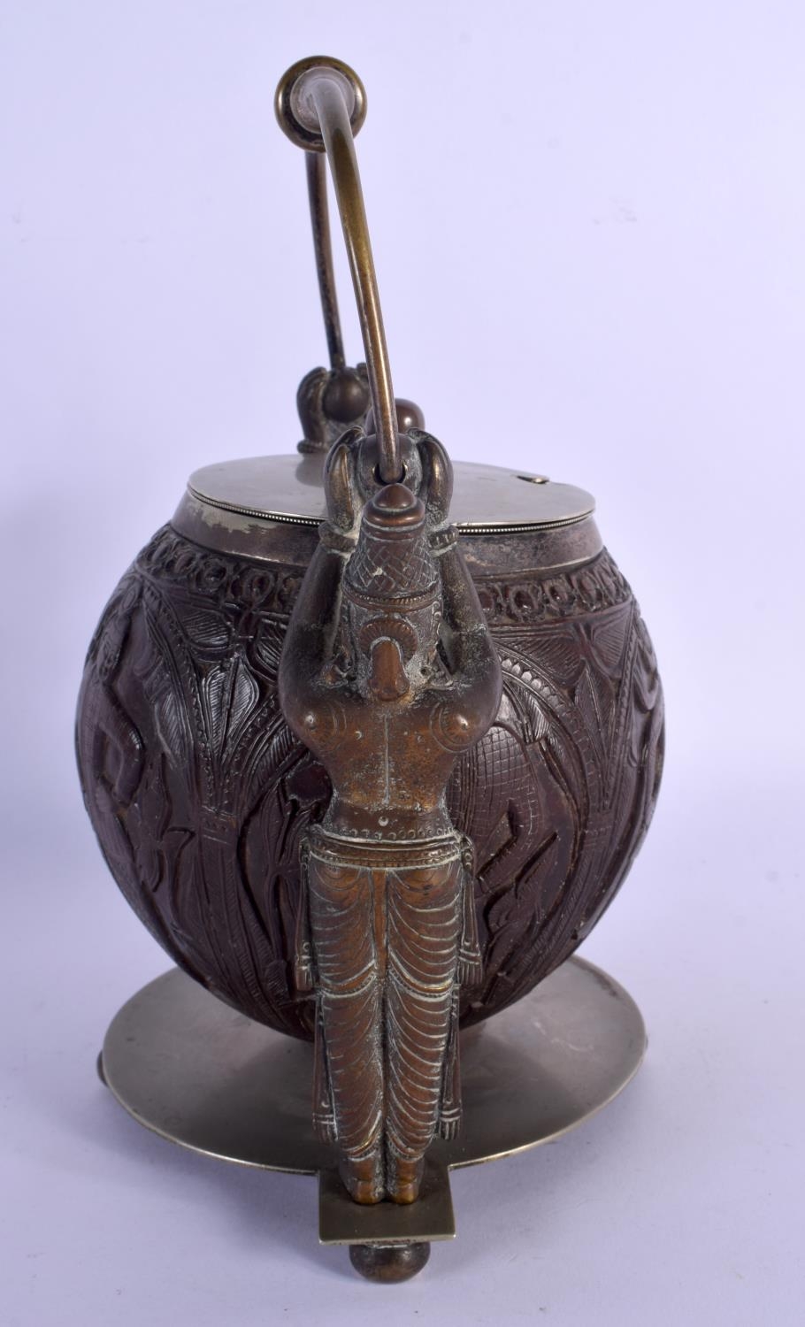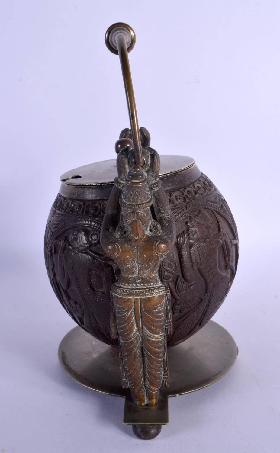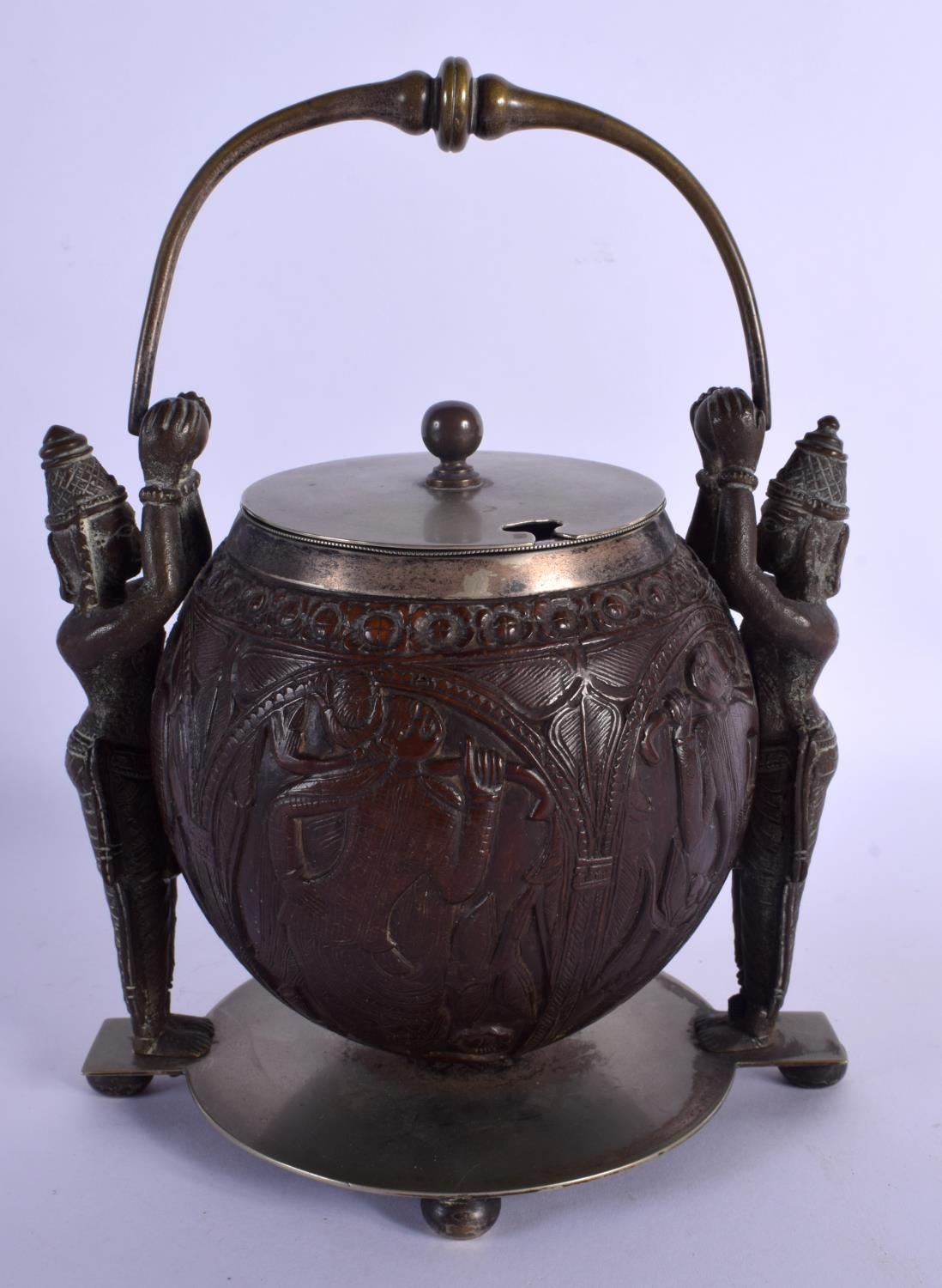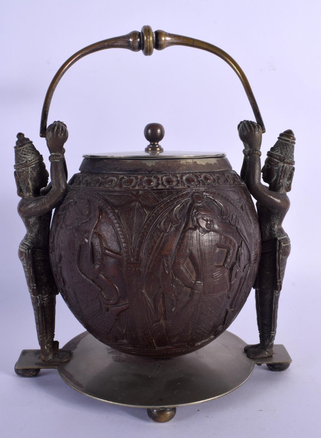 A VERY RARE 19TH CENTURY INDIAN CARVED COCONUT SHELL BOWL AND COVER with two standing Buddhistic bronze attendants. 24 cm x 15 cm.