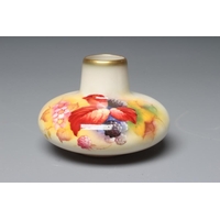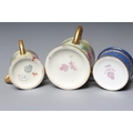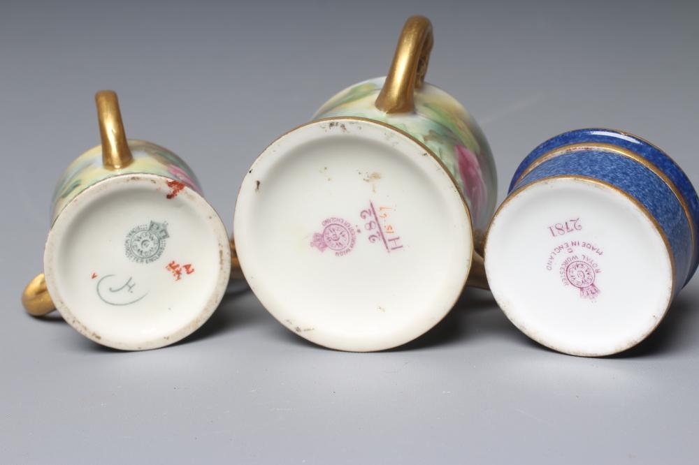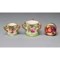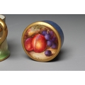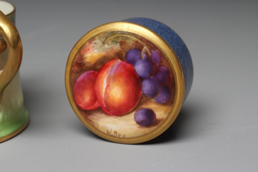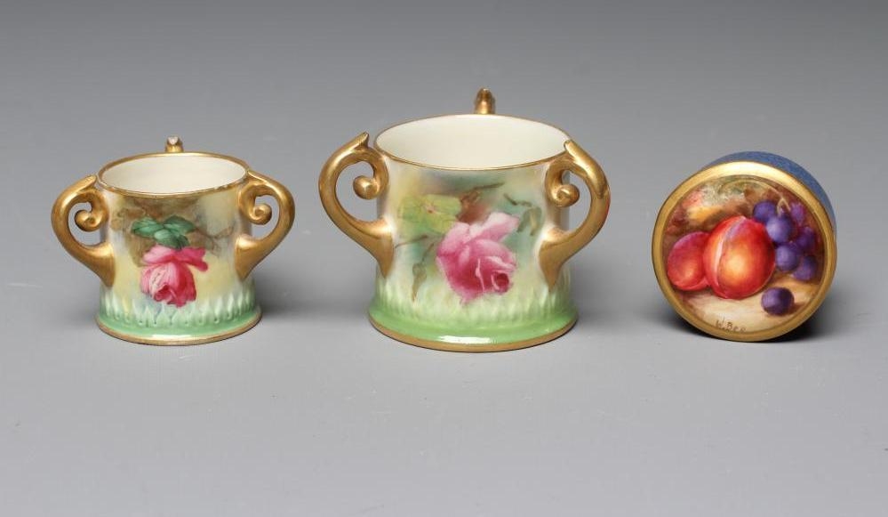 A ROYAL WORCESTER SMALL BOX AND COVER, 1928, of plain cylindrical form, painted by W Bee with a still life of two plums and black grapes on a mossy bank, the base with powder blue ground, signed, puce mark, 1 3/4" diameter, together with two graduated miniature tygs, 1907 and 1917, both painted with pink roses on a shaded green ground, unsigned, green mark intialled JH, puce mark numbered 282/H, 1 1/2" high (3) (Est. plus 24% premium inc. VAT)