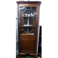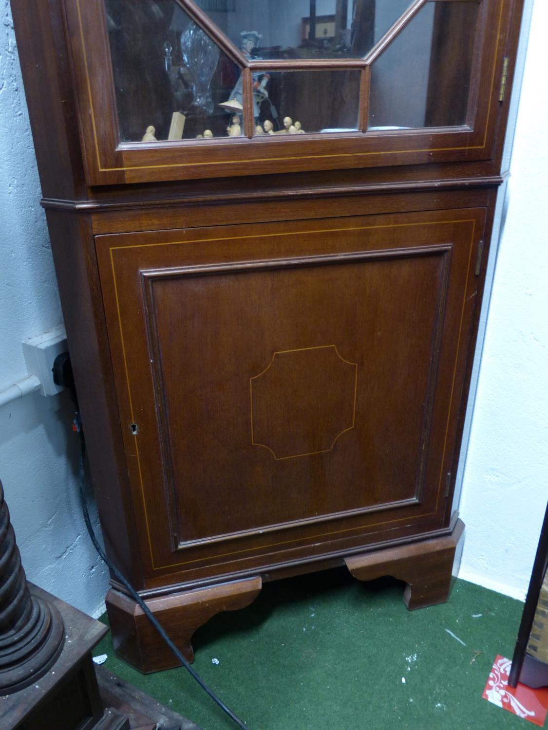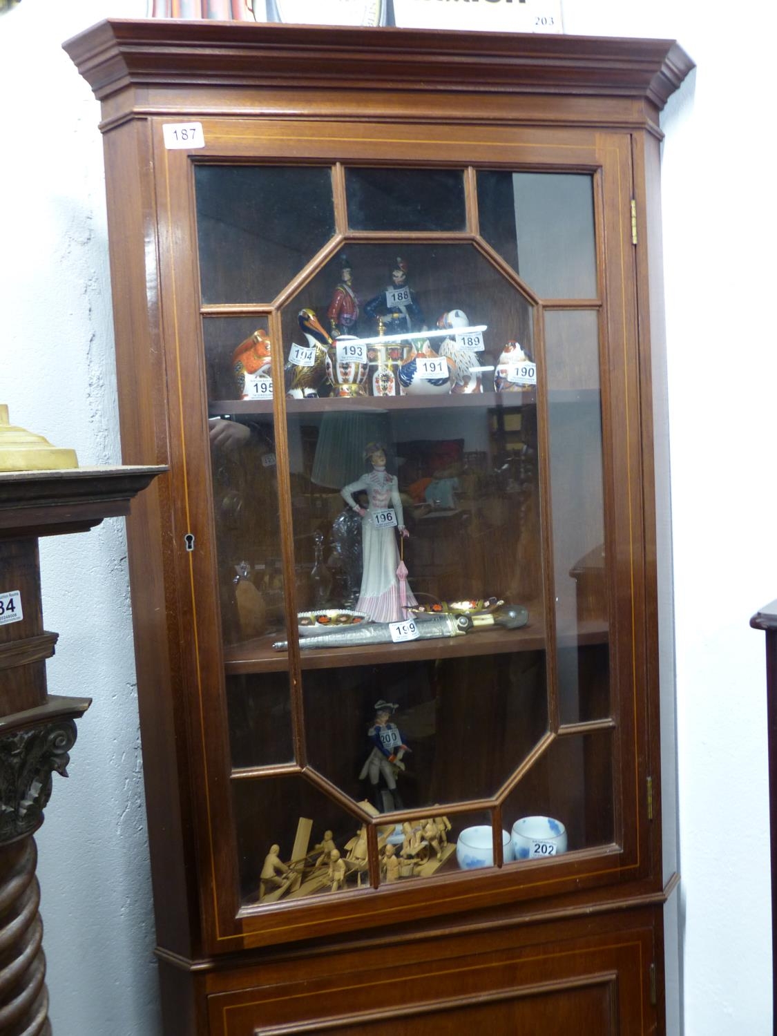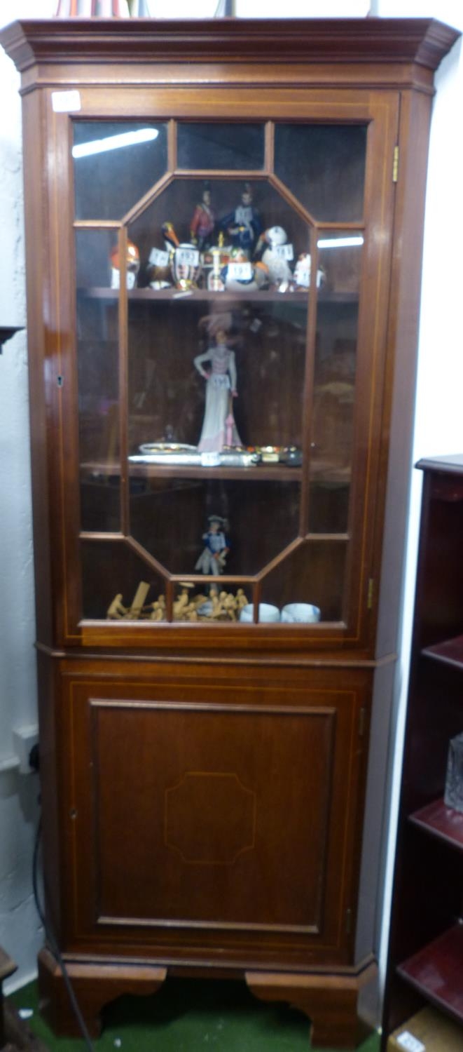 An antique/ Edwardian mahogany and inlaid corner cabinet with astral glazed door.