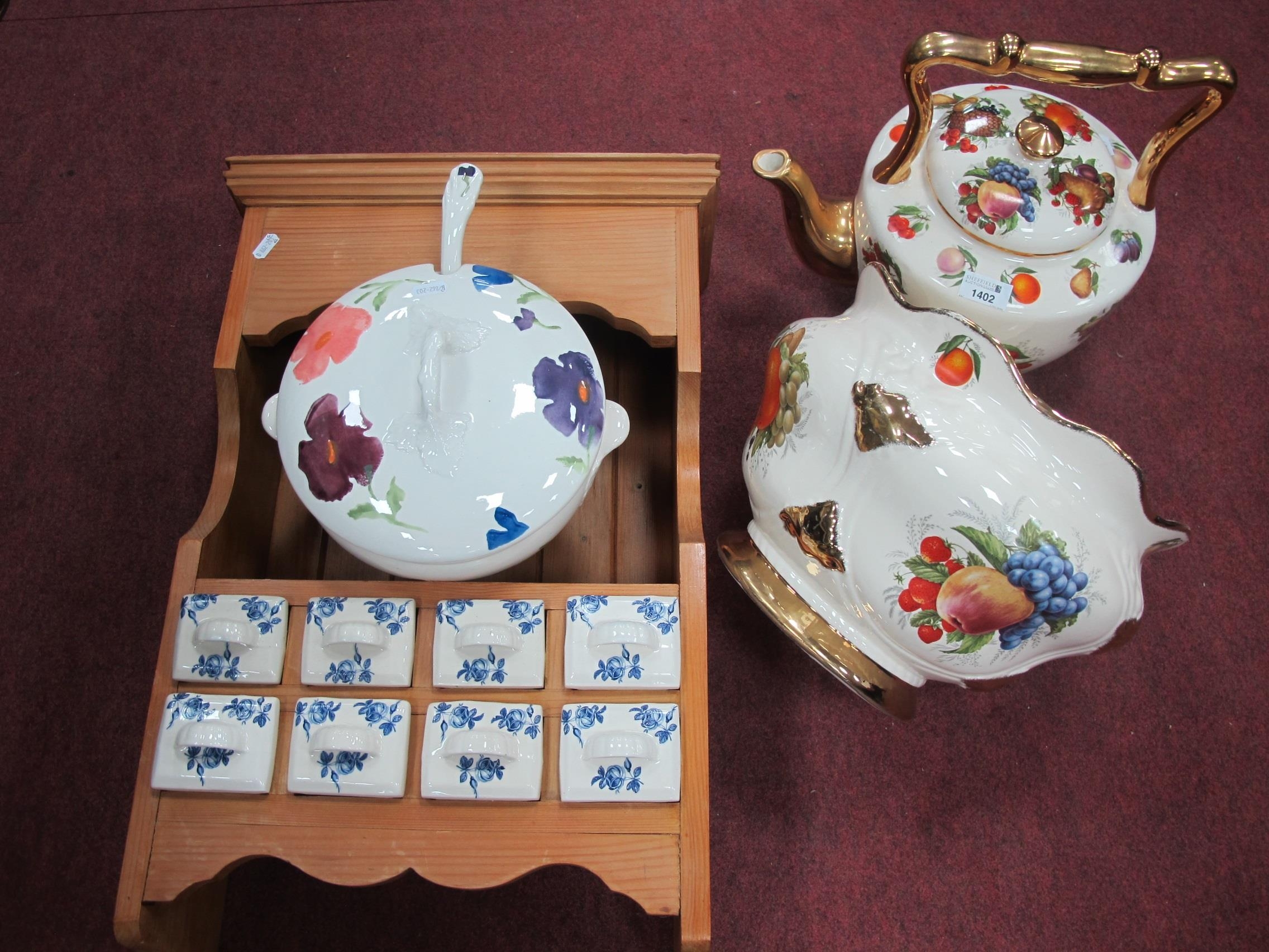 Pine wall rack with eight porcelain blue / white drawers together with a jardiniere and a Royal Winton tureen and ladle (three).