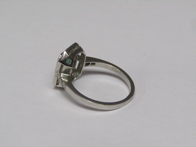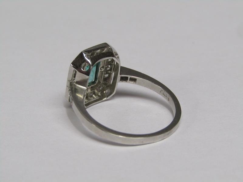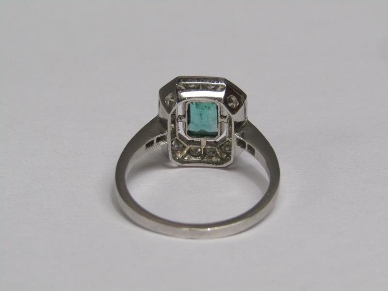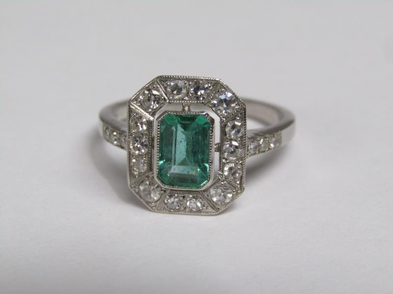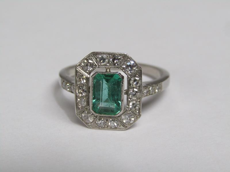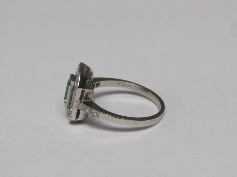 A platinum emerald (0.9ct) and diamond (total 0.5ct) cluster ring, size N/O.