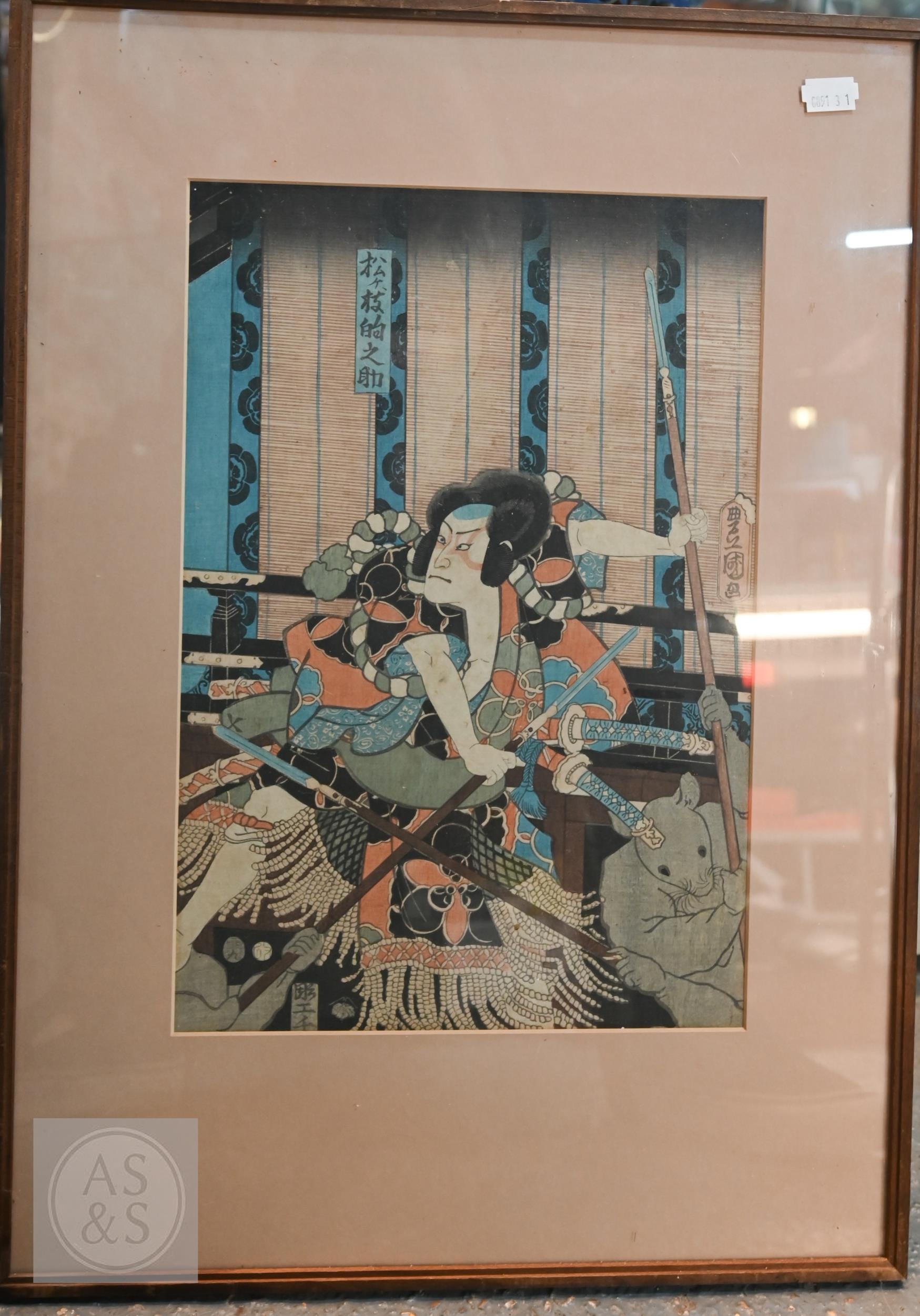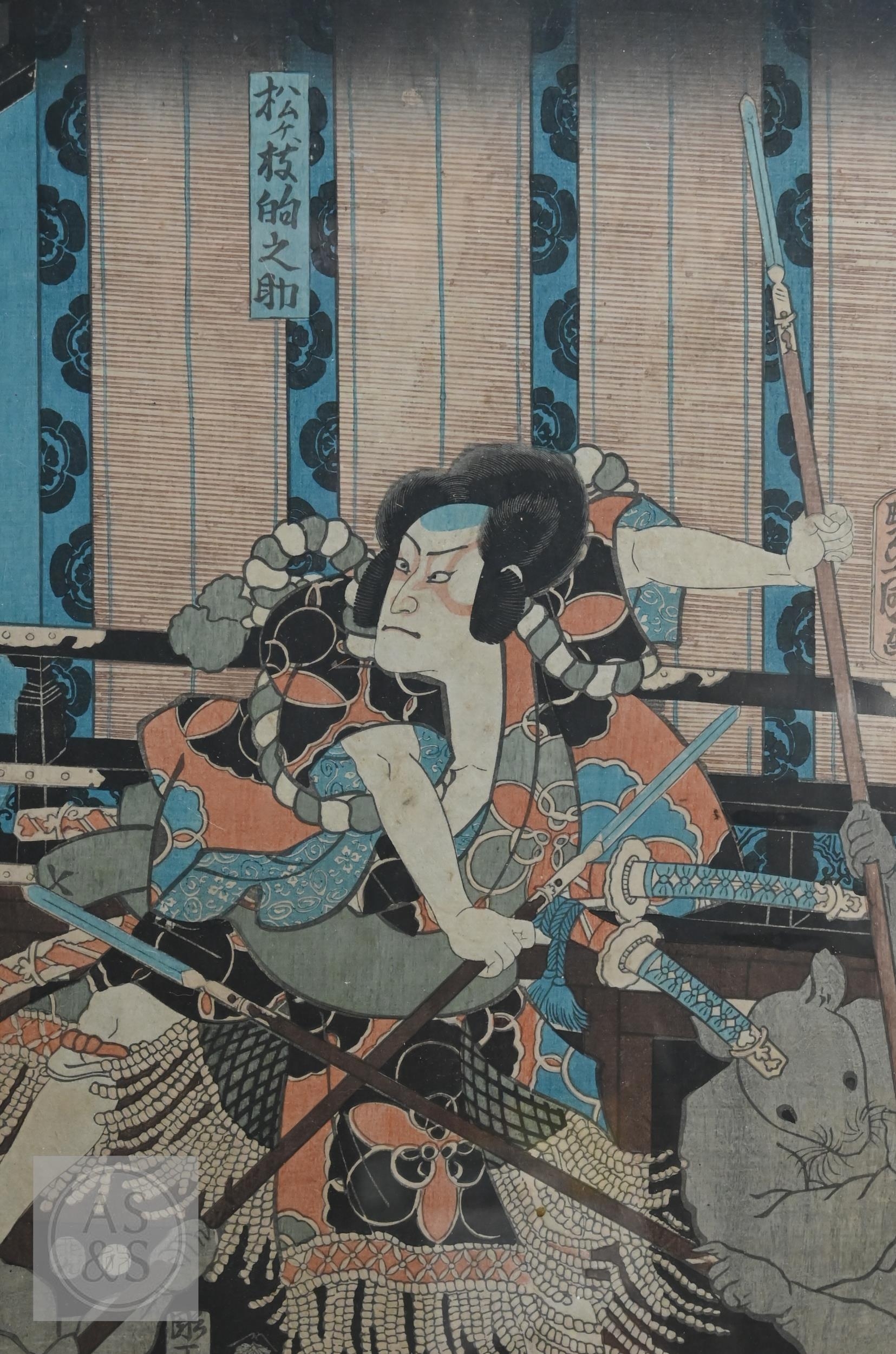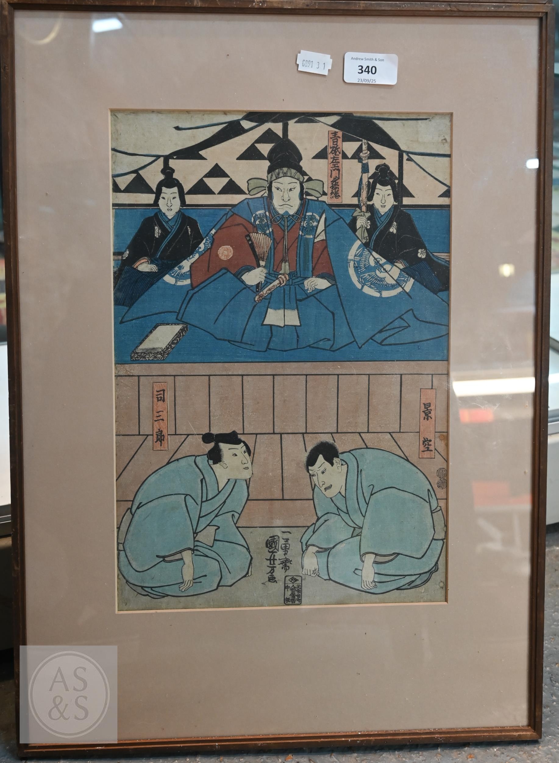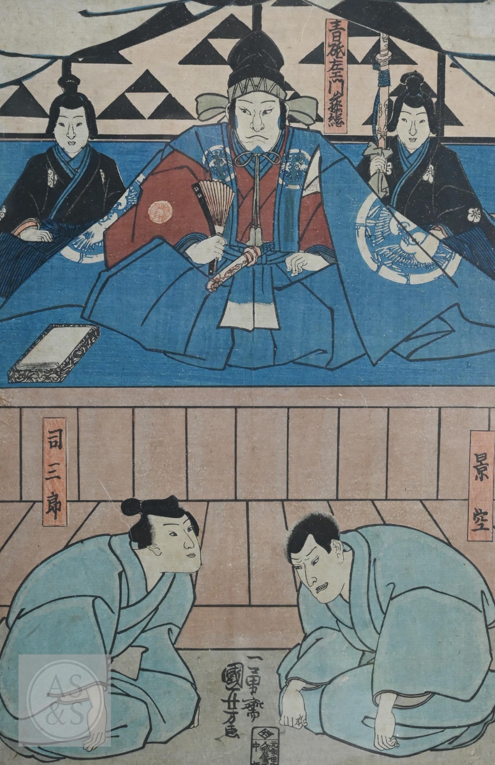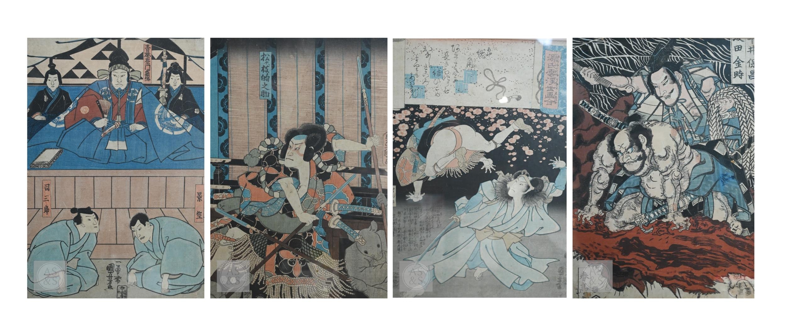 Utagawa Kunisada (aka Toyokuni III) two 19th century Japanese ukiyo-e woodblock prints depicting kabuki theatre scenes to/w two other similar examples of kabuki actors signed by Katsukawa Shuntei and Utagawa Kuniyoshi, Edo-Meiji period, image sizes 36 cm x 24 cm - all individually mounted, framed and glazed (4)