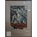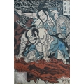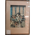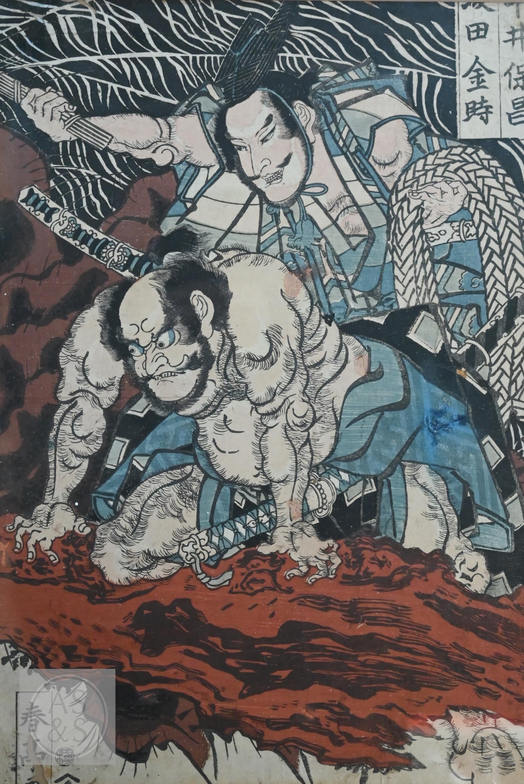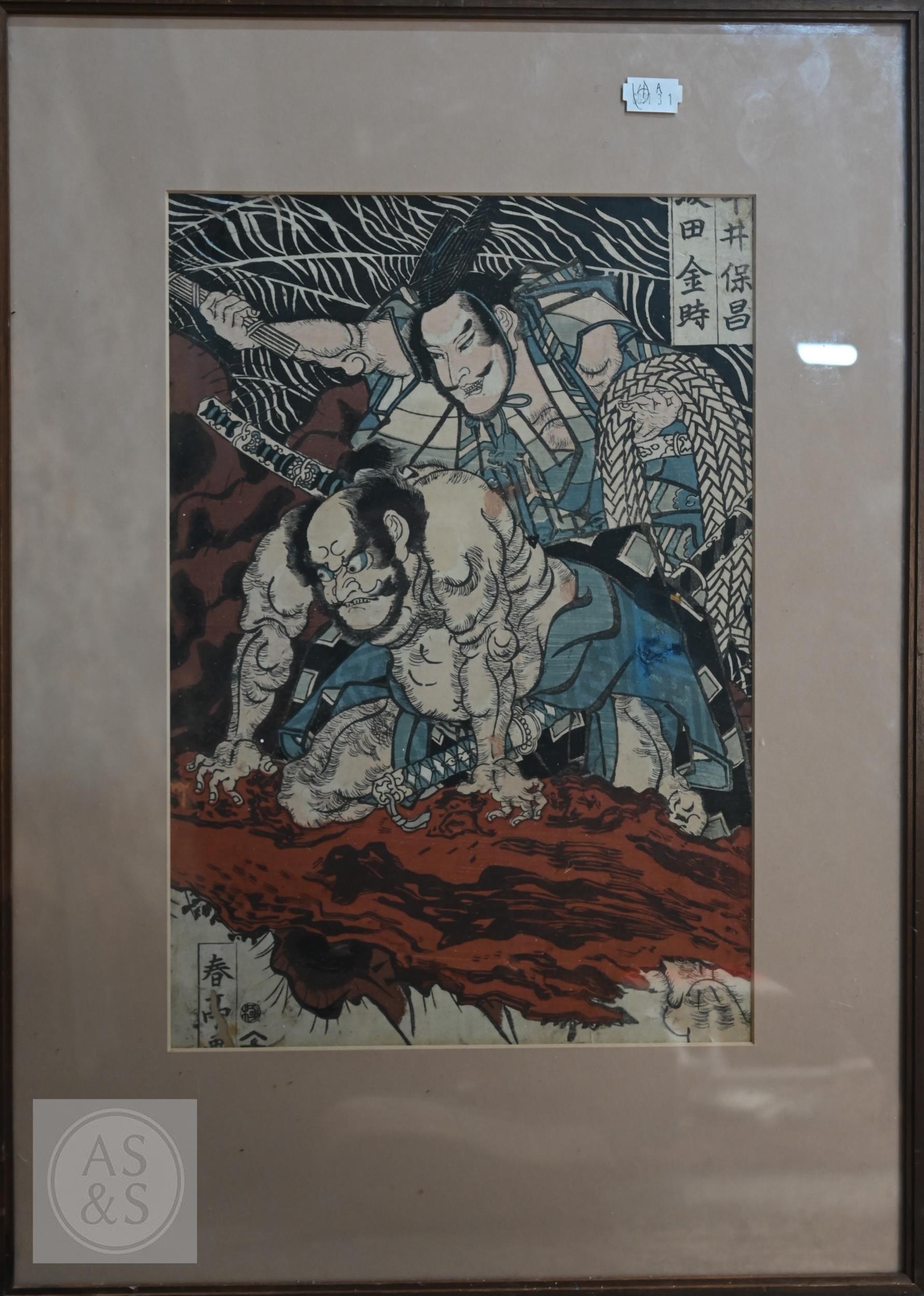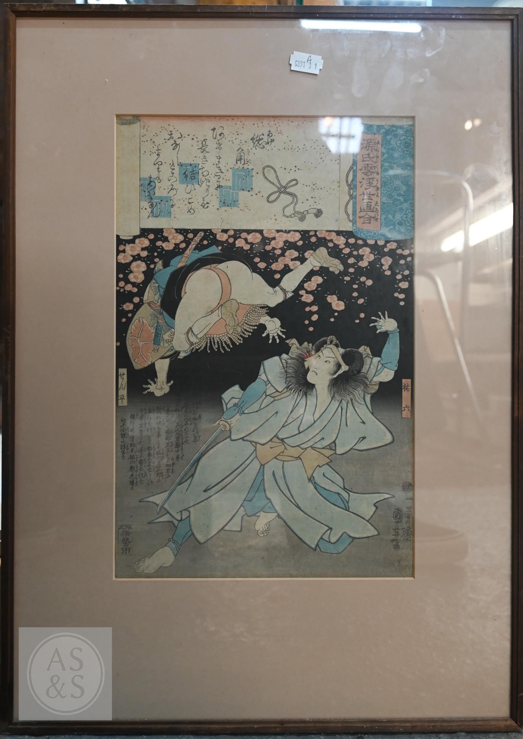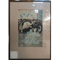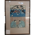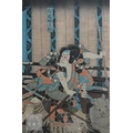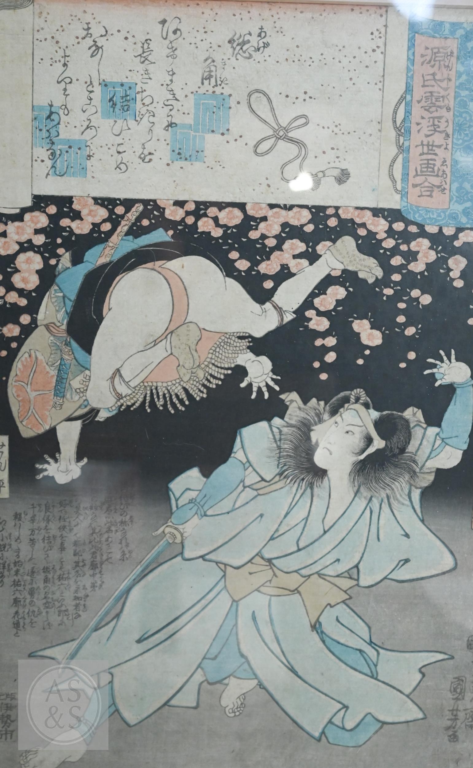 Utagawa Kunisada (aka Toyokuni III) two 19th century Japanese ukiyo-e woodblock prints depicting kabuki theatre scenes to/w two other similar examples of kabuki actors signed by Katsukawa Shuntei and Utagawa Kuniyoshi, Edo-Meiji period, image sizes 36 cm x 24 cm - all individually mounted, framed and glazed (4)