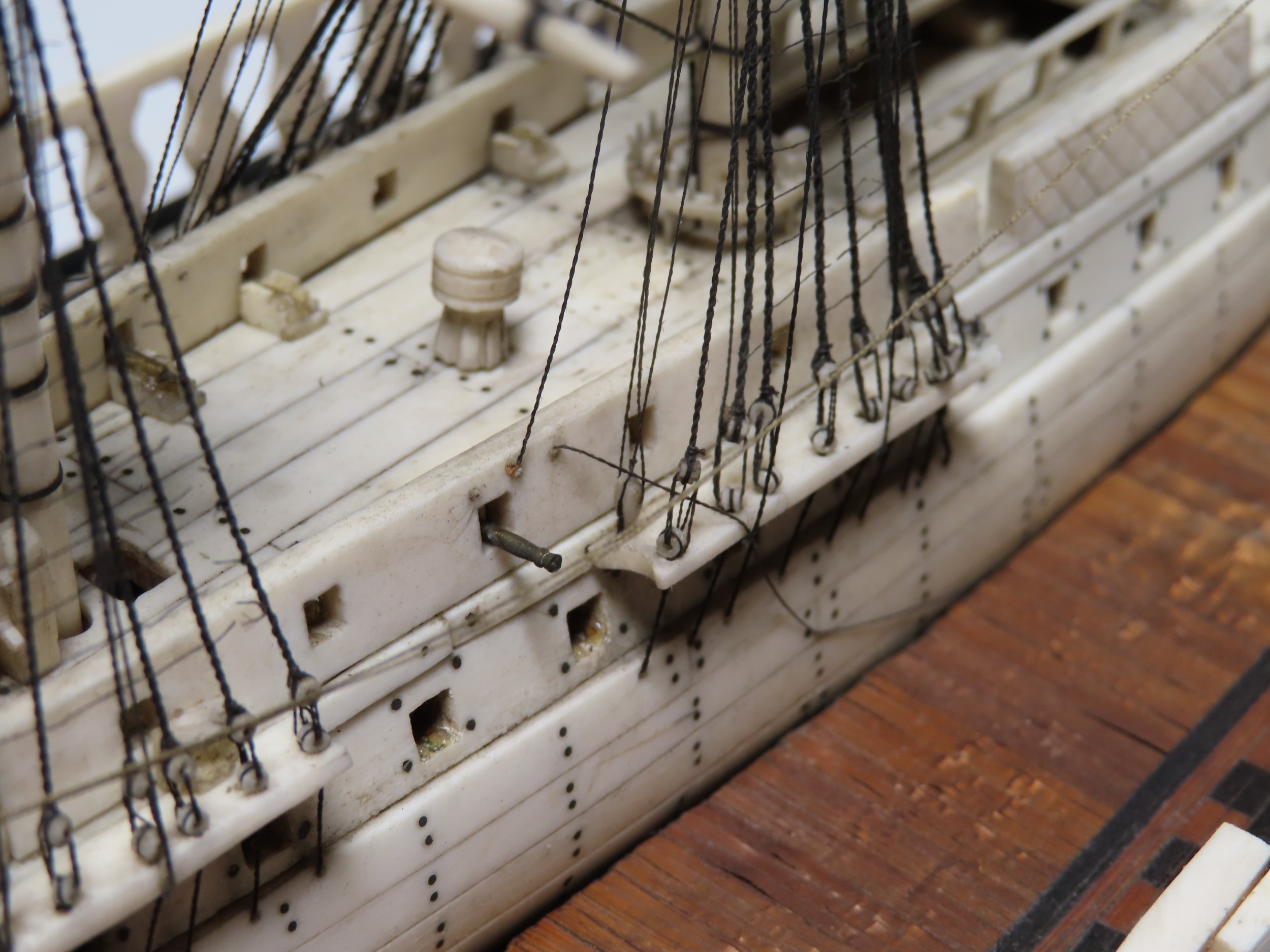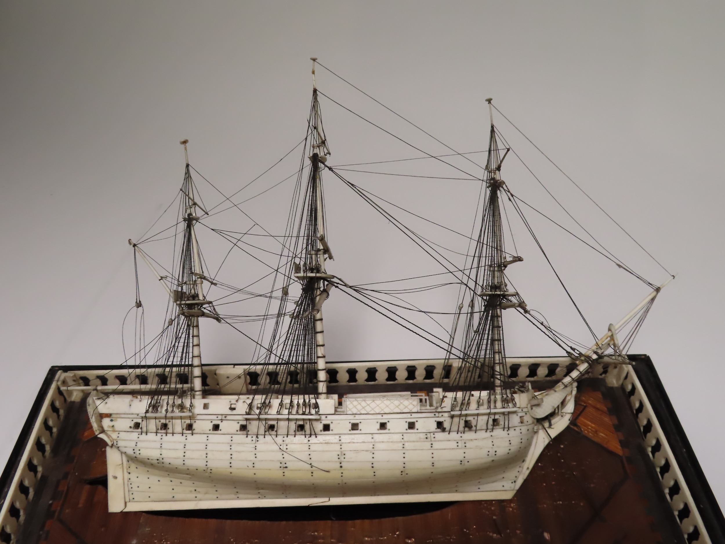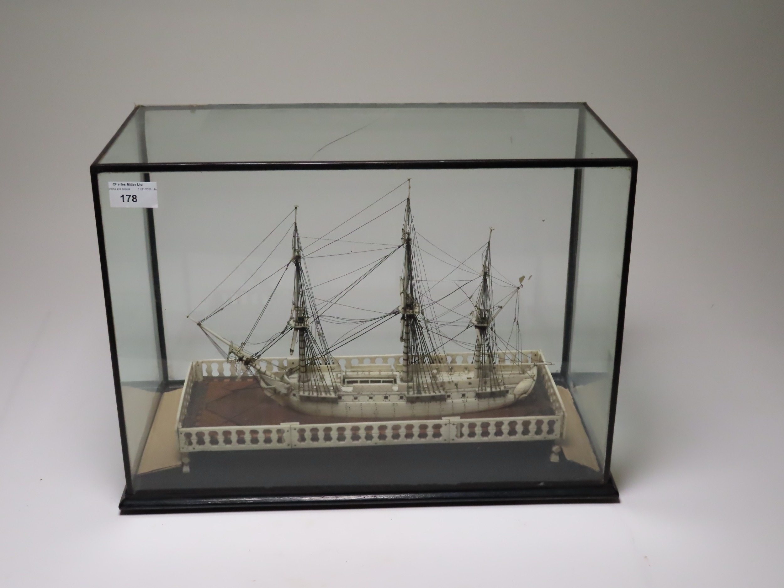 the 9in. planked and pinned hull with simple figurehead and plain stern, planked decks with simple fittings including capstans, scored hammock racks, guns in bone stepped carriages, bound masts with yards, s'tun'sl booms, standing and running rigging, set in straw-work waterline mount with anchor devices to each corner and bow cables tied under, fret-cut balustrade surround and bone feet, contained in later glazed case, overall -- 13 x 18 x 9in. (33 x 46 x 23cm.)