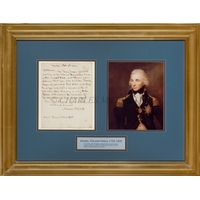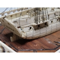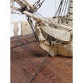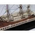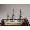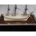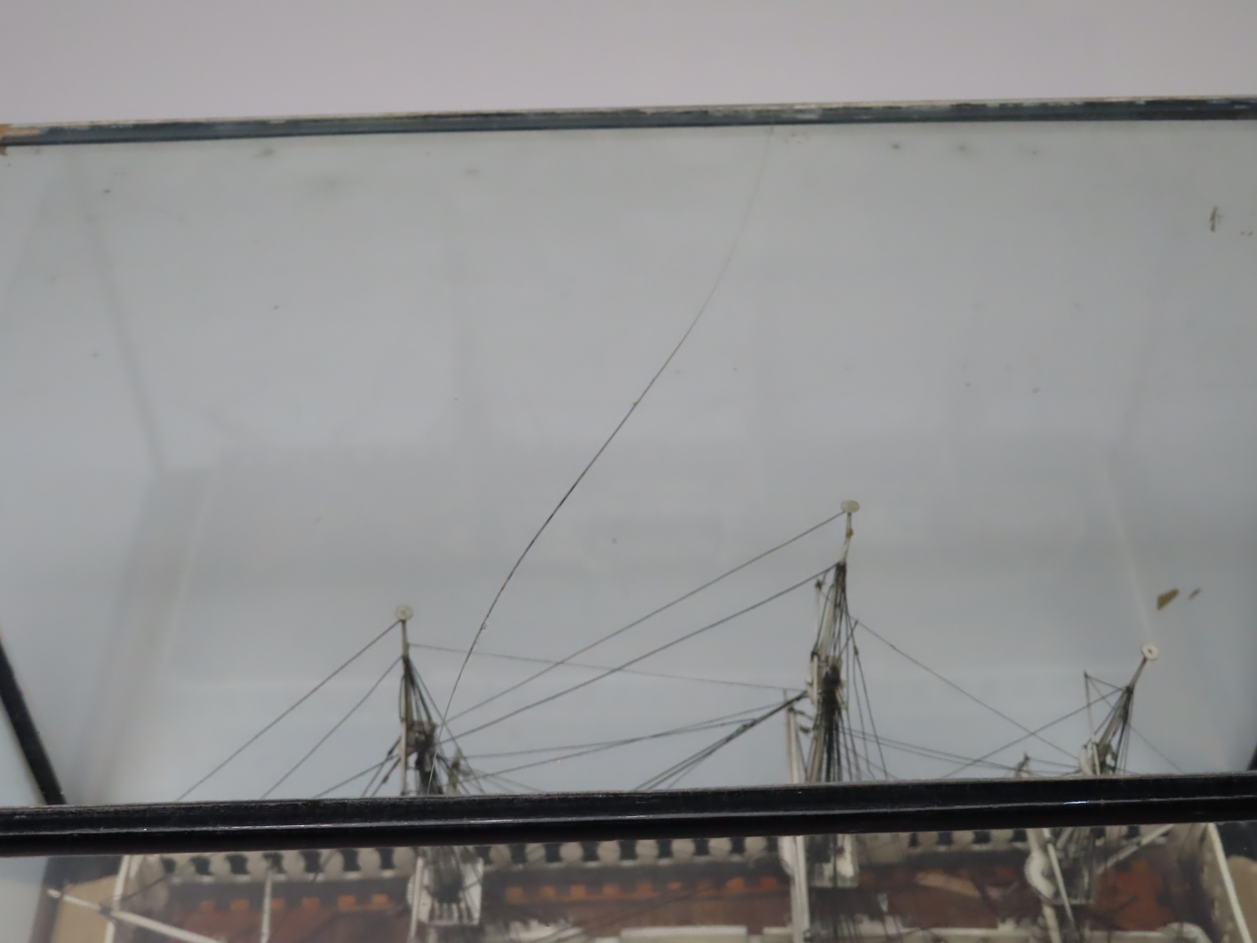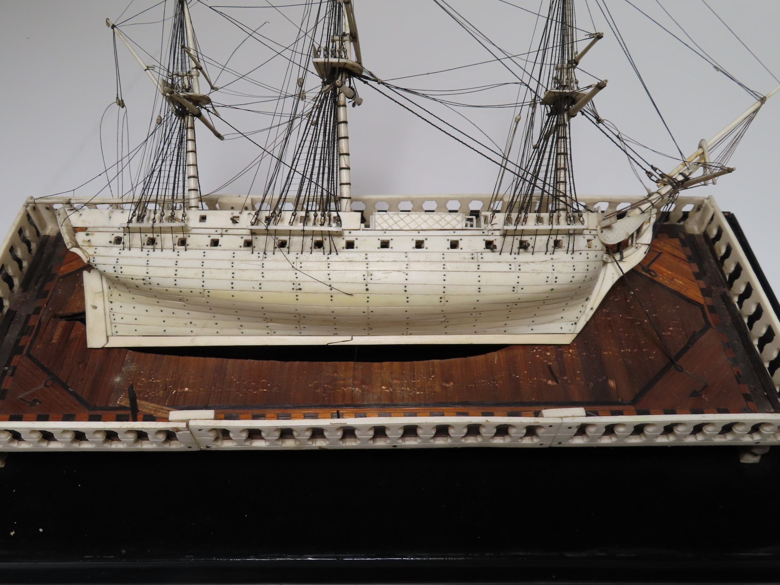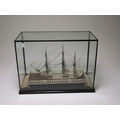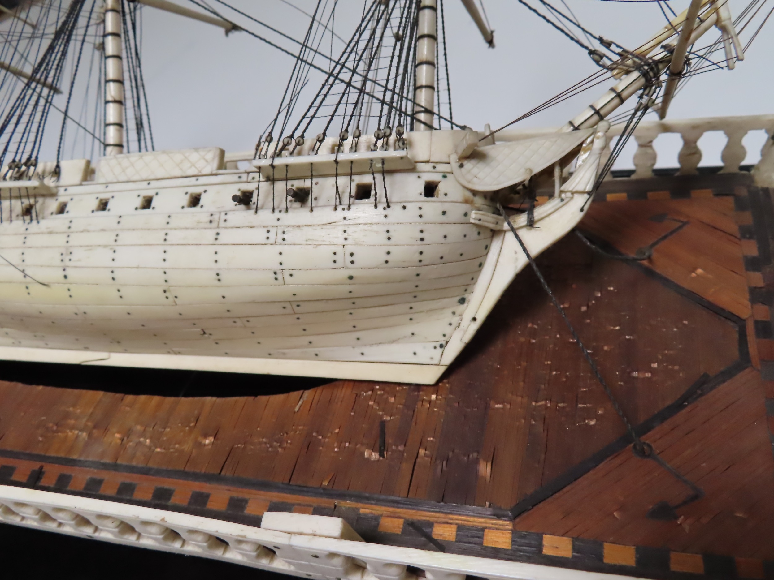 the 9in. planked and pinned hull with simple figurehead and plain stern, planked decks with simple fittings including capstans, scored hammock racks, guns in bone stepped carriages, bound masts with yards, s'tun'sl booms, standing and running rigging, set in straw-work waterline mount with anchor devices to each corner and bow cables tied under, fret-cut balustrade surround and bone feet, contained in later glazed case, overall -- 13 x 18 x 9in. (33 x 46 x 23cm.)