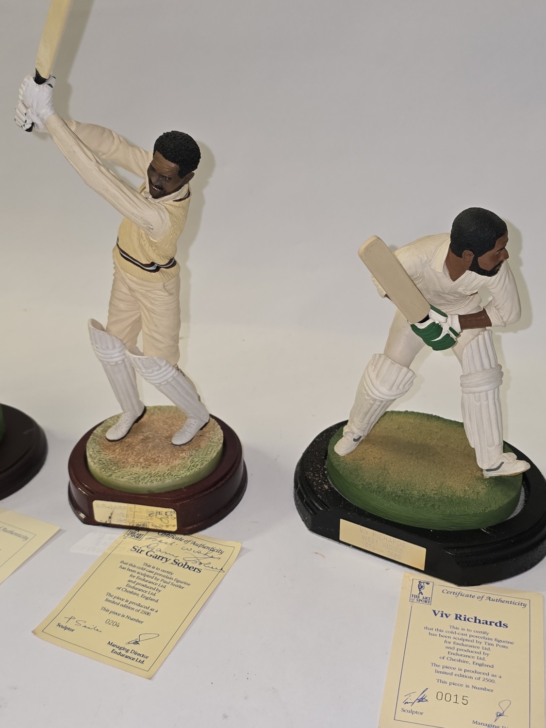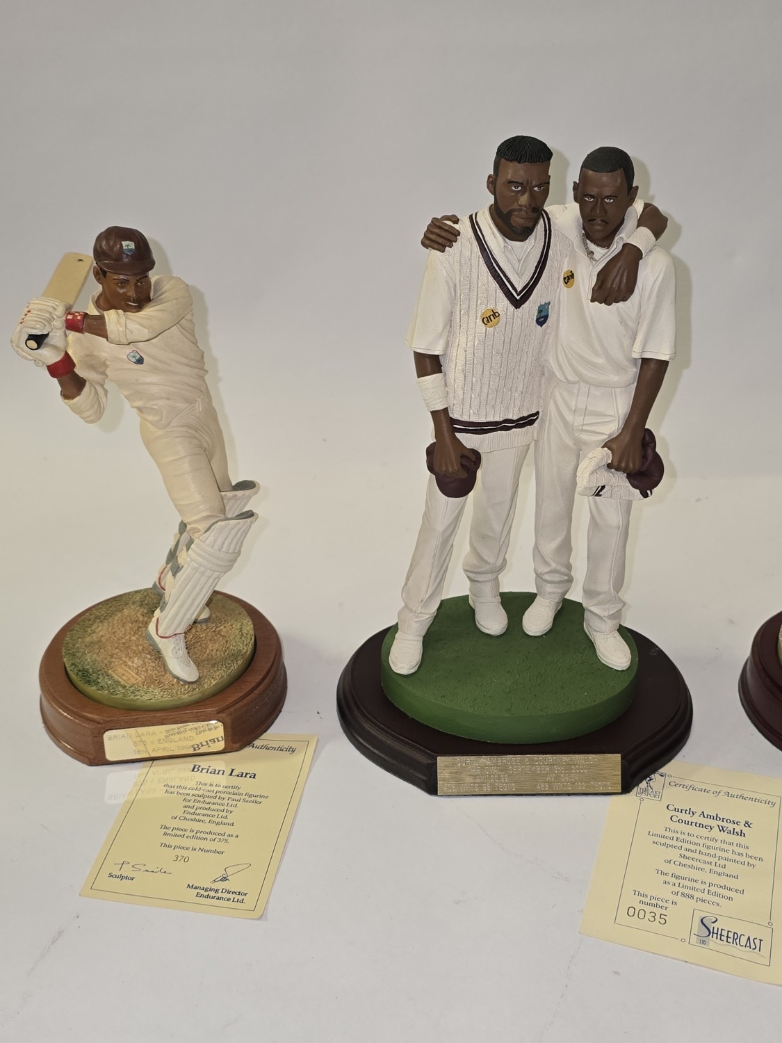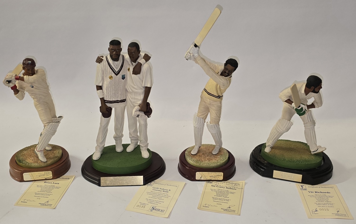 The Art of Sport collection of 4 x limited edition cold-cast porcelain cricketer figurines to include Viv Richards (15/2500), Sir Gary Sobers - Signed certificate (204/2500), Curtly Ambrose & Courtney Walsh (35/888) and Brian Lara (370/375). All come with certificates.