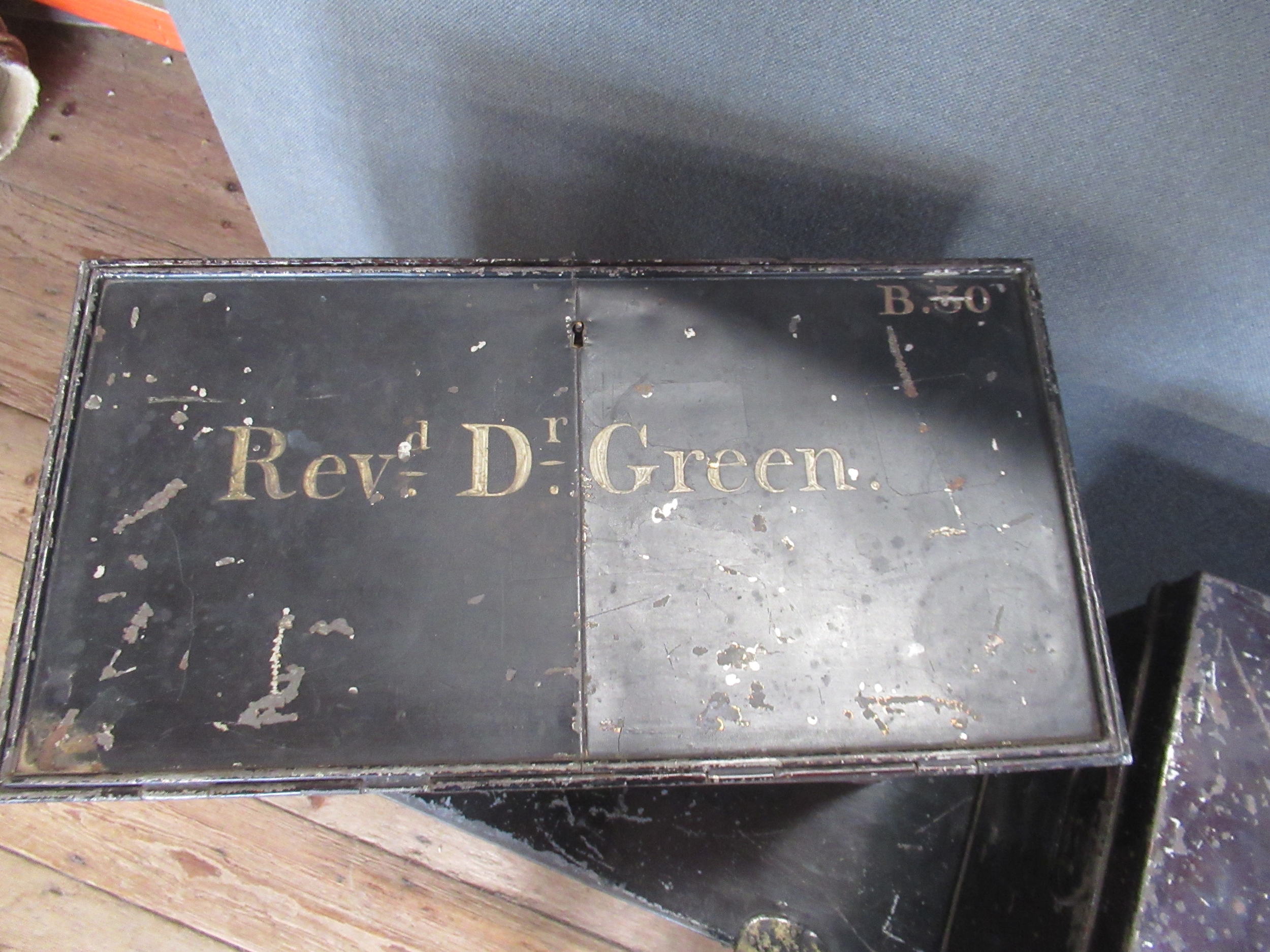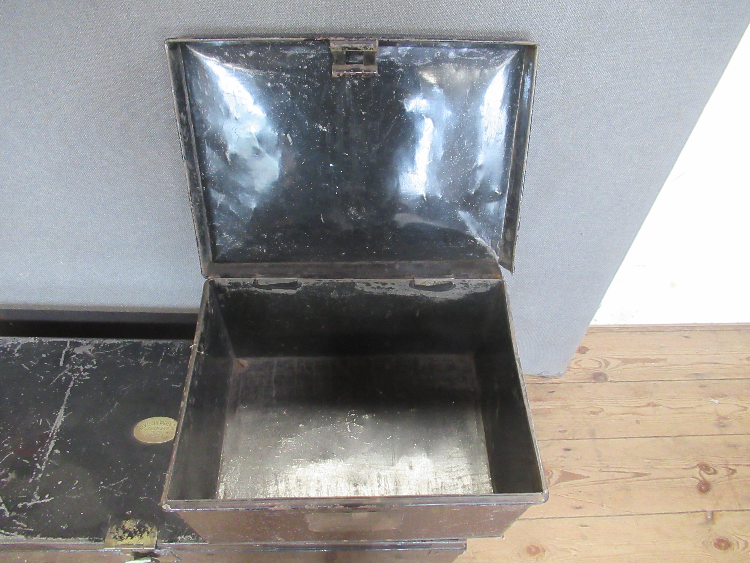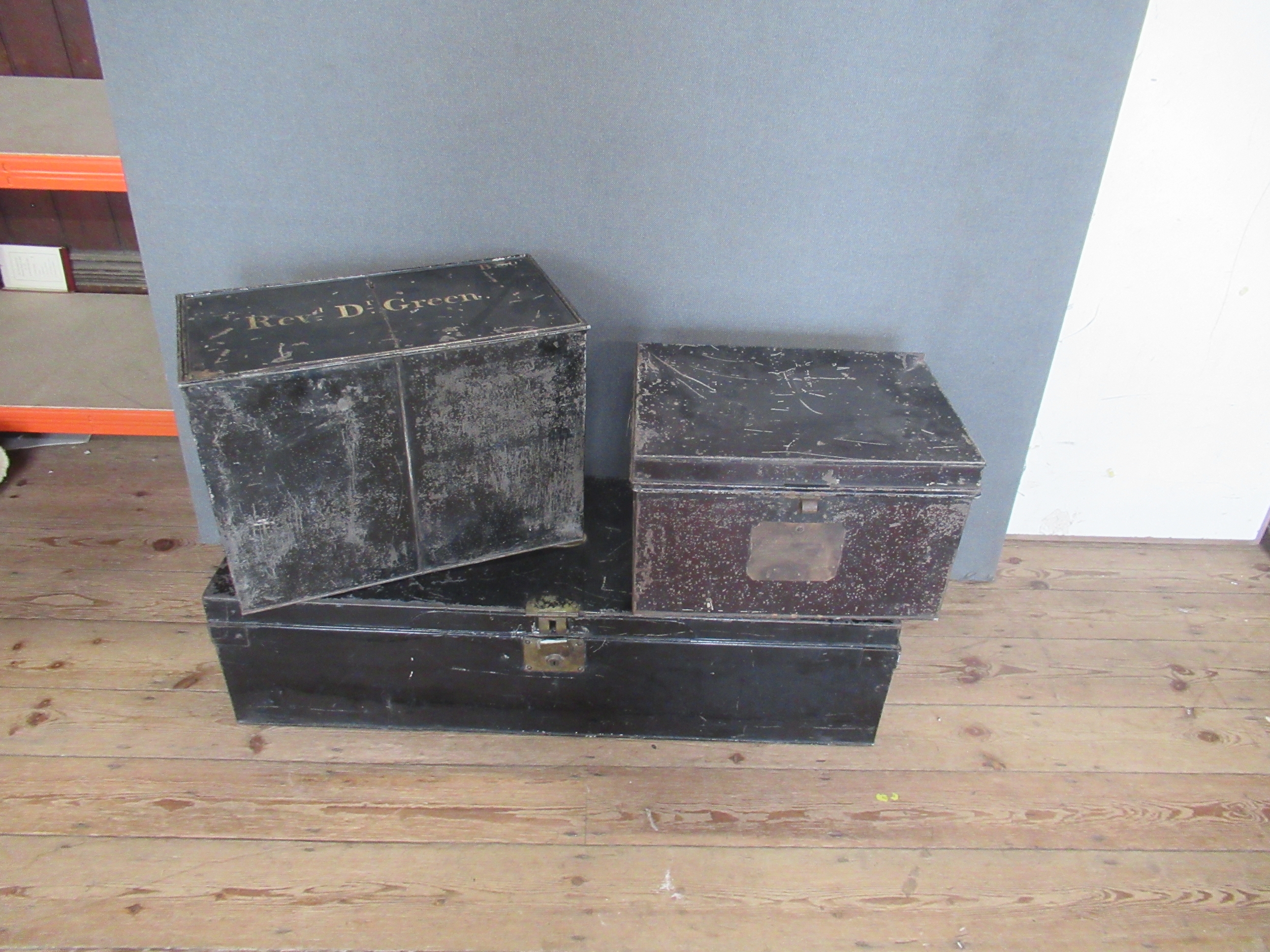 Three vintage tin trunks, one with paperwork for Rev. Leslie Walker