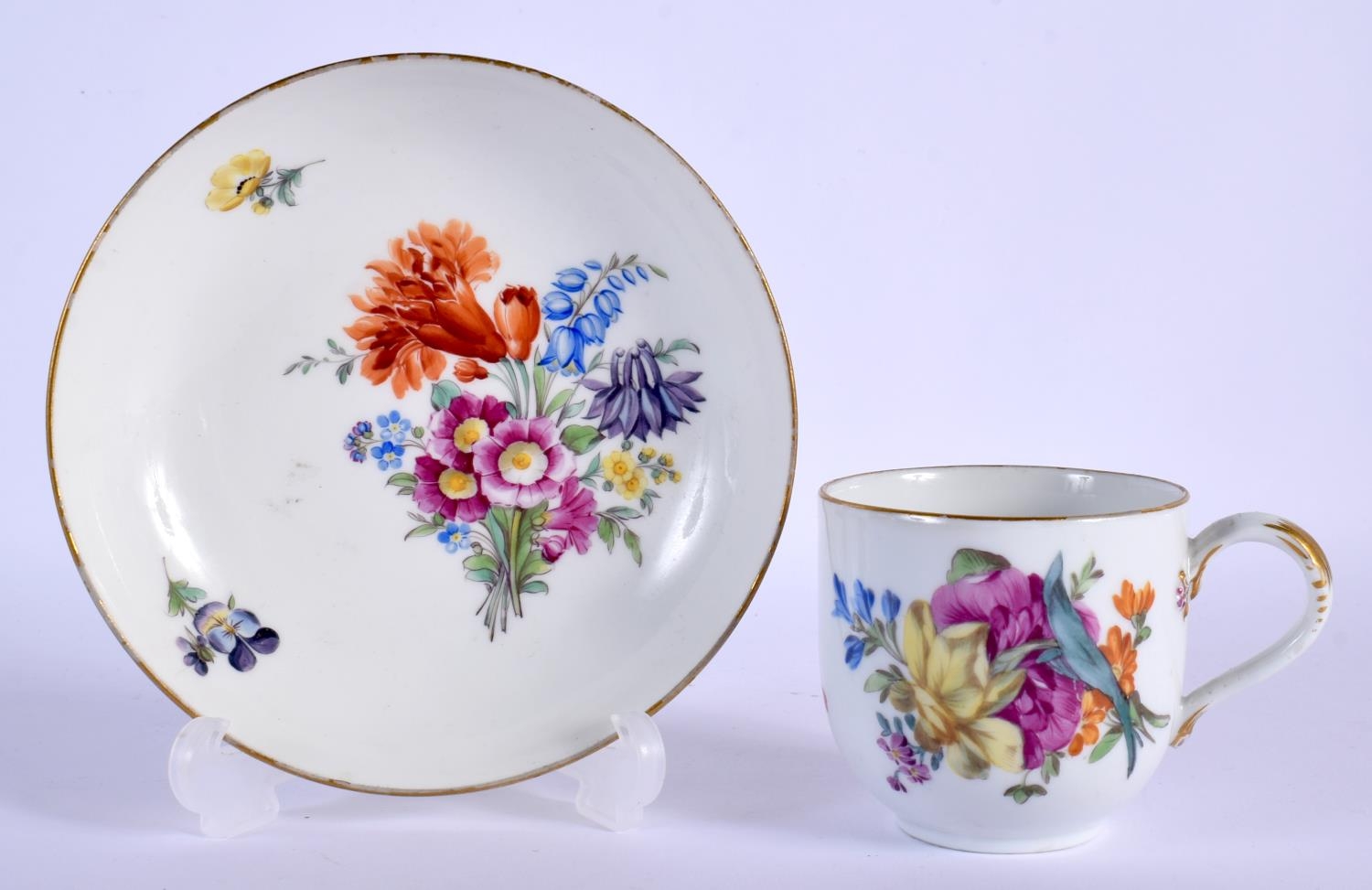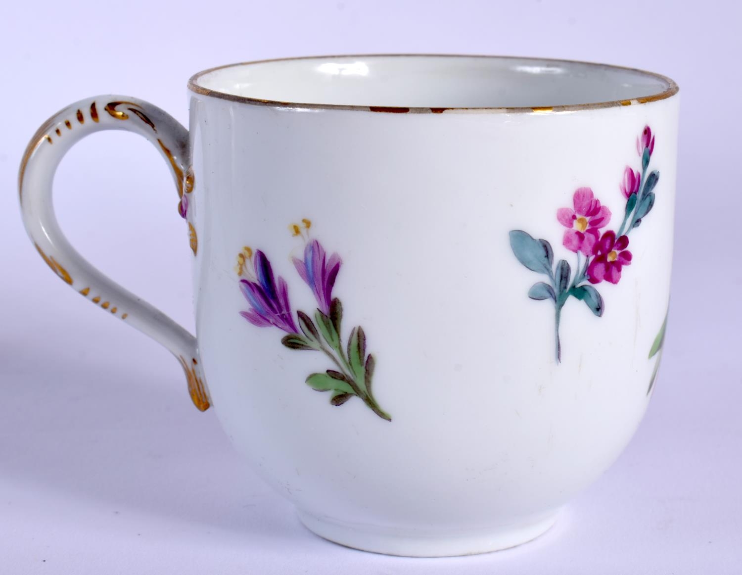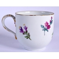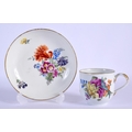 18TH C. MEISSEN MARCOLINI PERIOD CUP AND SAUCER PAINTED WITH FLOWERS, CROSSED SWORDS STAR IN BLUE Cup 6.5cm High Saucer 13.5cm Diameter (2)